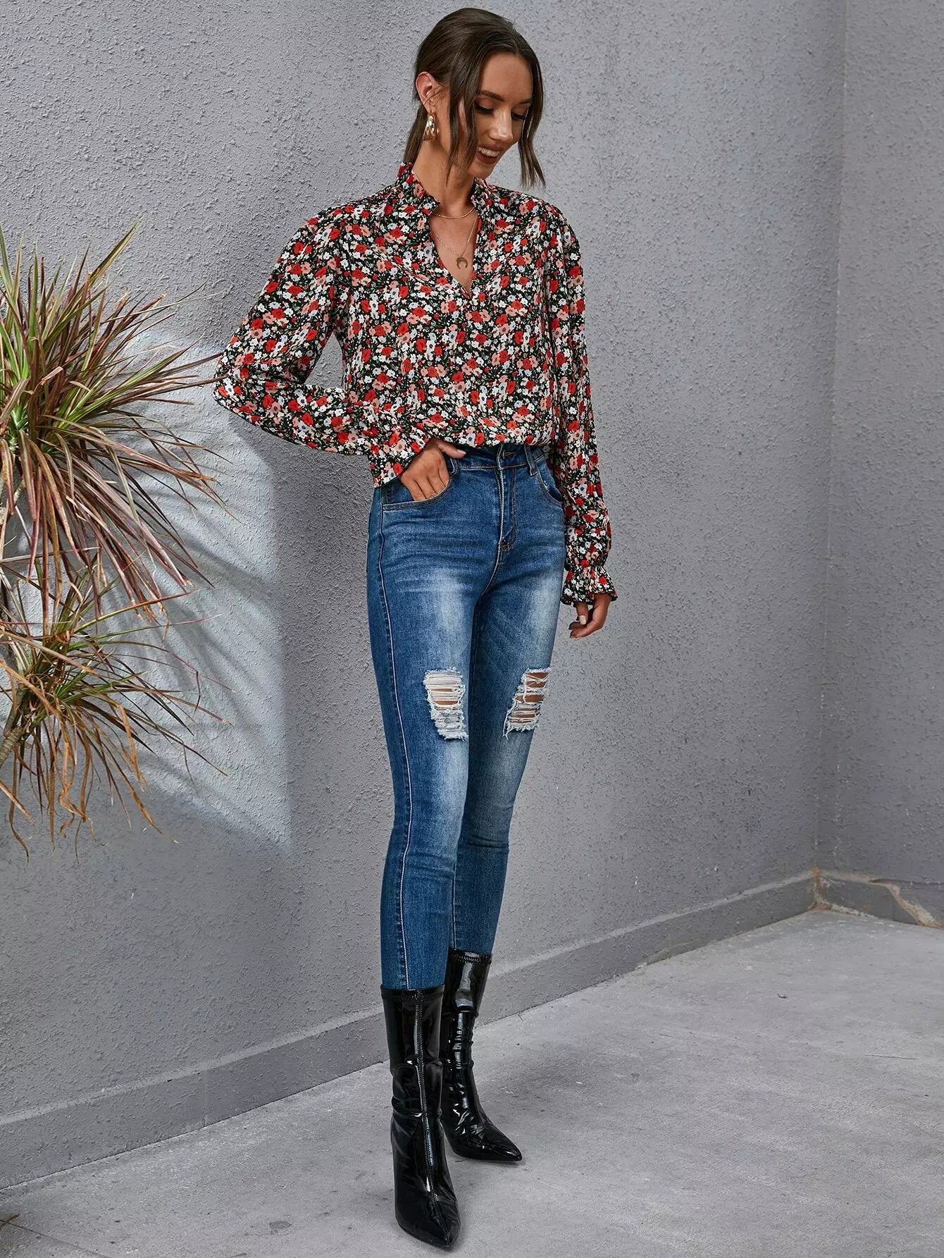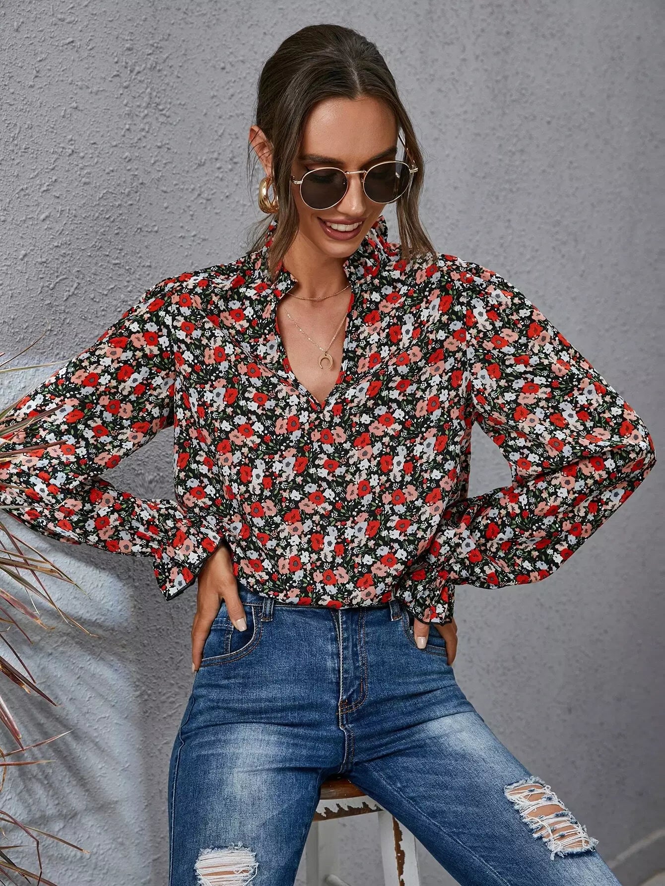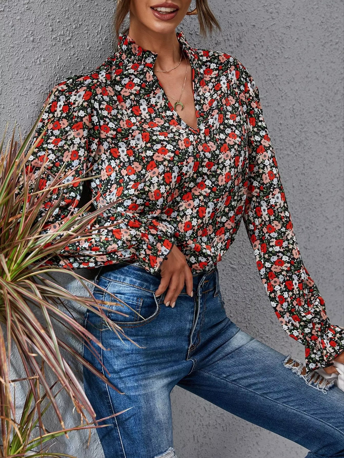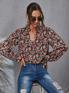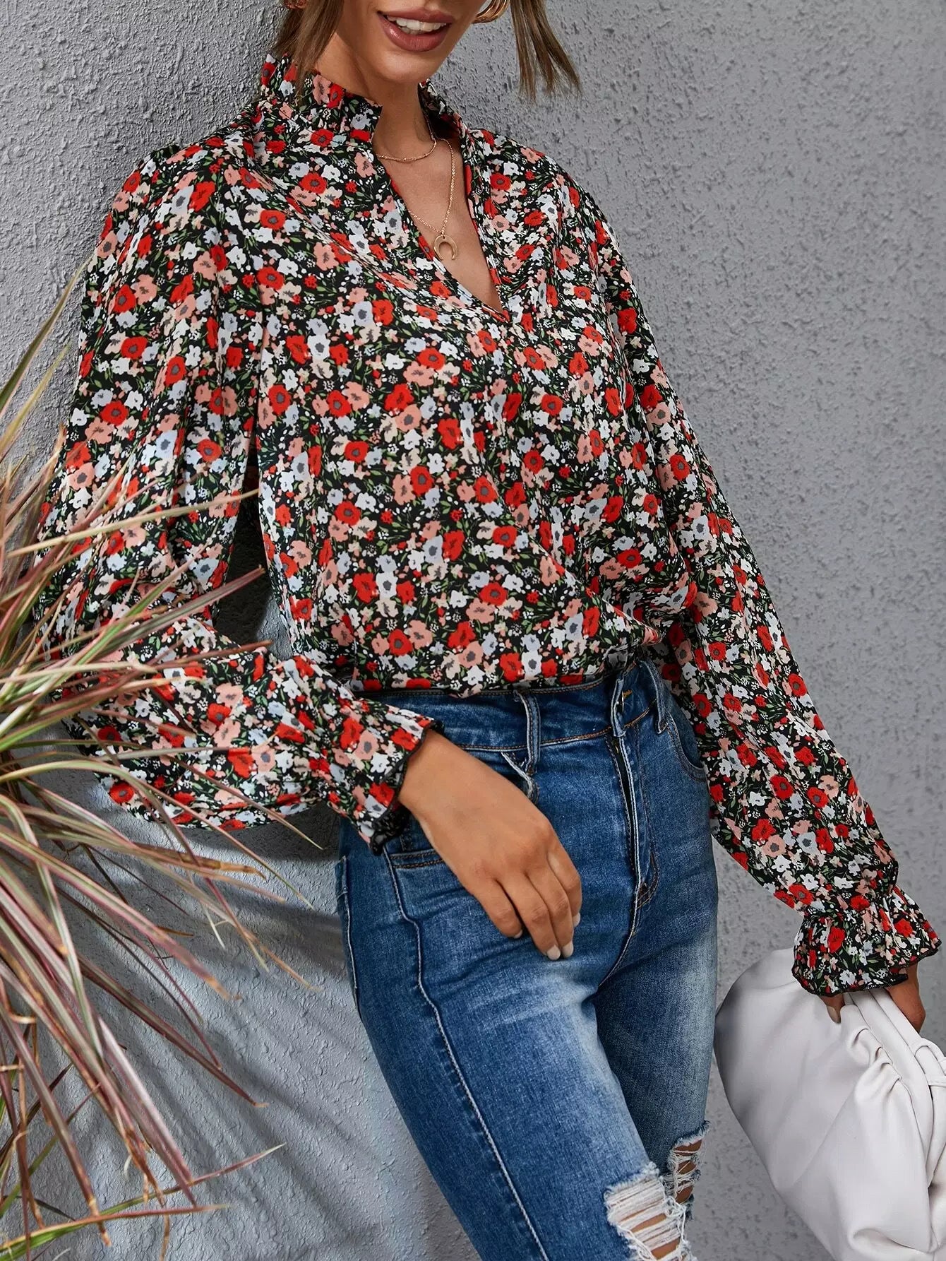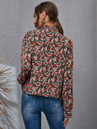 بلوزة برقبة زهرية ذات أكمام منفوشة بفتحة رقبة زهرية