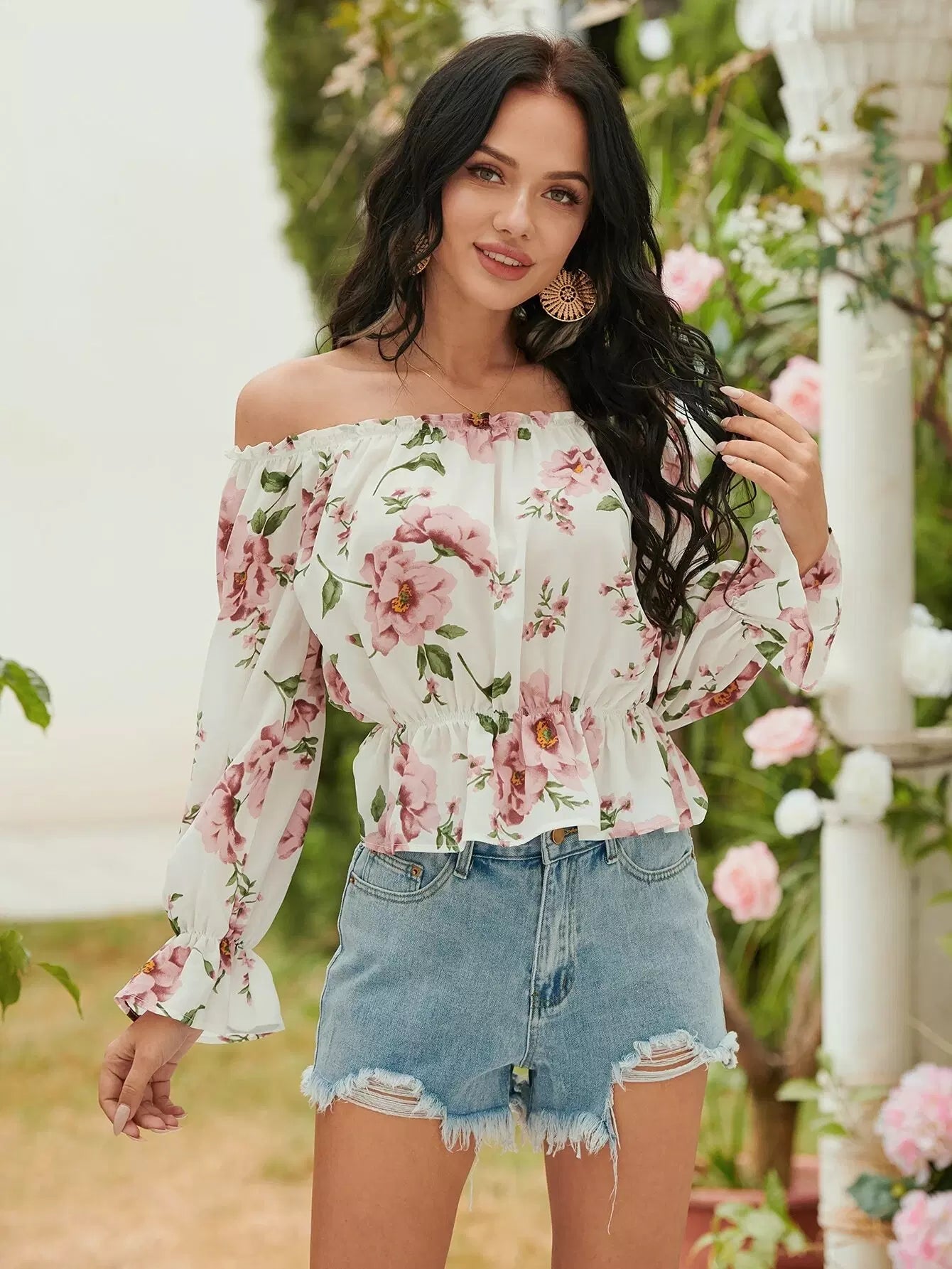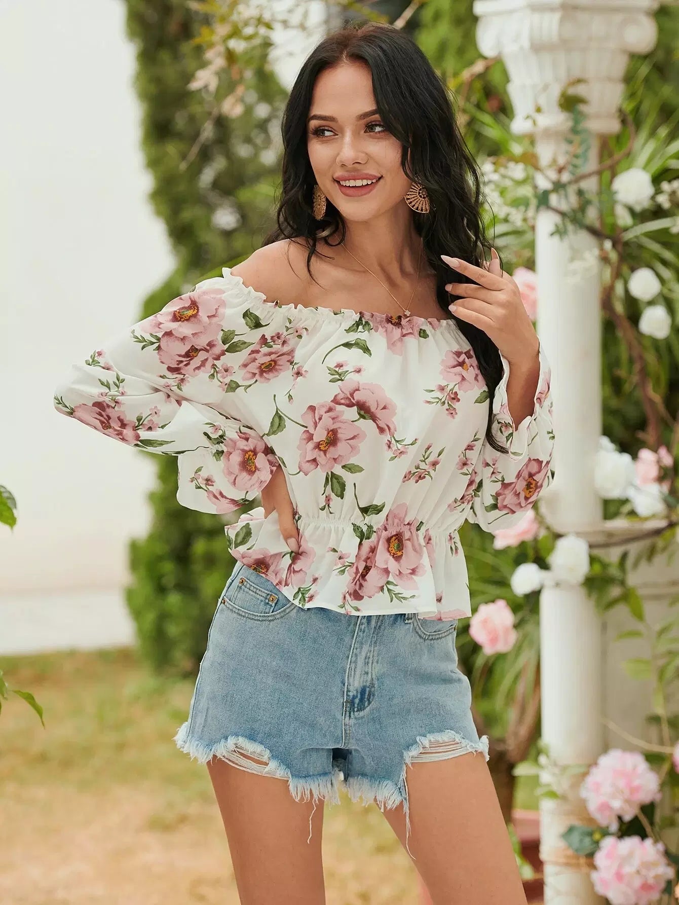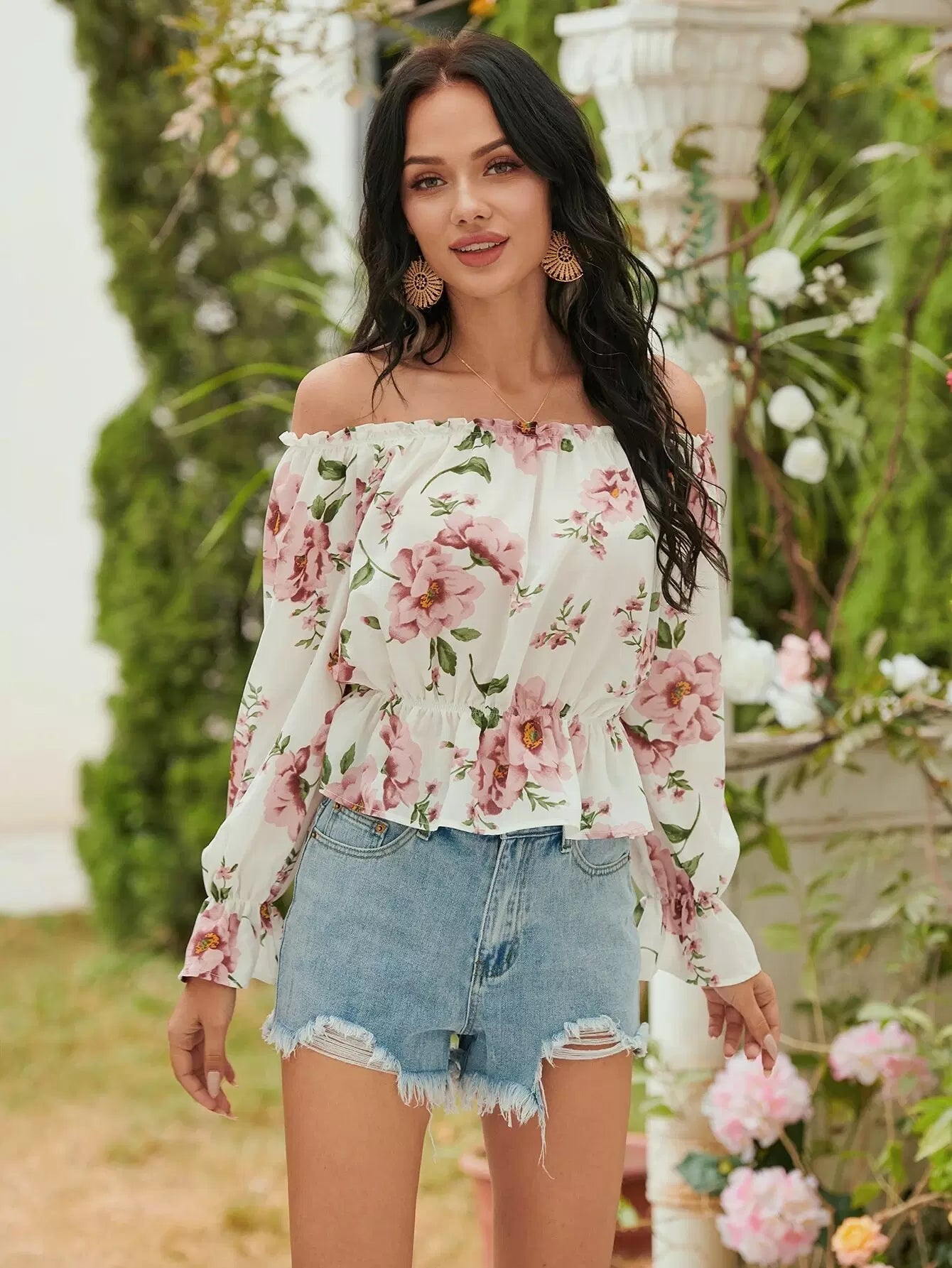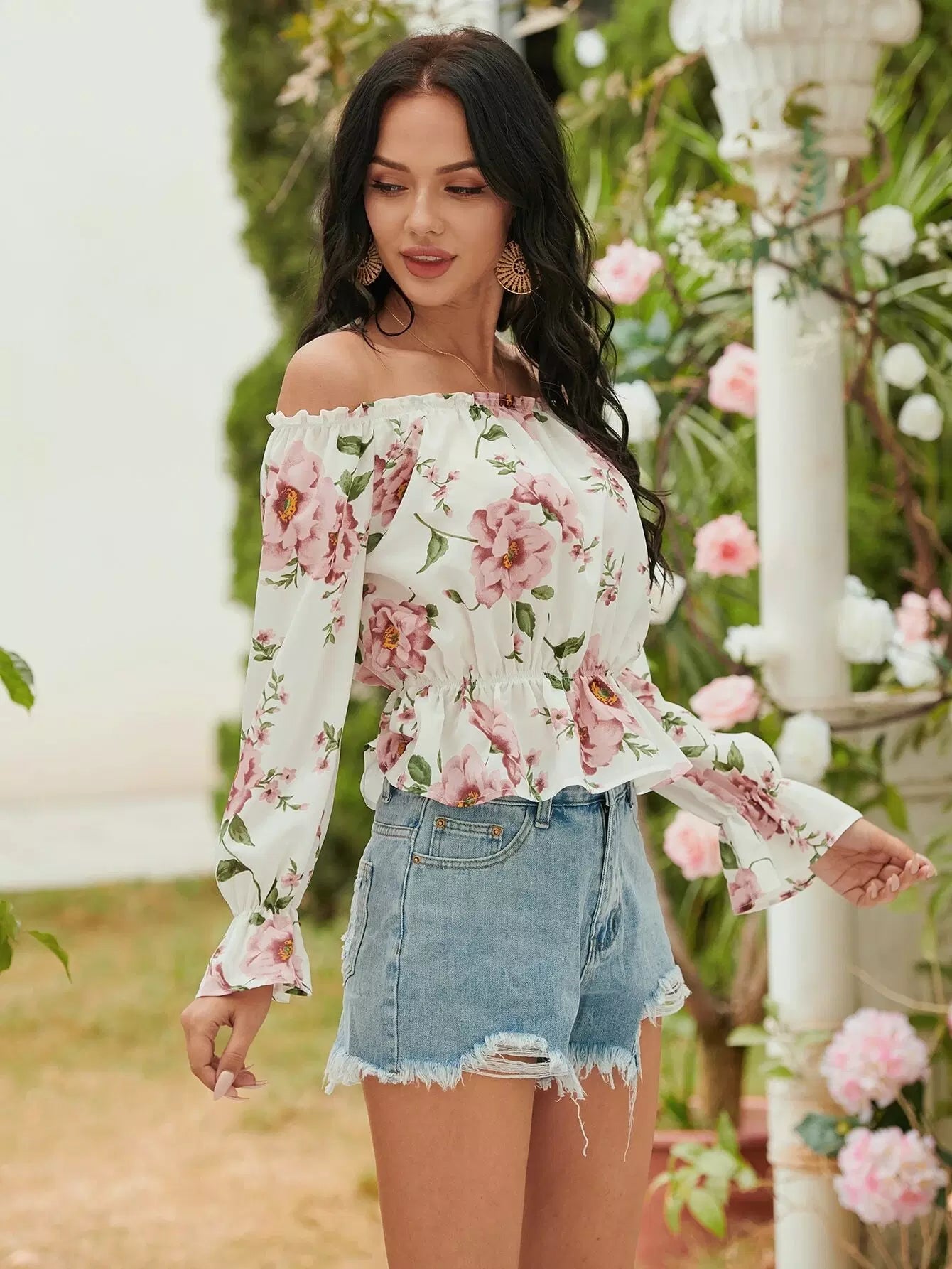 بلوزة بيبلوم على الكتفين مزينة بالورود