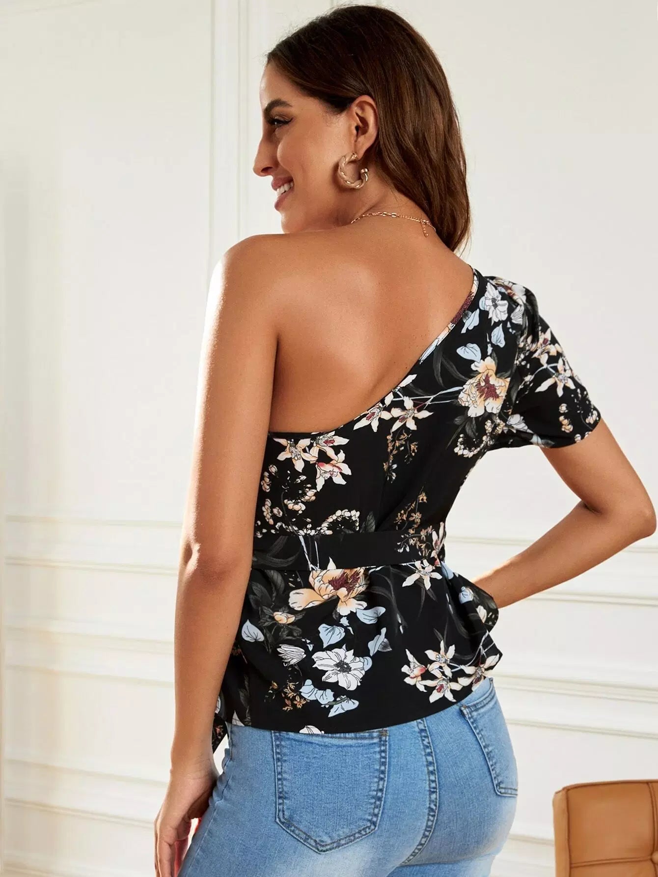 بلوزة بكتف واحد وطبعات زهور بدون حزام