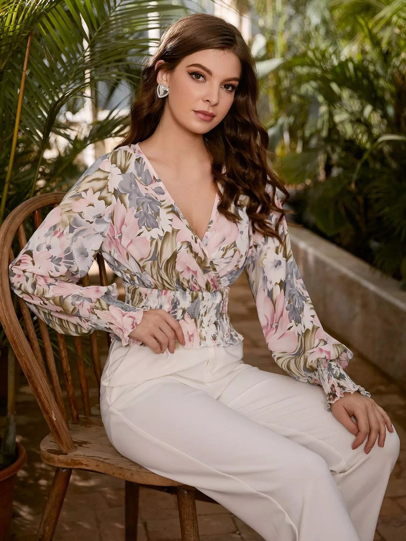 بلوزة بأكمام بنقشة زهور بأكمام شيرد فانوسية