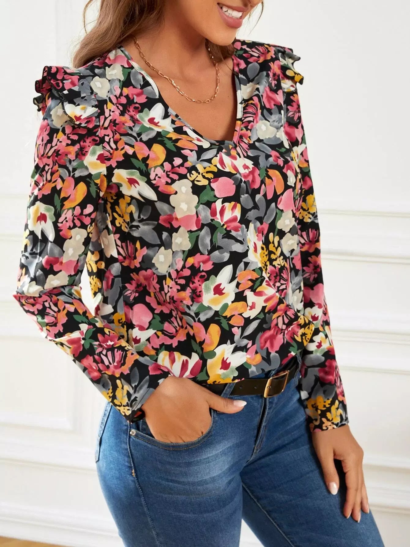 بلوزة بطبعة زهور برقبة على شكل V