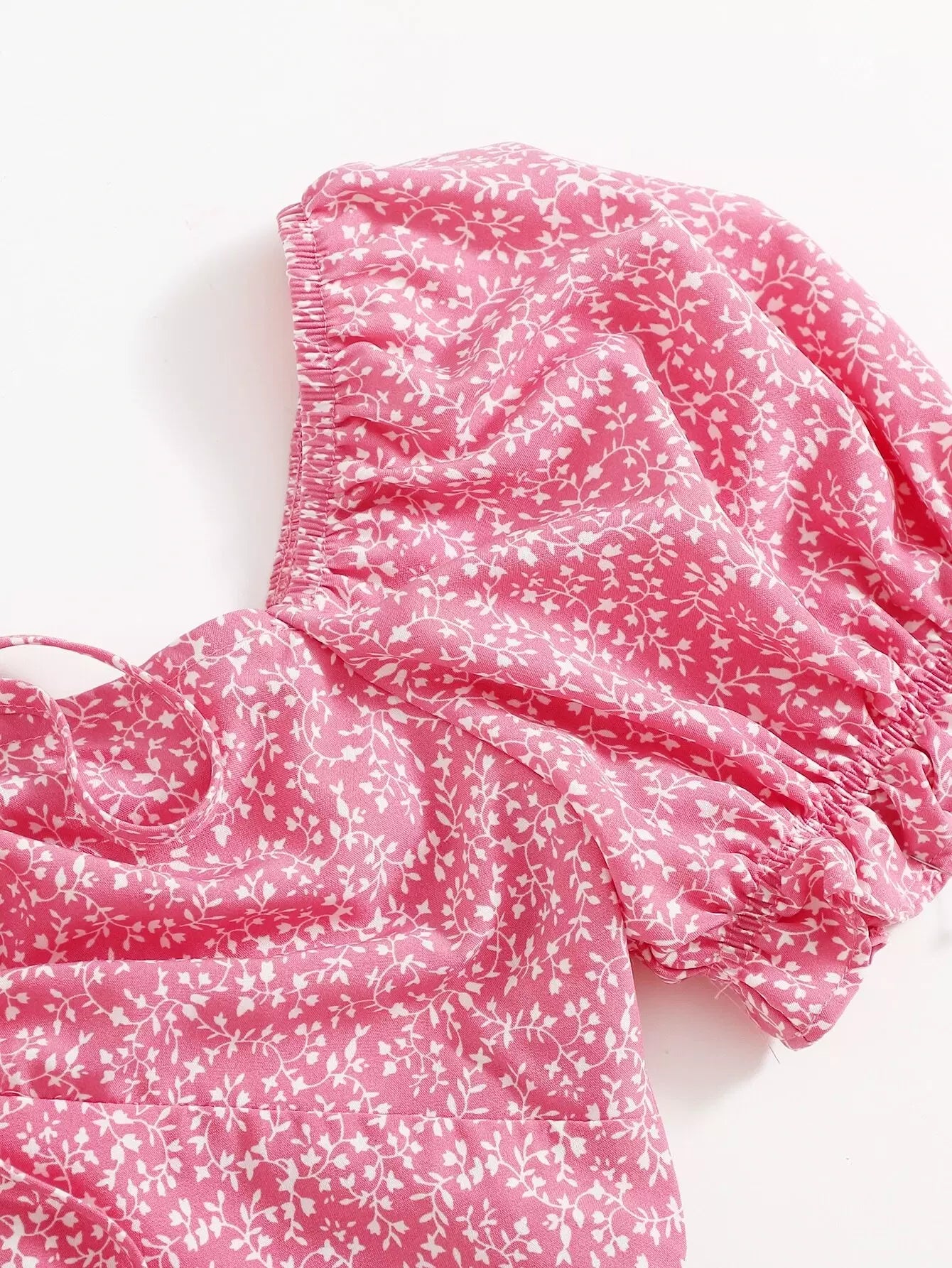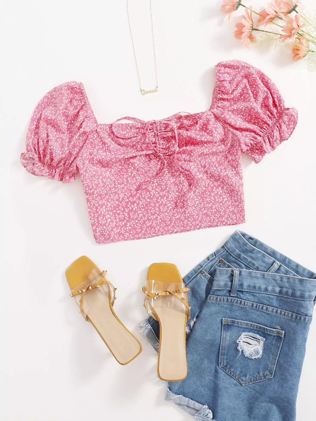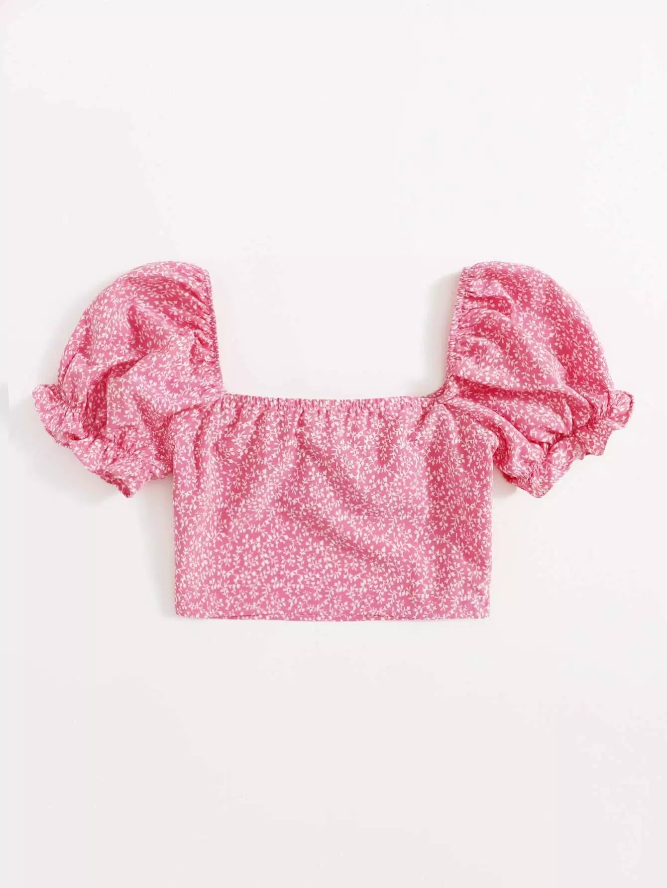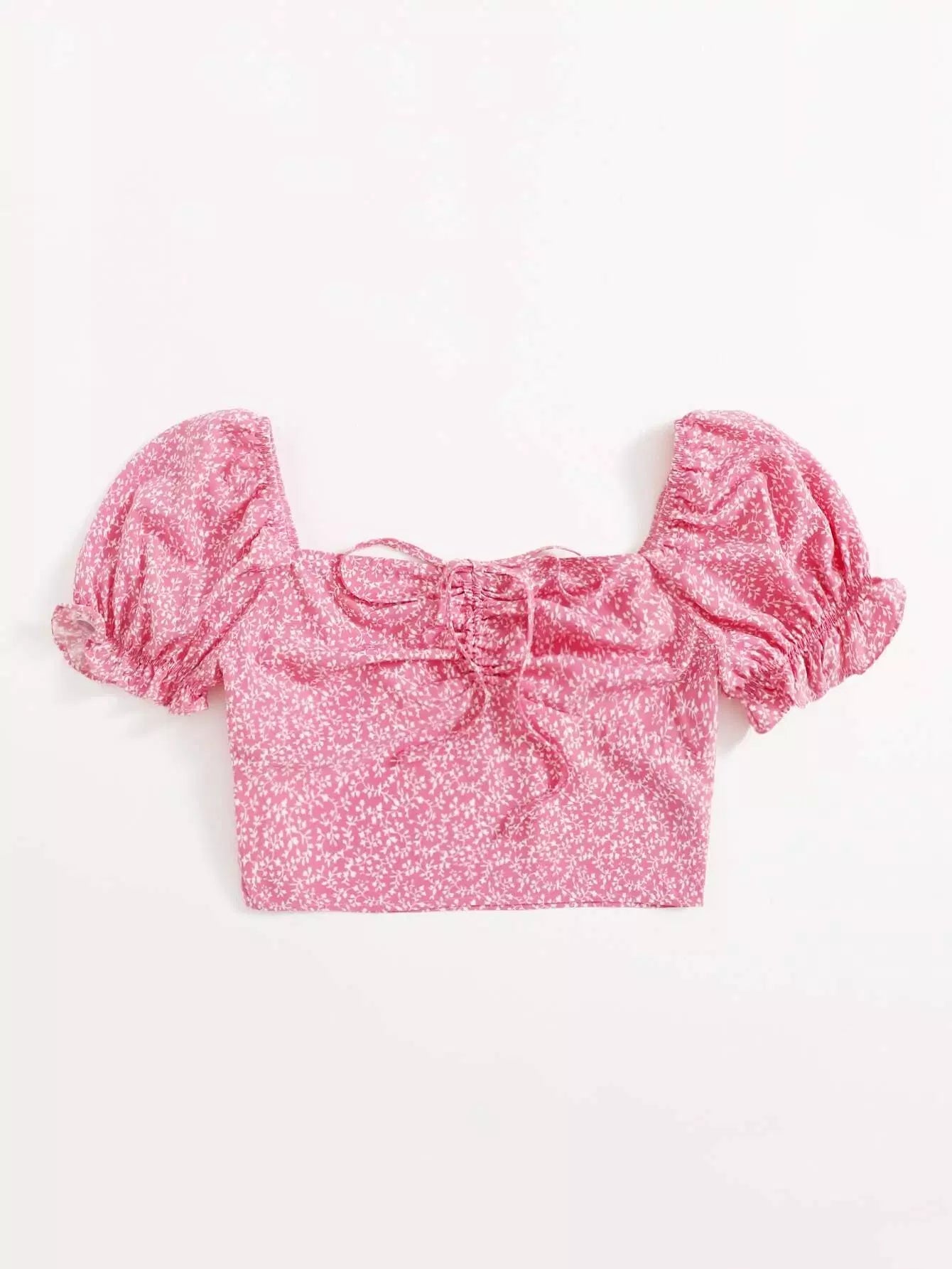 بلوزة قصيرة بأكمام مكشكشة بأكمام منفوشة بعقدة على الصدر مطبوع عليها بالكامل