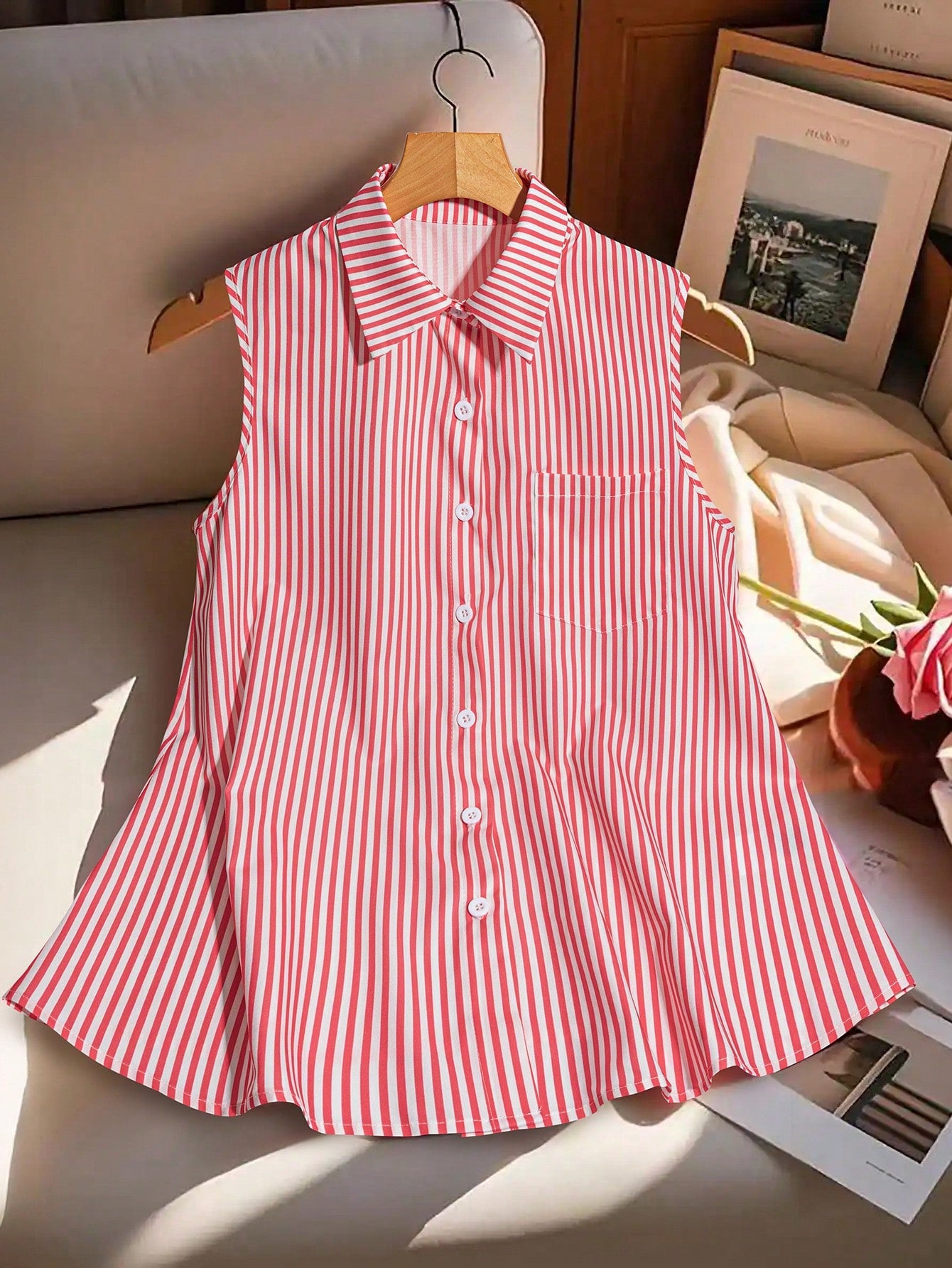 بلوزة نسائية من فرانكليا وردية اللون مخططة بدون أكمام وياقة منسوجة مع جيب، مناسبة للارتداء اليومي