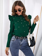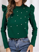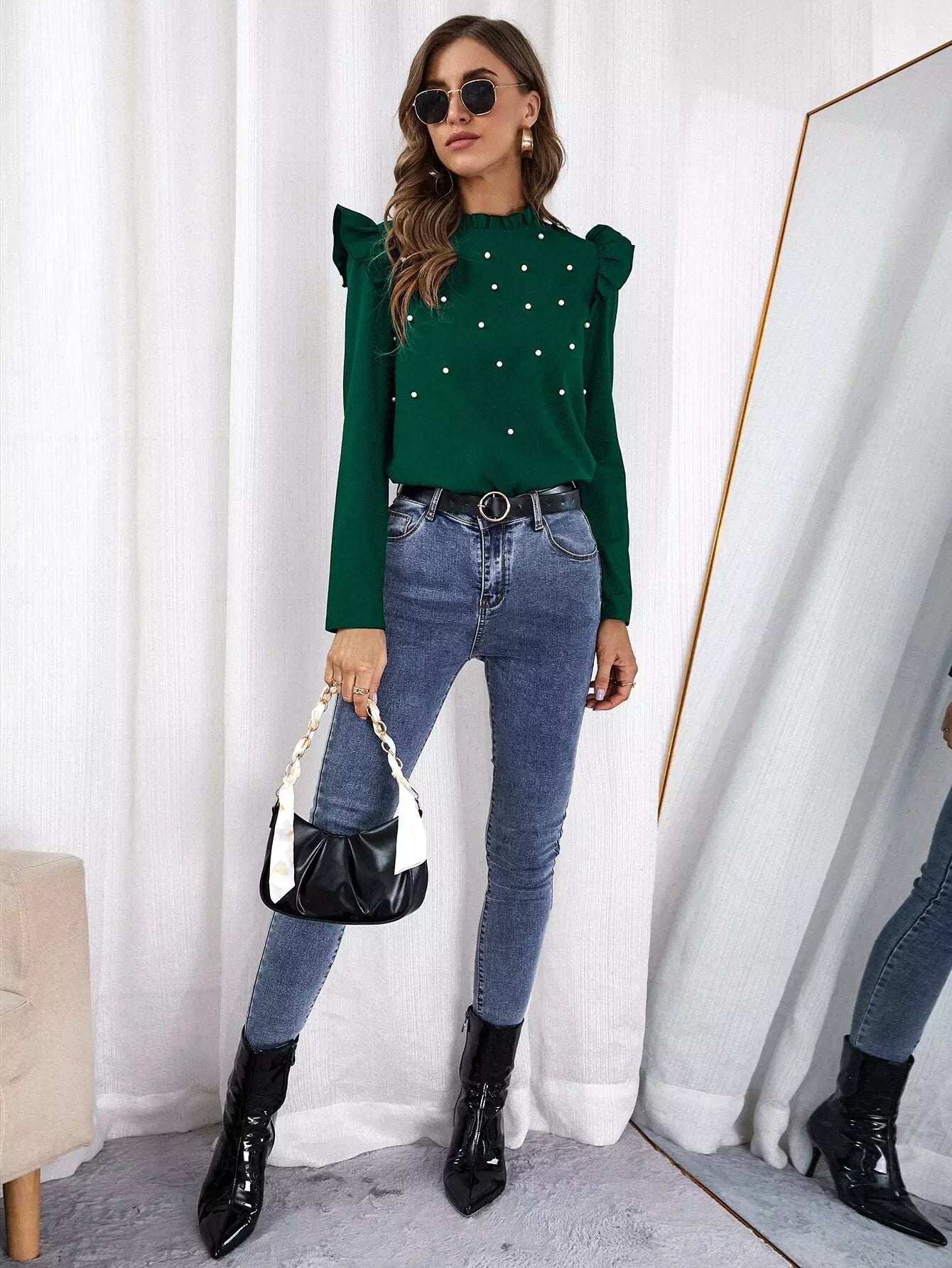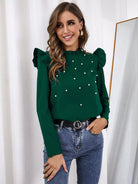 بلوزة كشكش بياقة كشكش مطرزة بالخرز واللؤلؤ