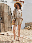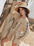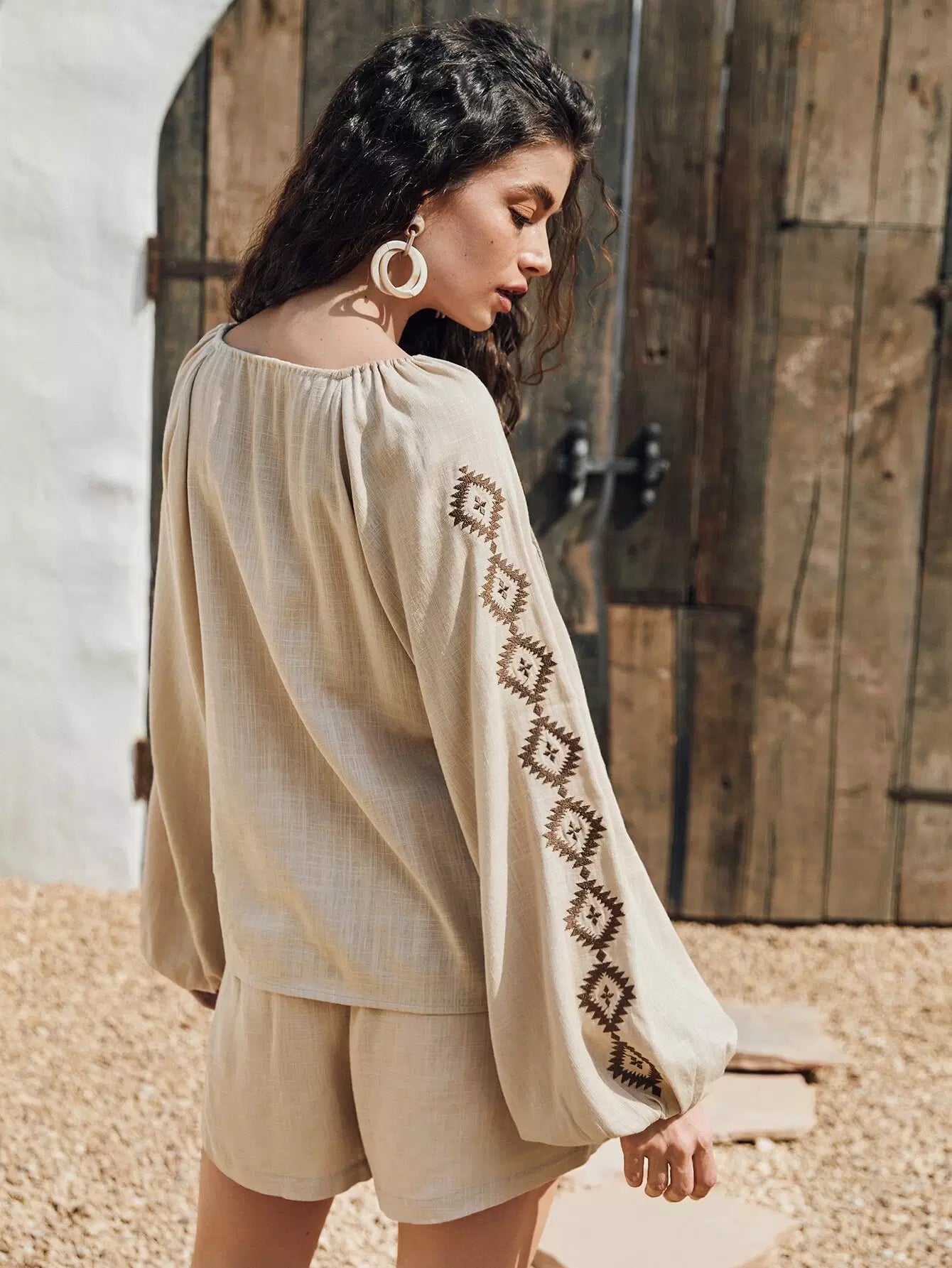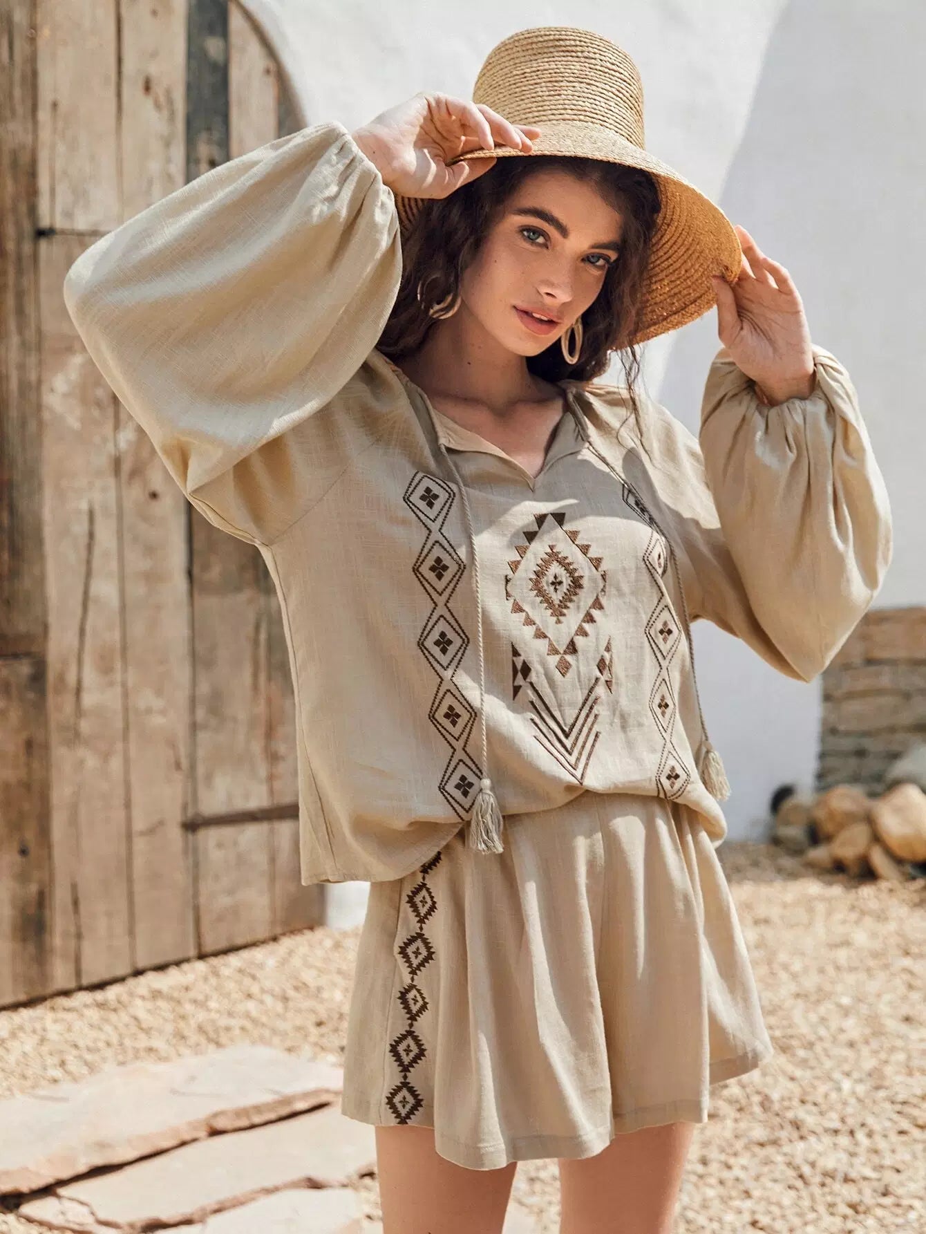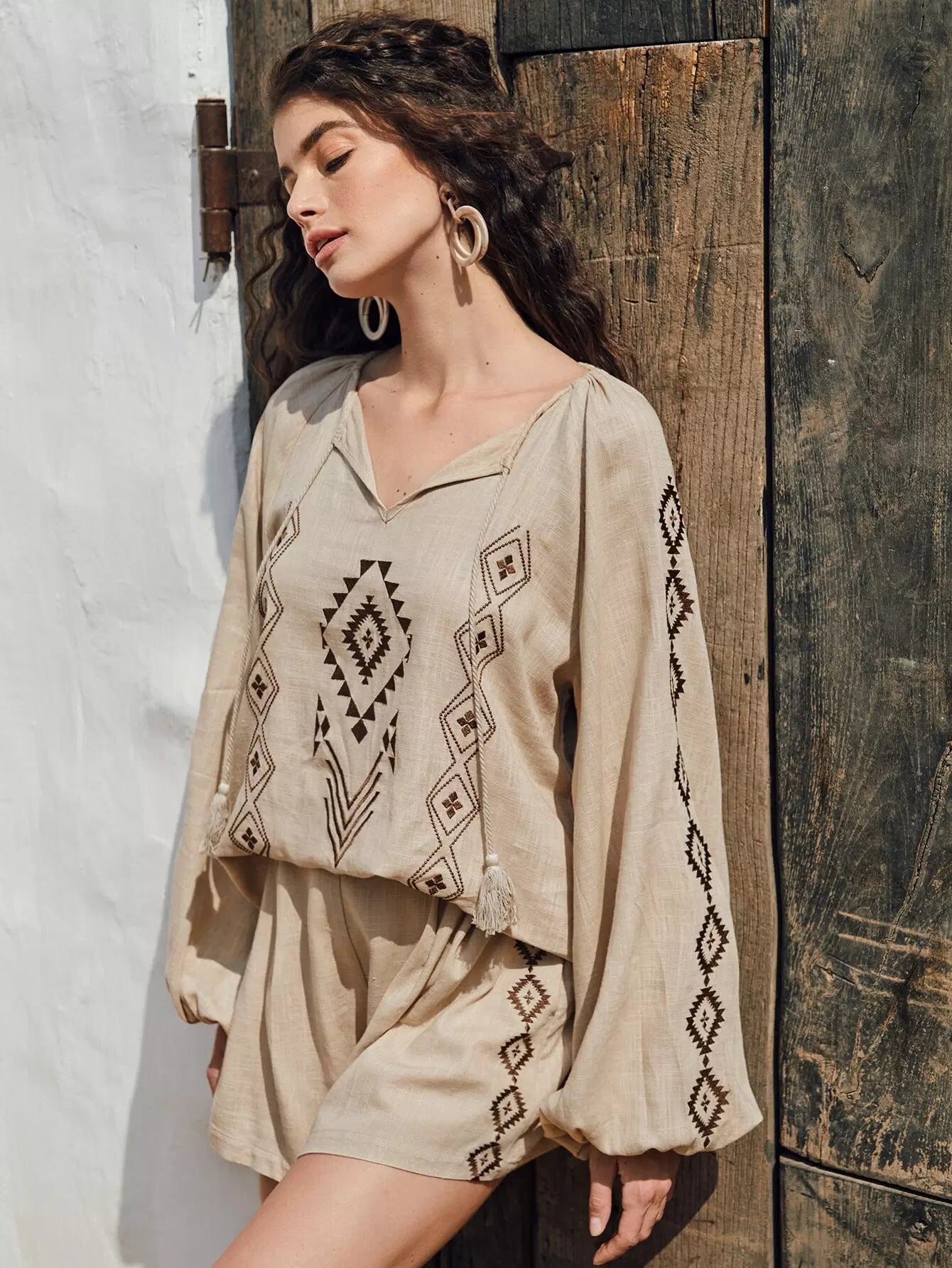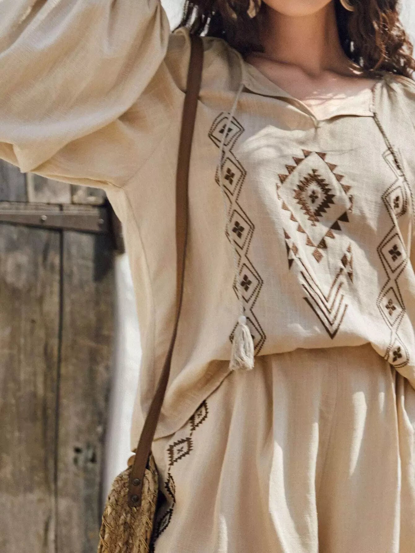بلوزة بأكمام أسقف مطرزة بتطريزات جيو مطرزة بربطة عنق على شكل أسقف