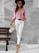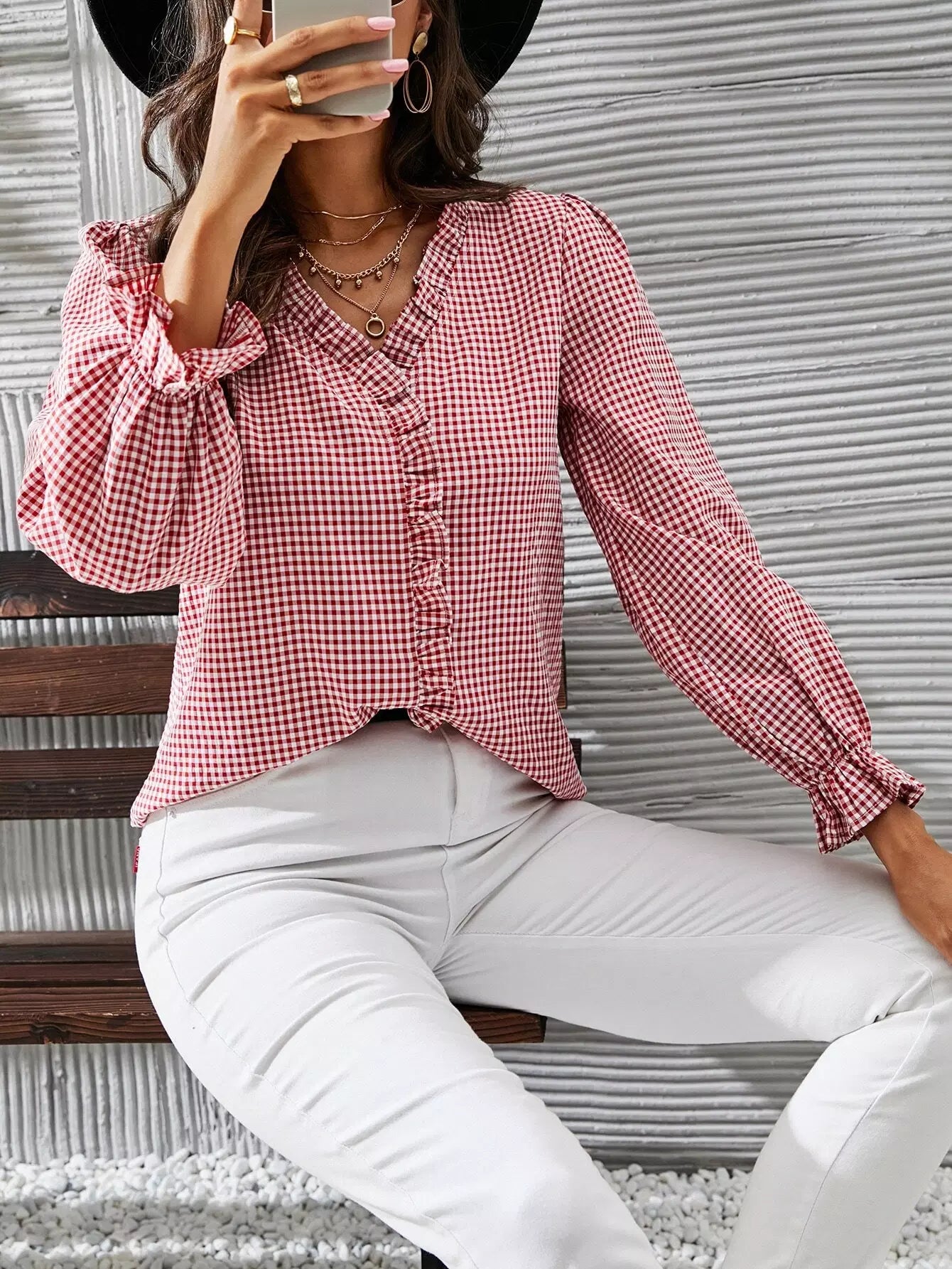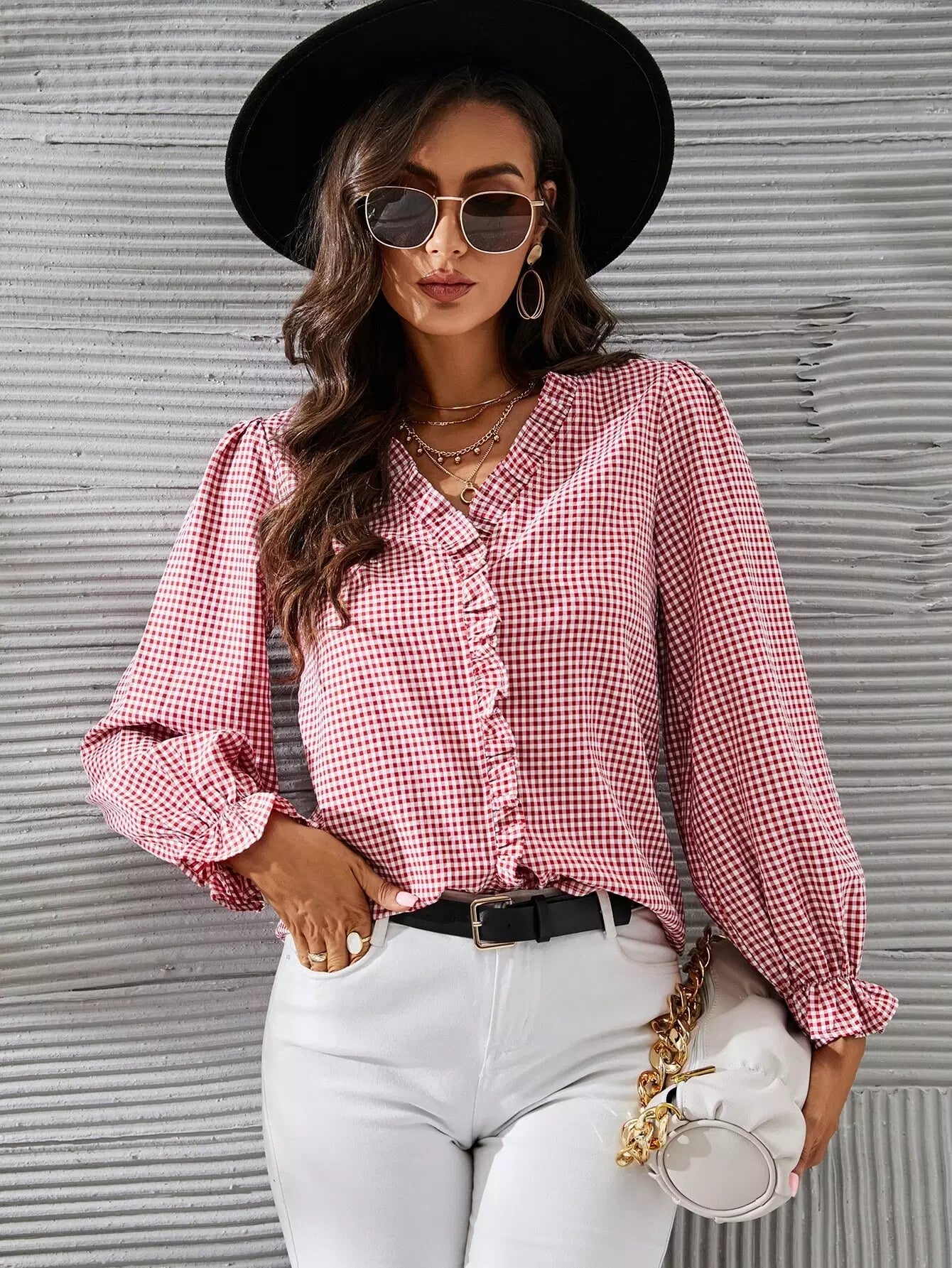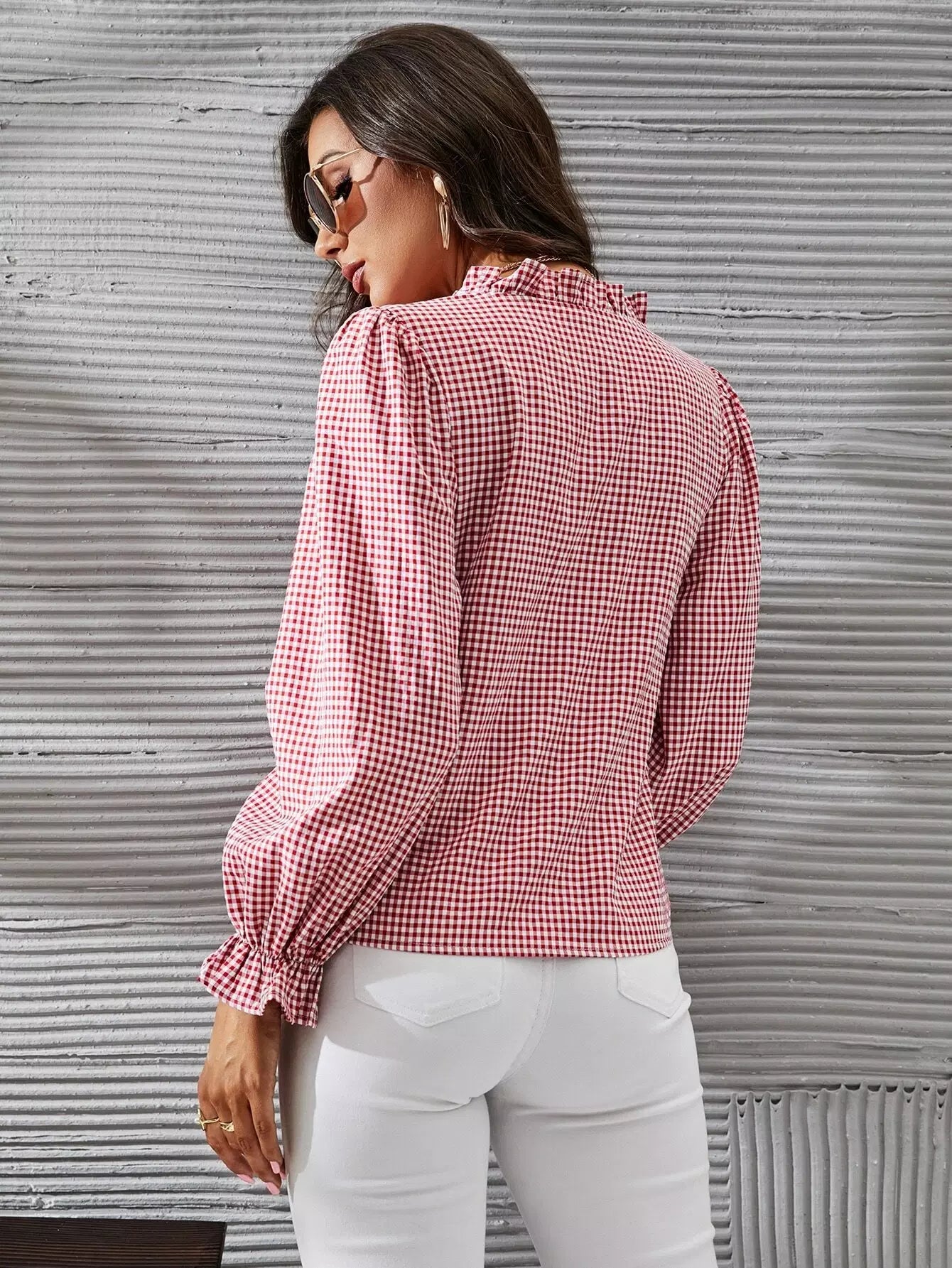 بلوزة بأكمام مكشكشة بطبعة قماش قطني بأكمام مكشكشة