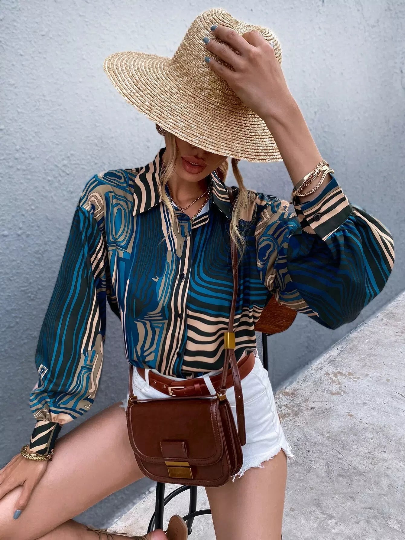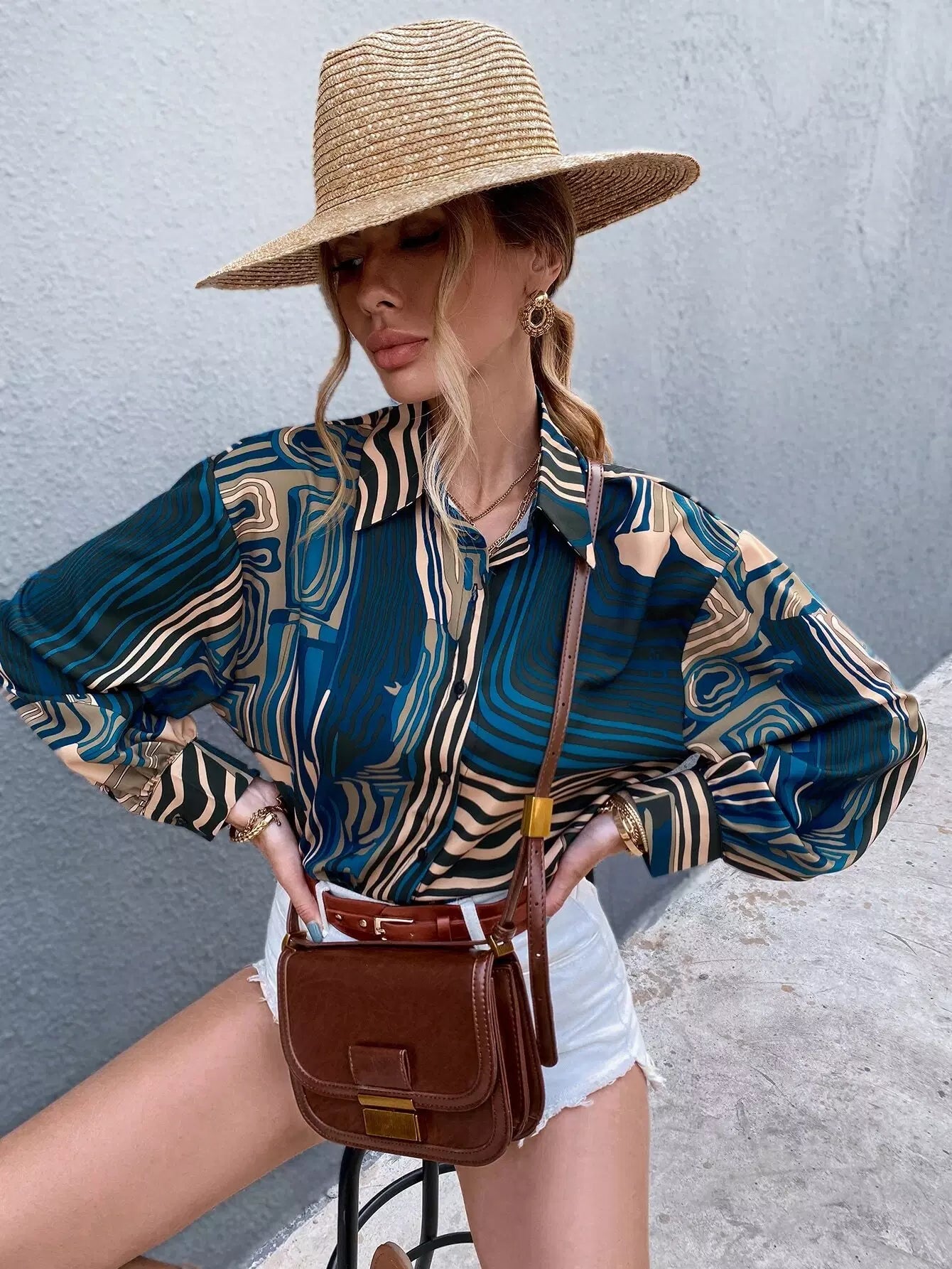 قميص جرافيك بأزرار بأزرار طويلة