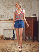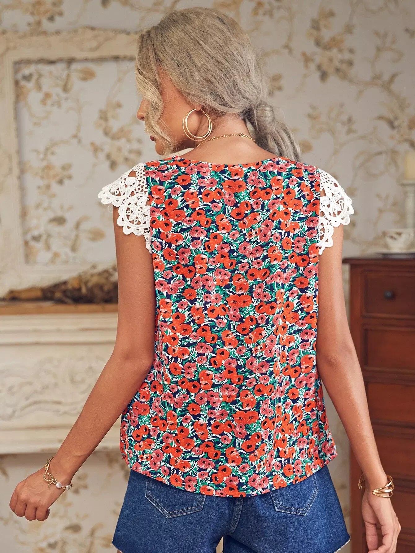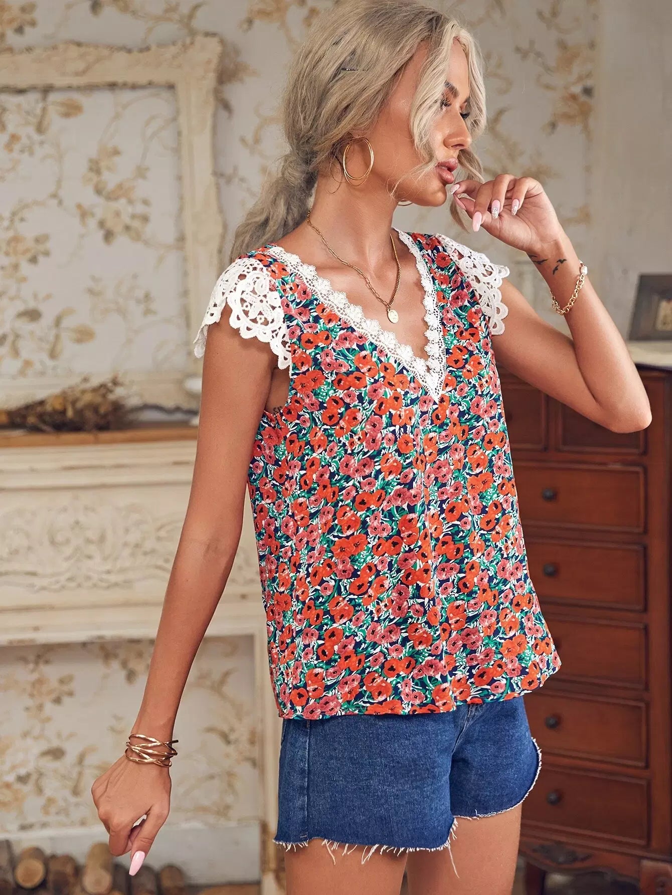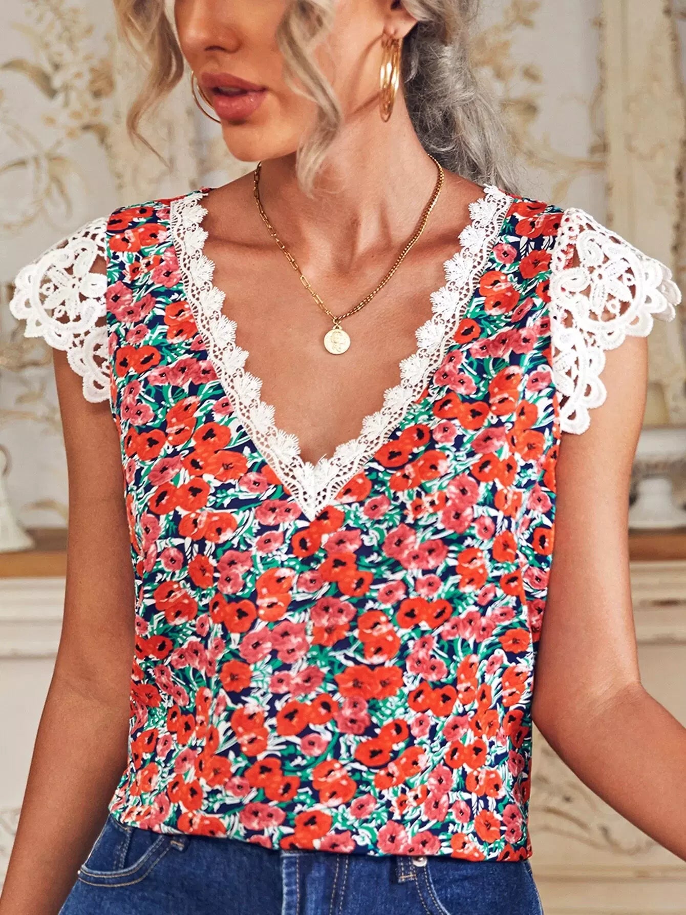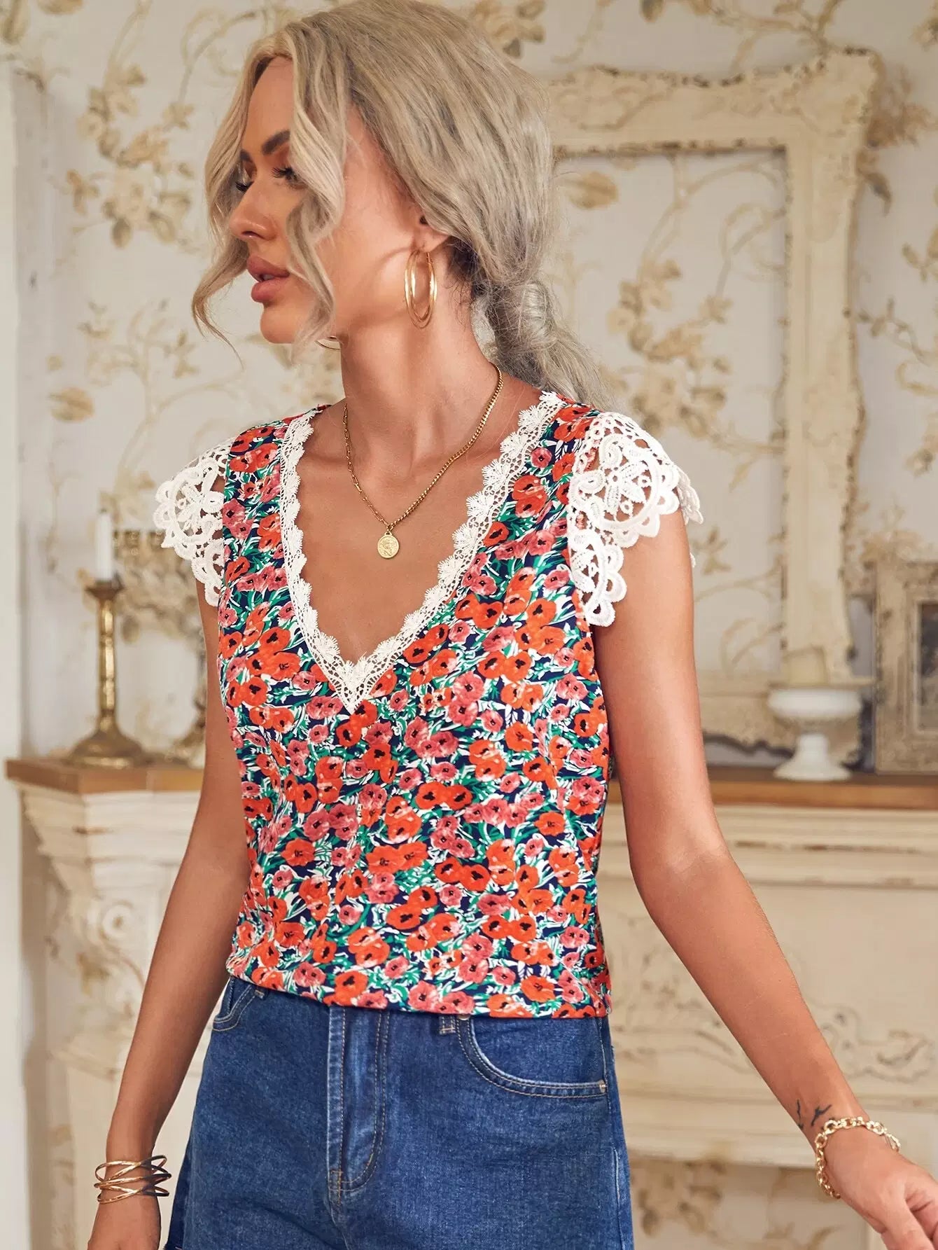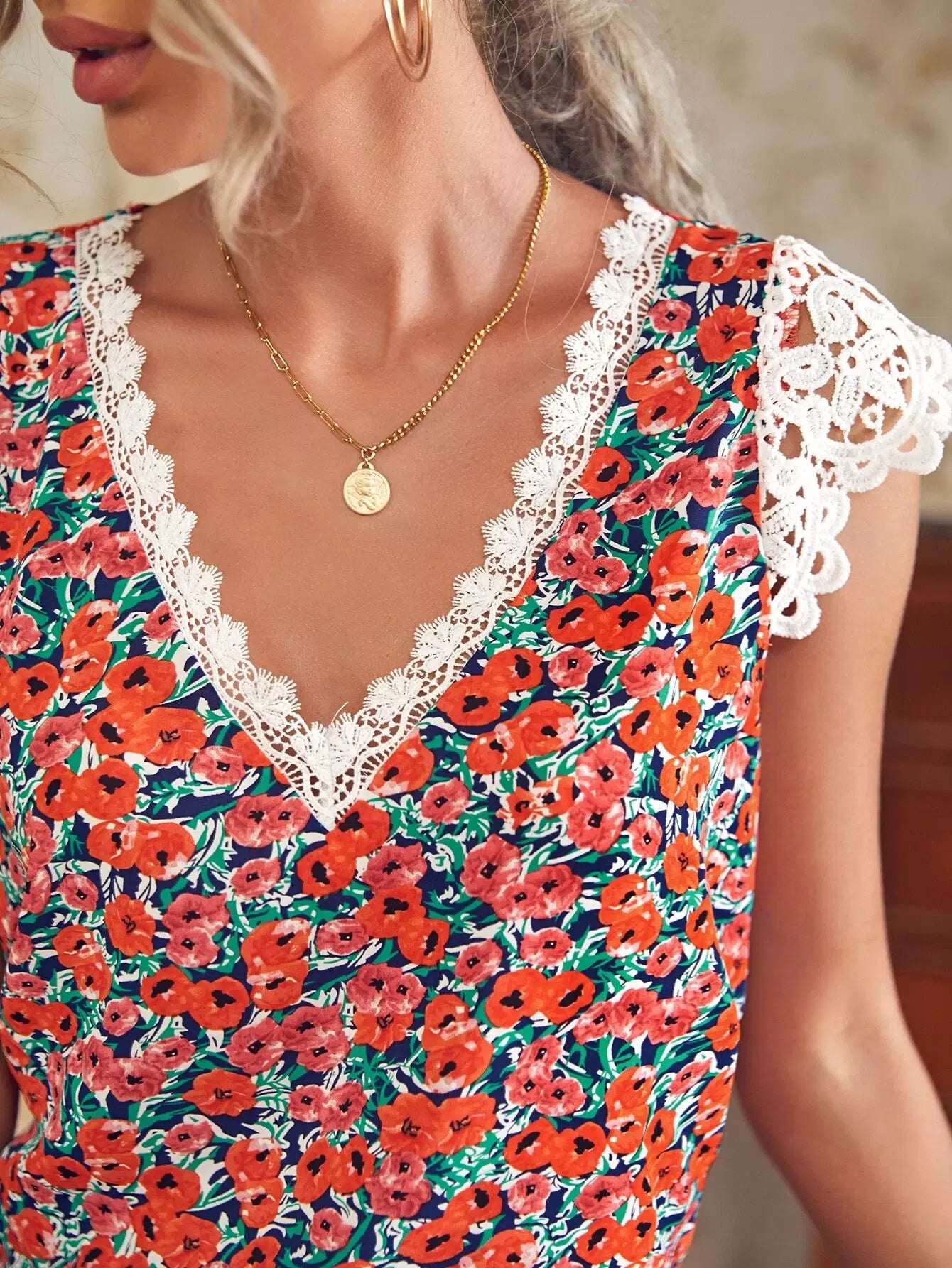 توب بحواف من الدانتيل المخرّم بطبعة زهور
