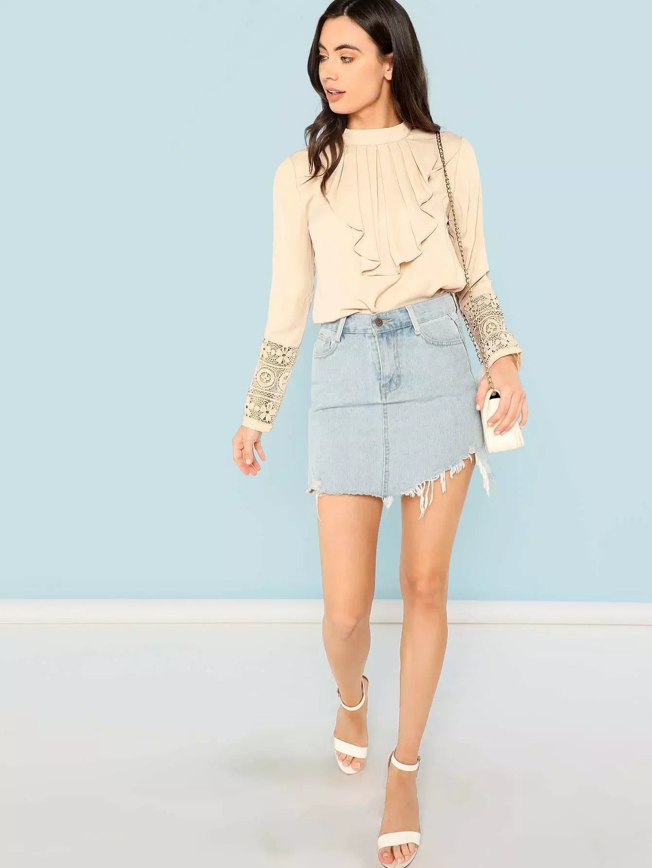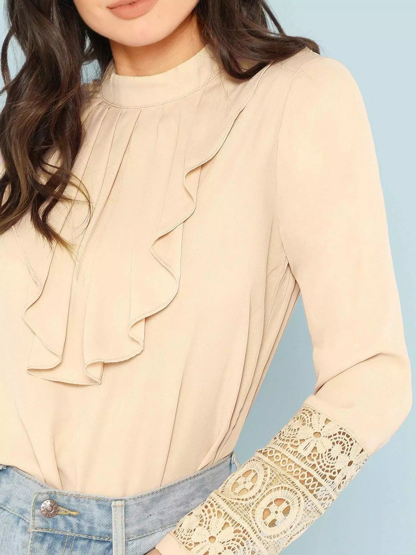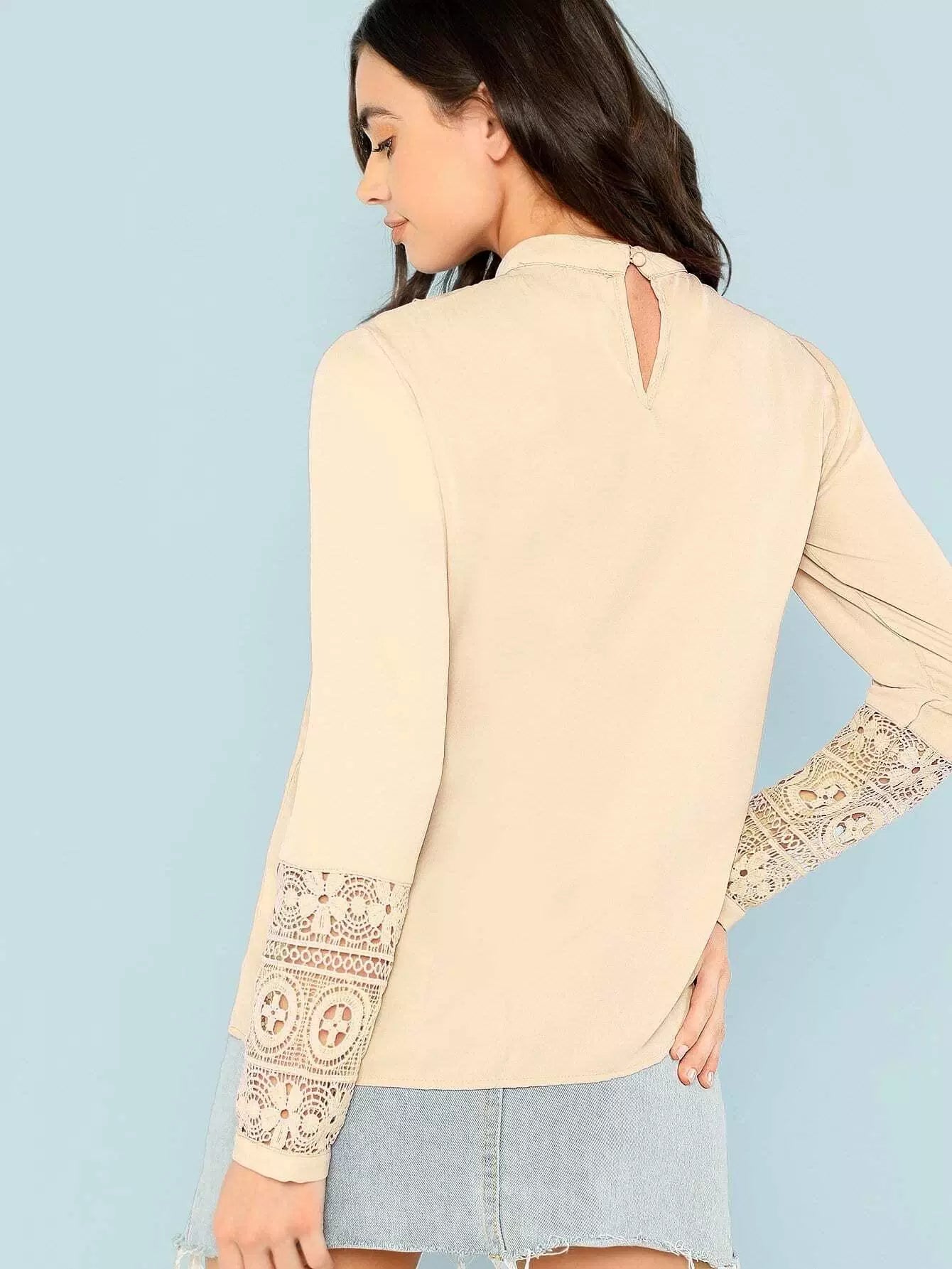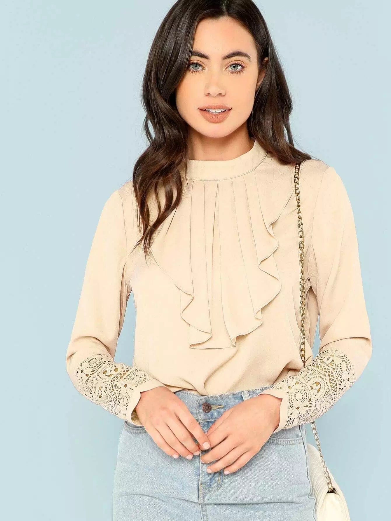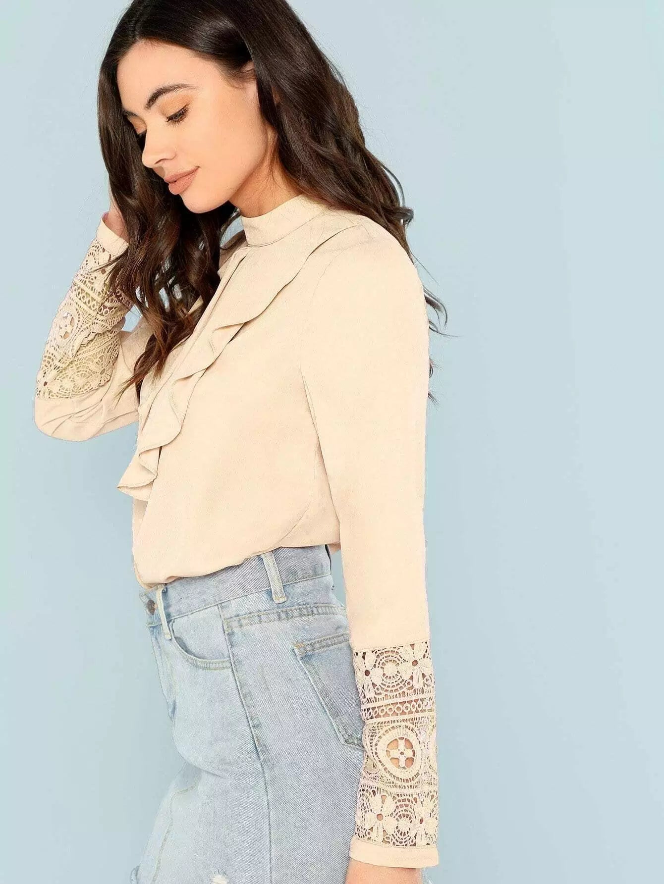 بلوزة بياقة من الدانتيل المخرّم بياقة جابوت