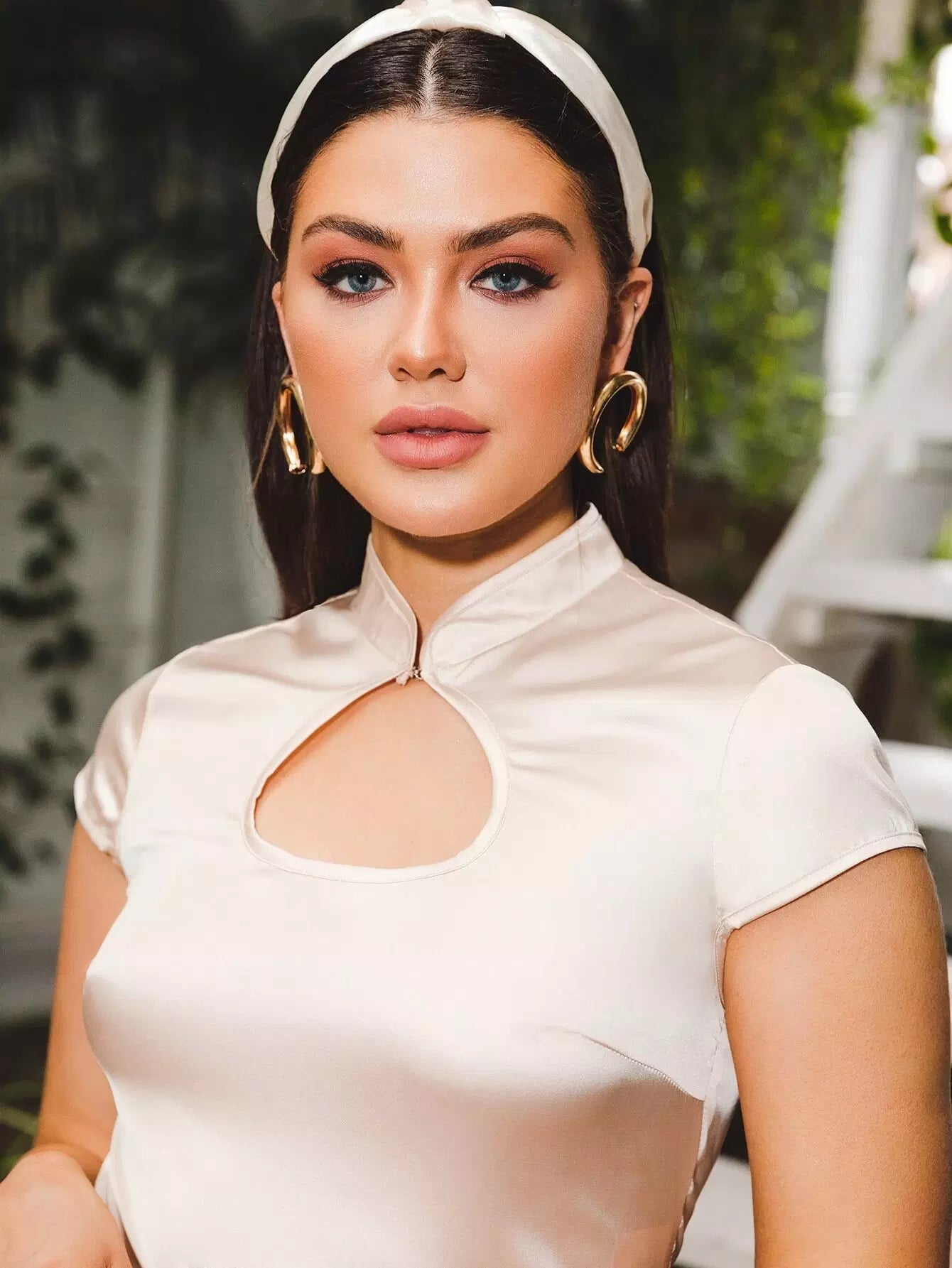 الملابس - بلوزة من الساتان ذات ياقة ماندرين وأكمام قصيرة