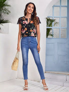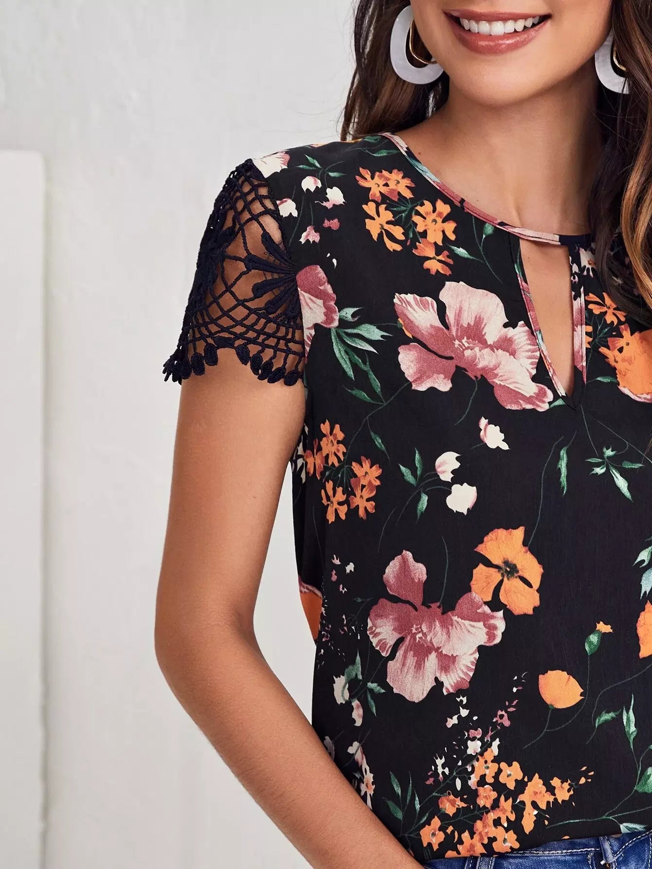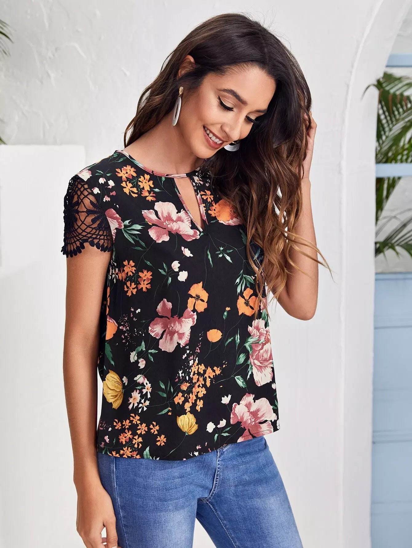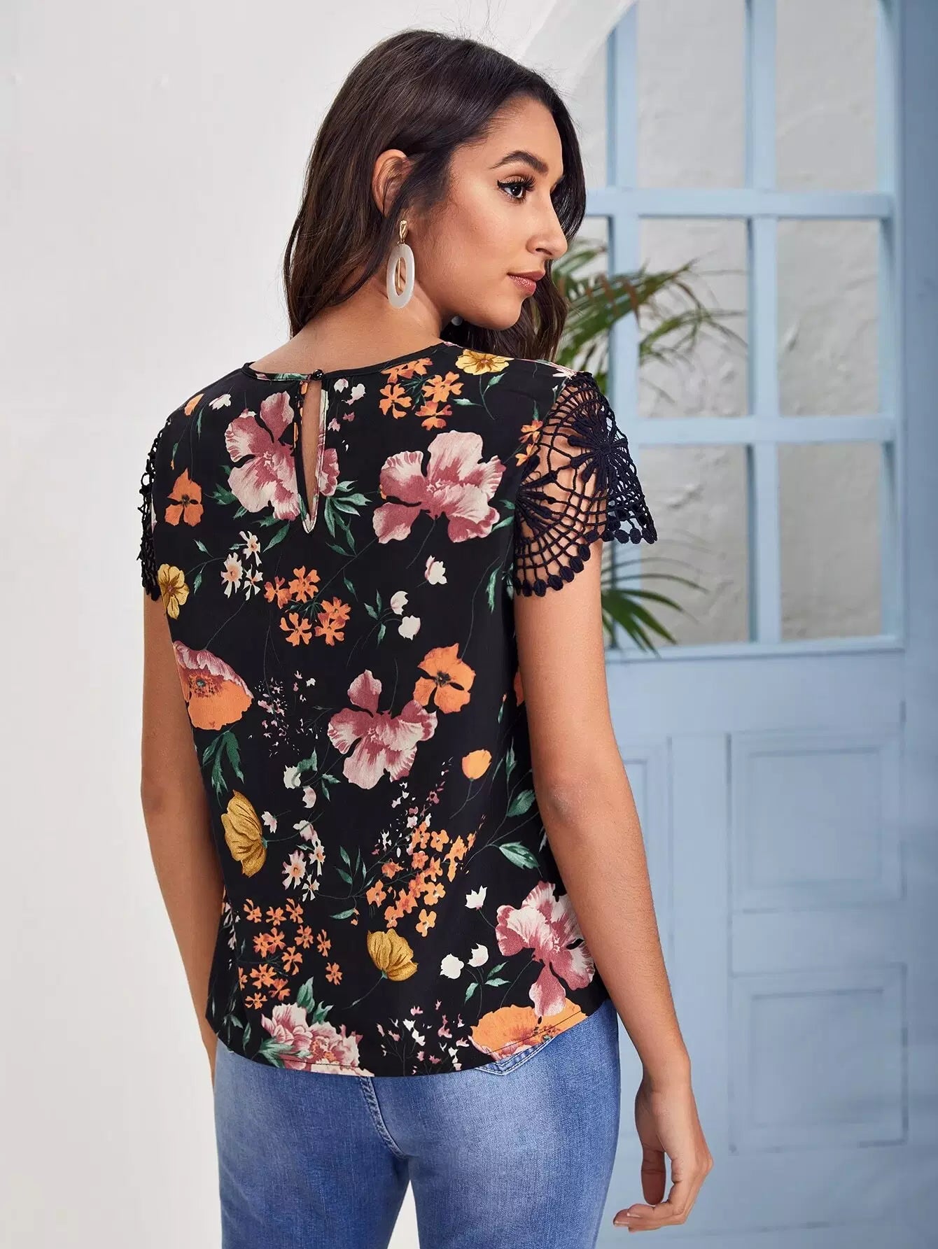 بلوزة زهرية بأكمام من الدانتيل وفتحة رقبة على شكل فتحة مفتاح