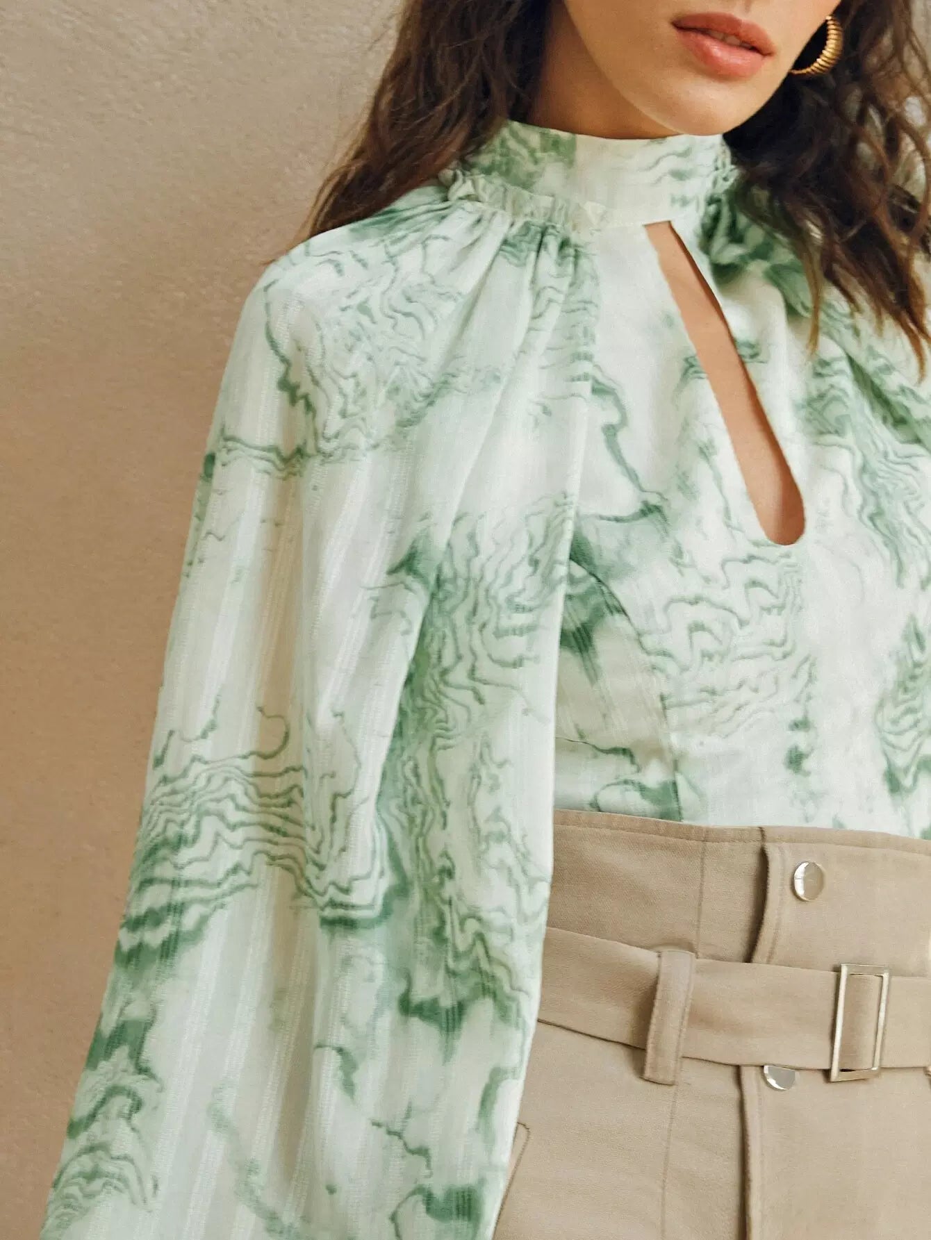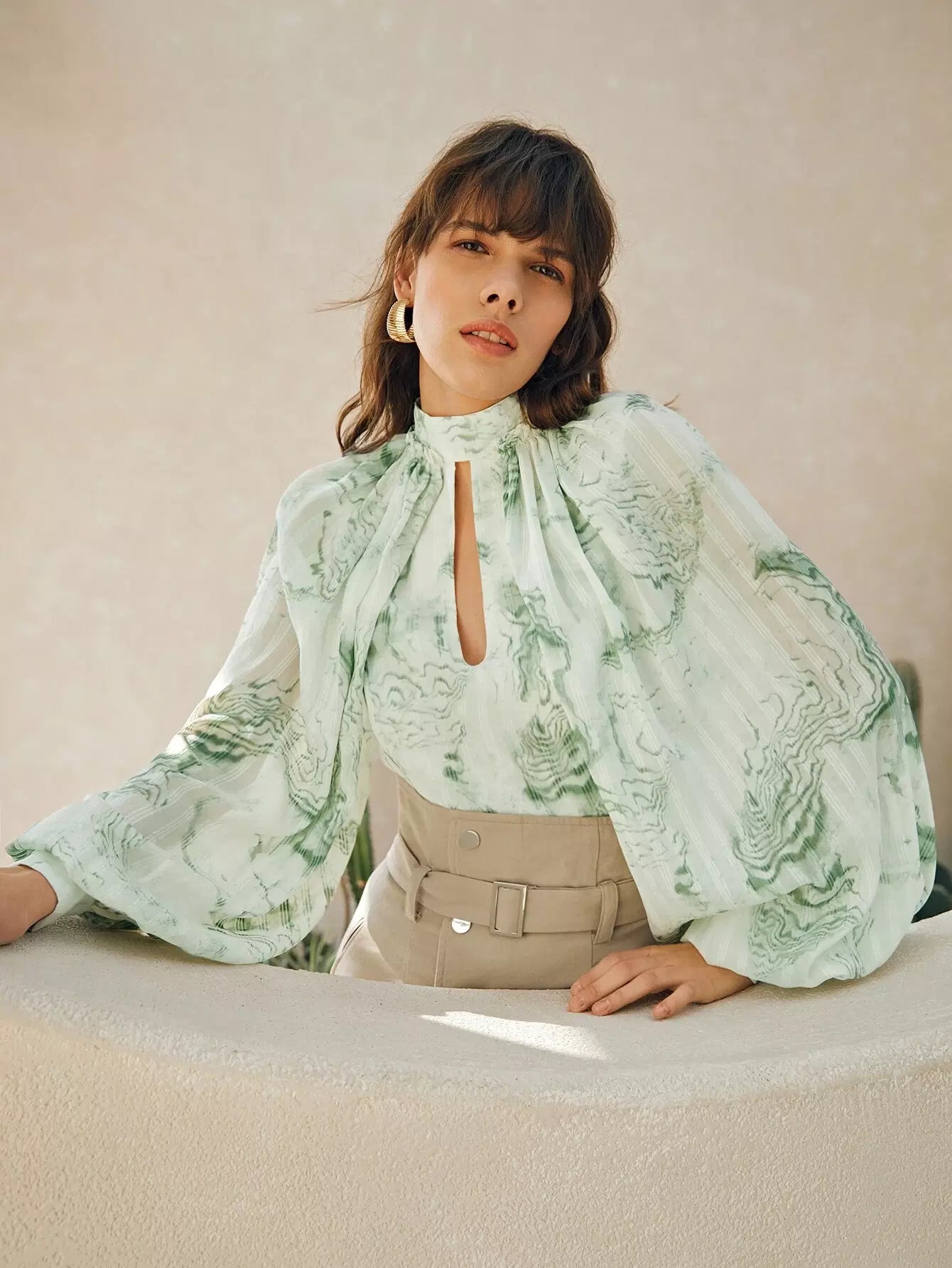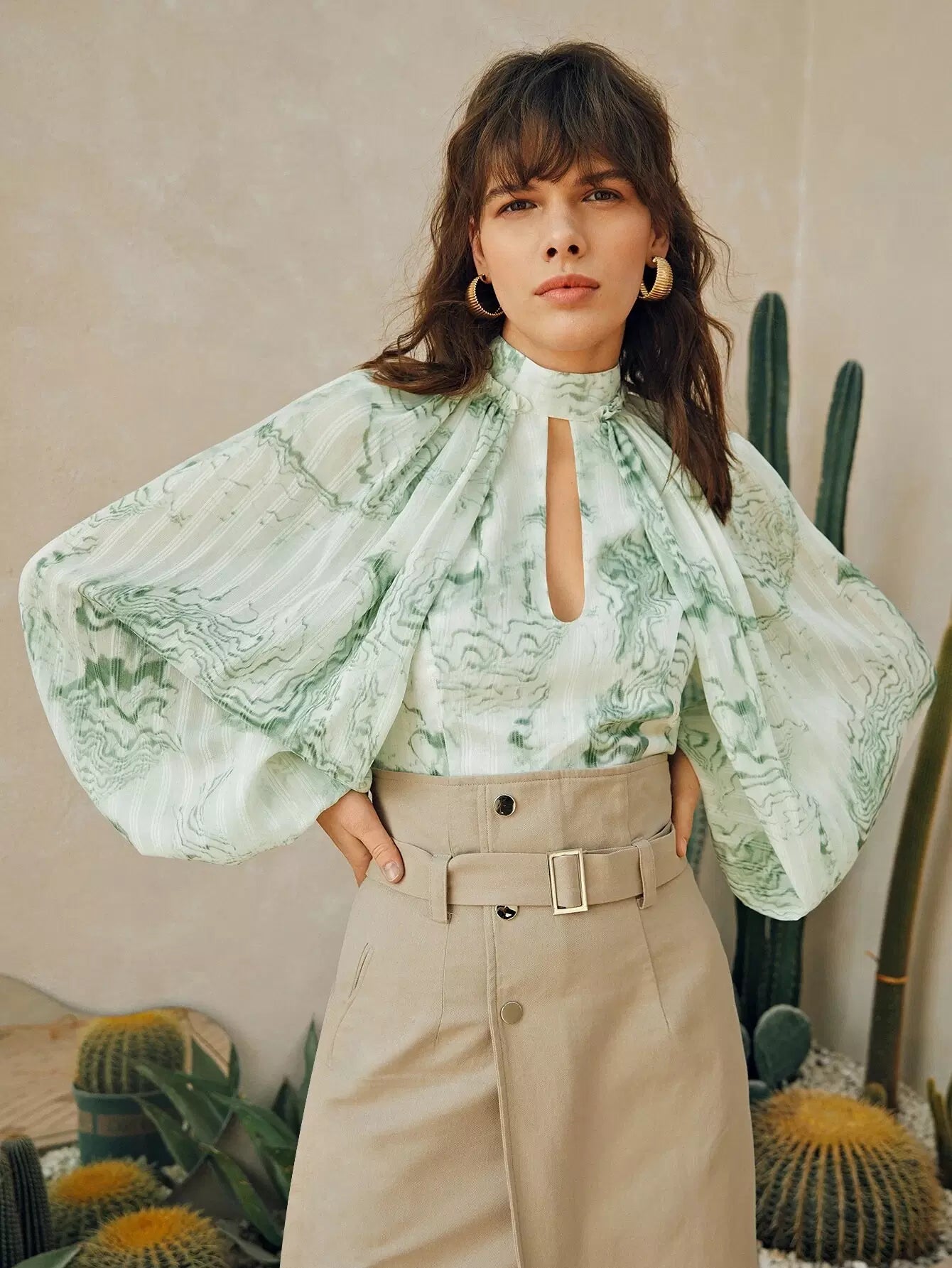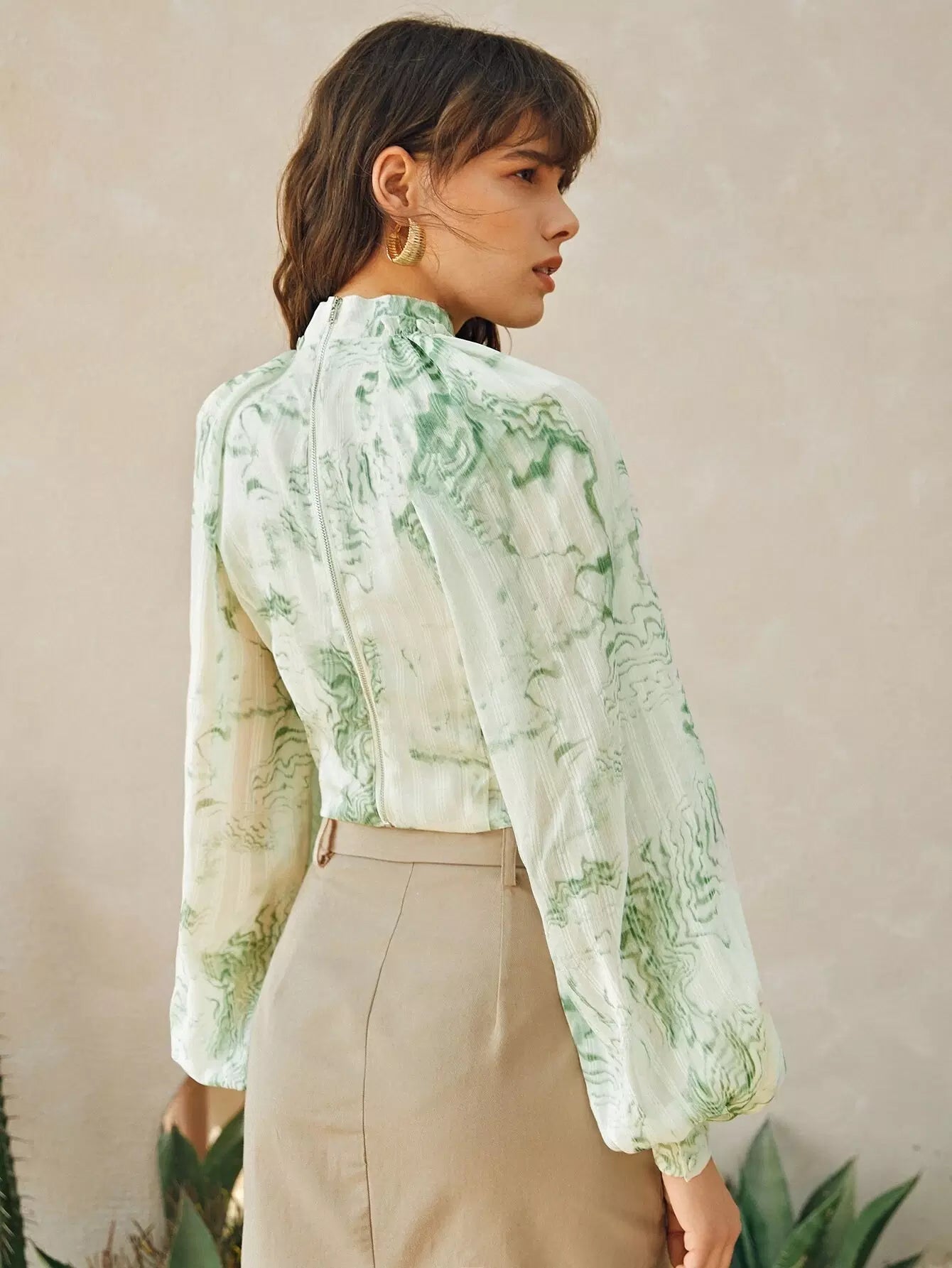 بلوزة بفتحة رقبة بفتحة رقبة فانوسية بأكمام رخامية بطبعة رخامية