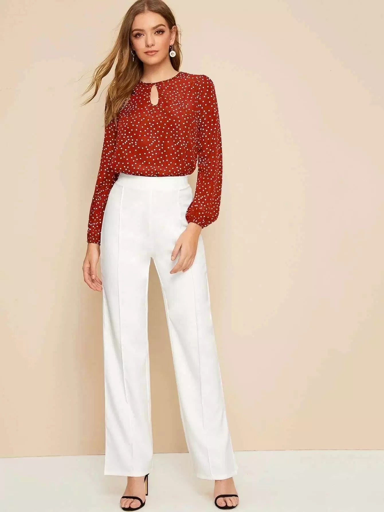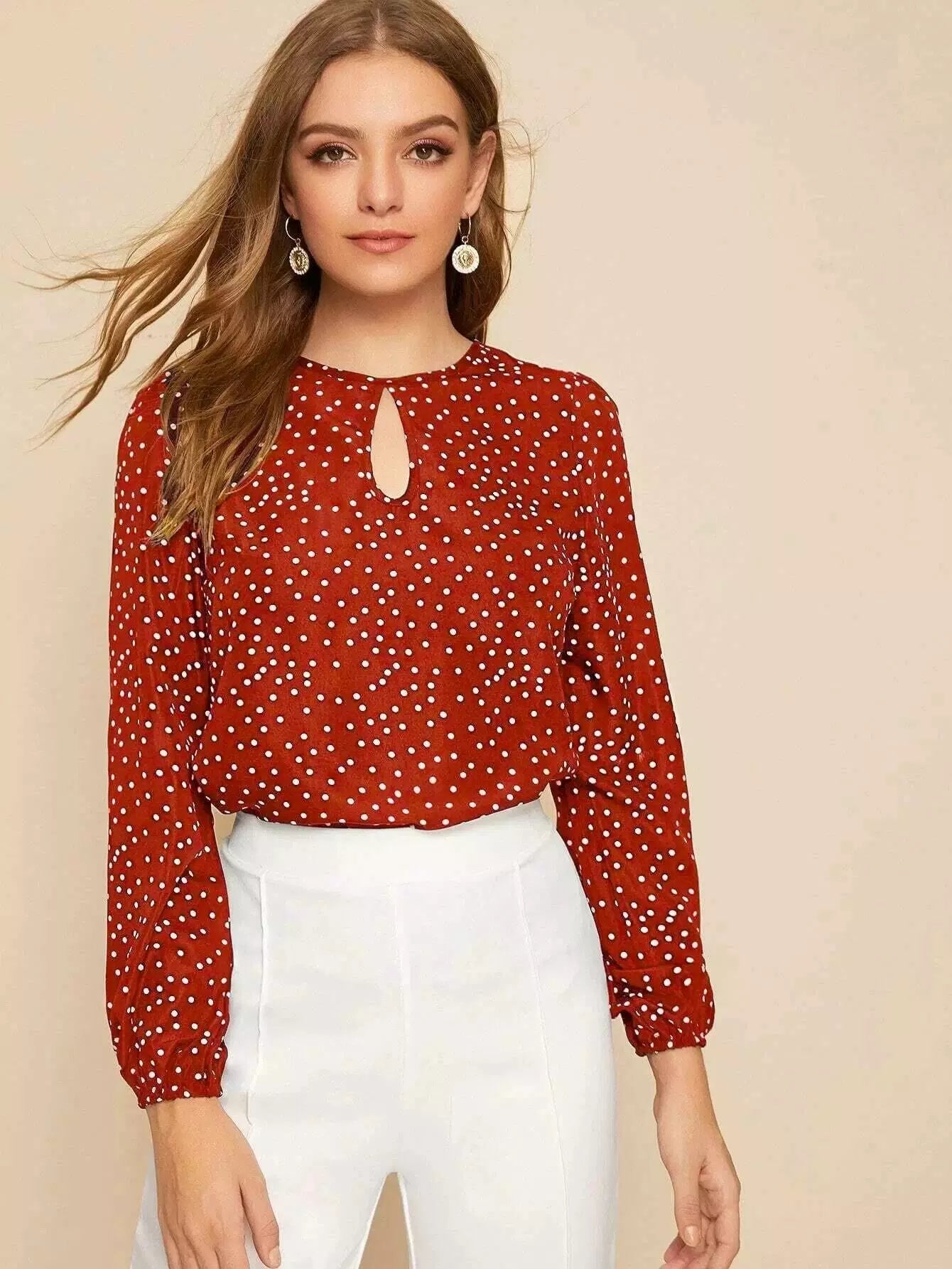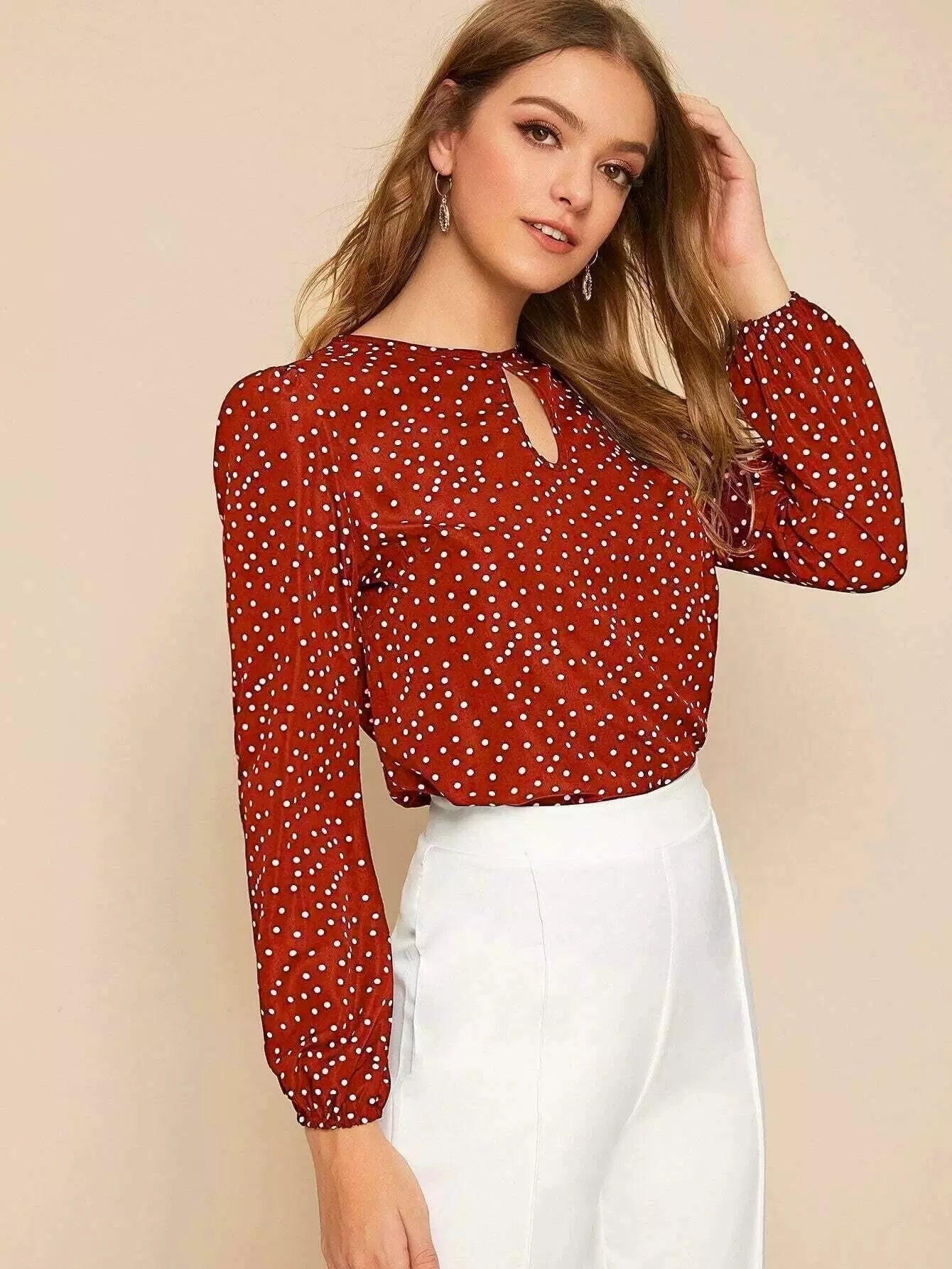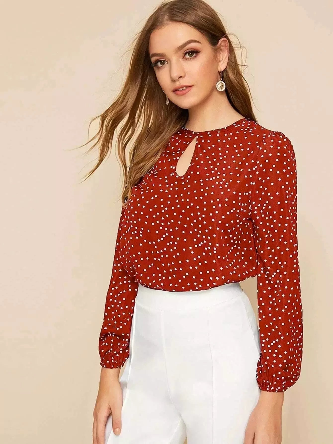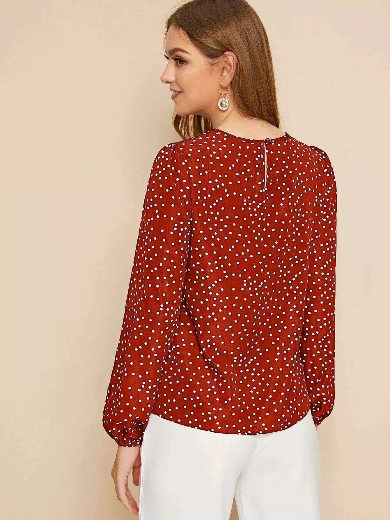 بلوزة برقبة بفتحة عنق برقبة منقوشة بنقشة بولكا دوت