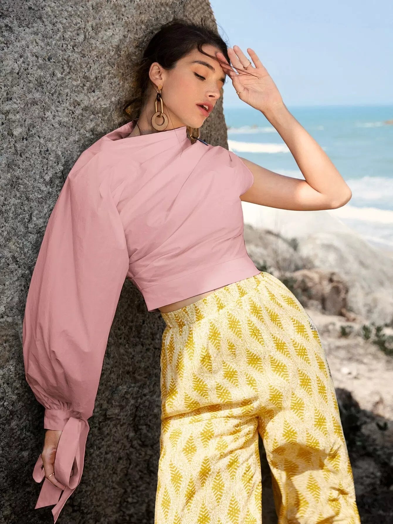 بلوزة بأكمام مكشكشة ذات عقدة بأكمام فانوسية
