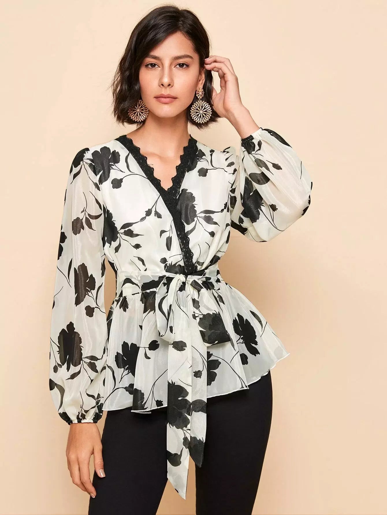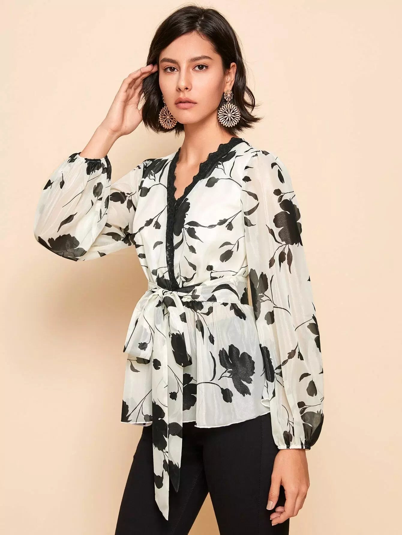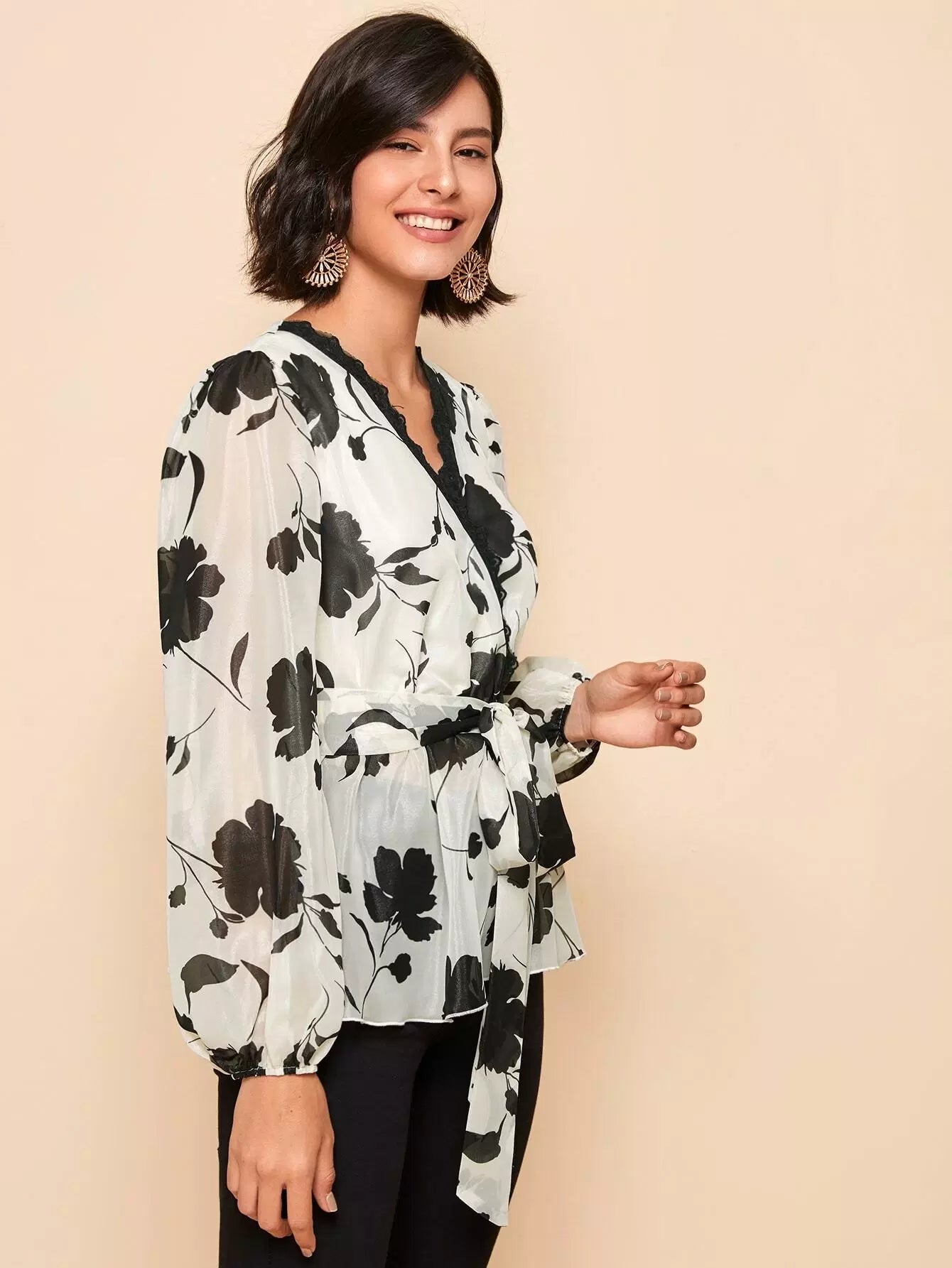 بلوزة بطبعة زهور مزخرفة بالدانتيل بدون حزام
