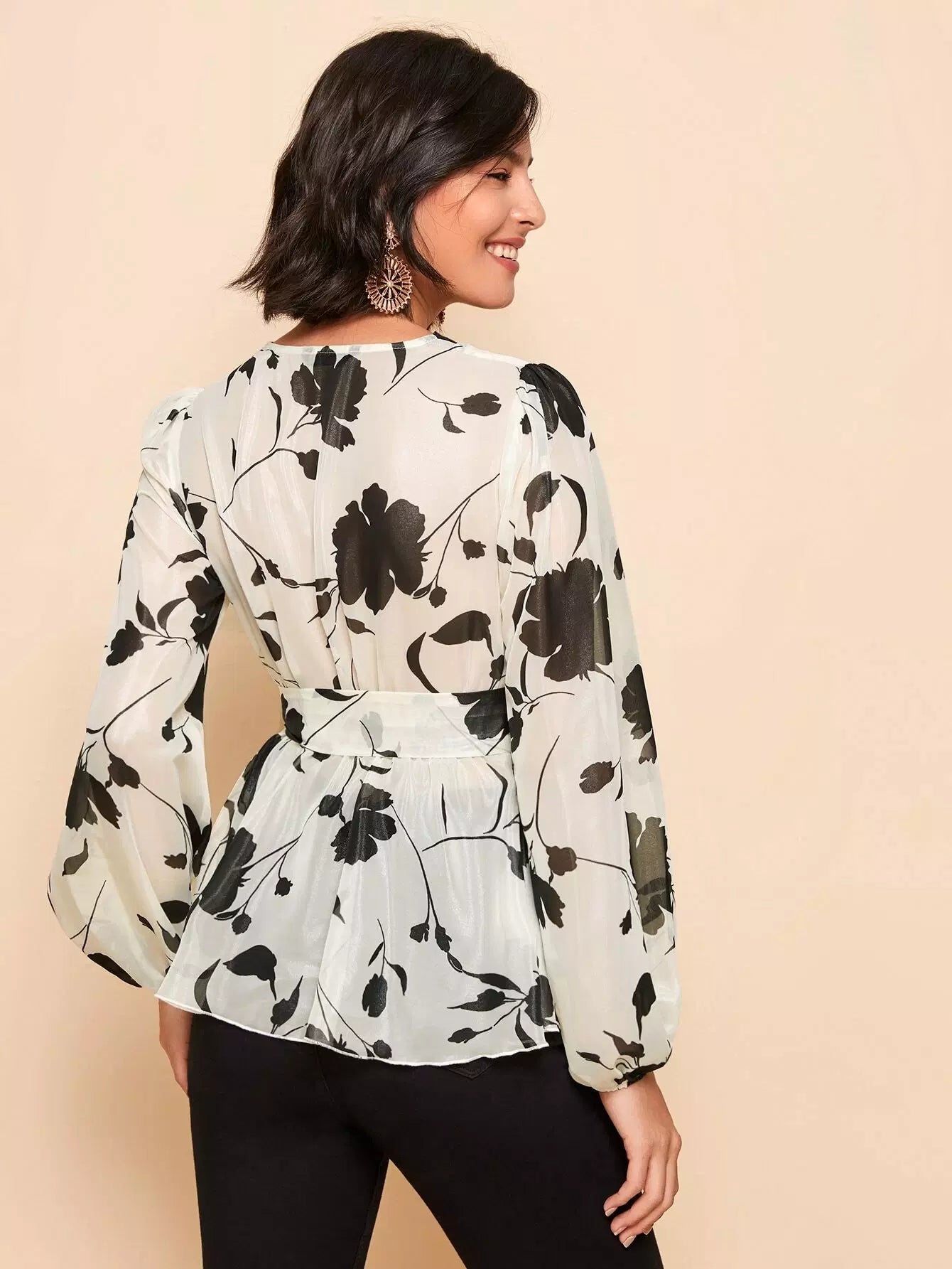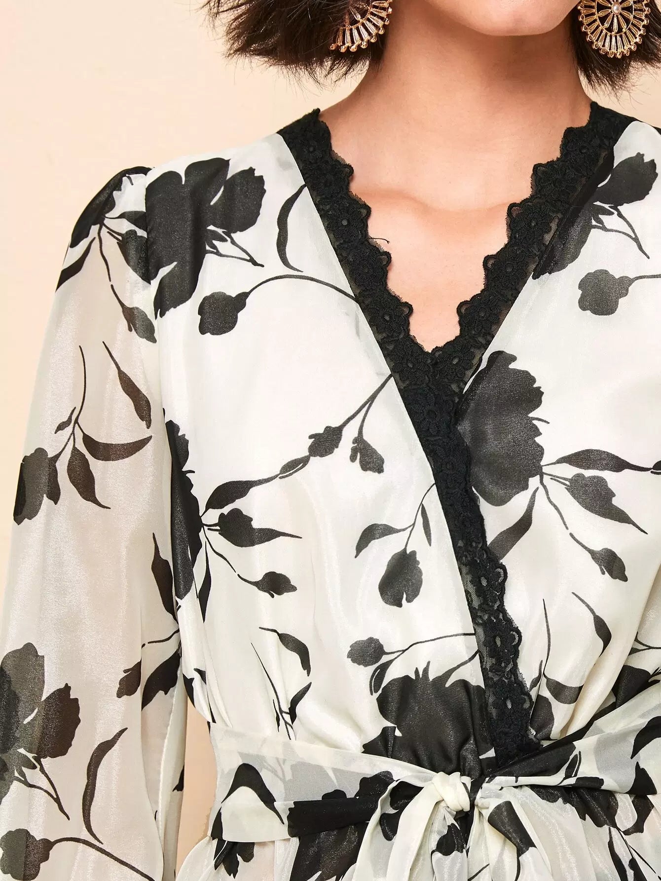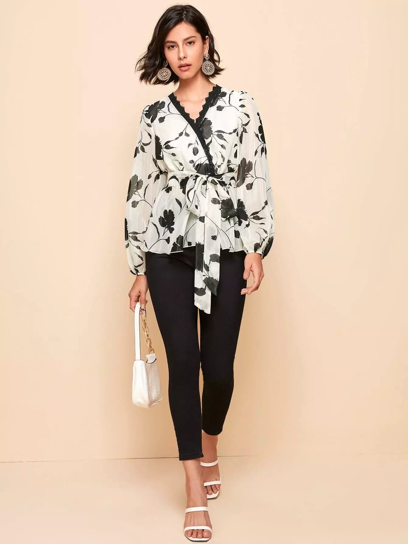 بلوزة بطبعة زهور مزخرفة بالدانتيل بدون حزام