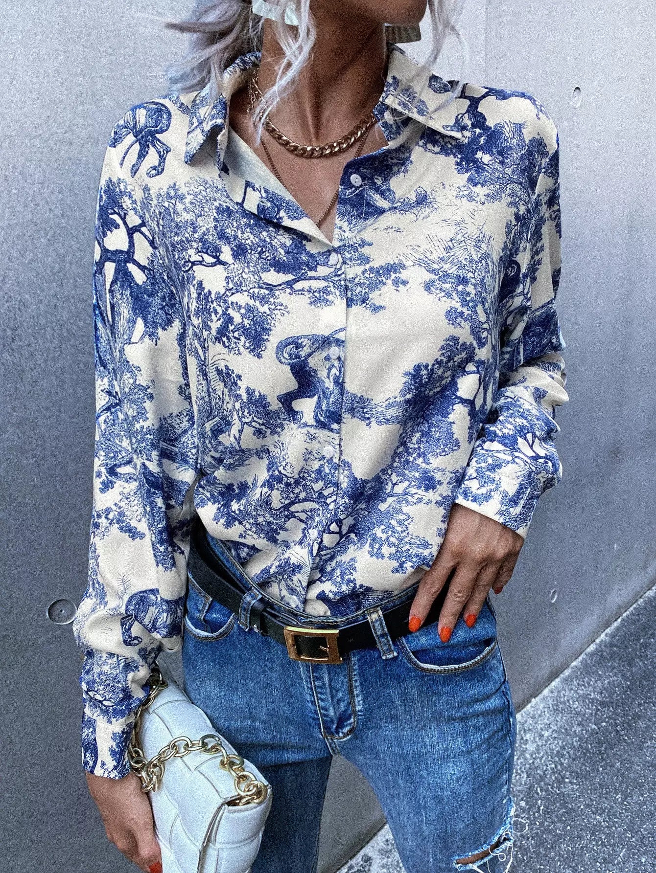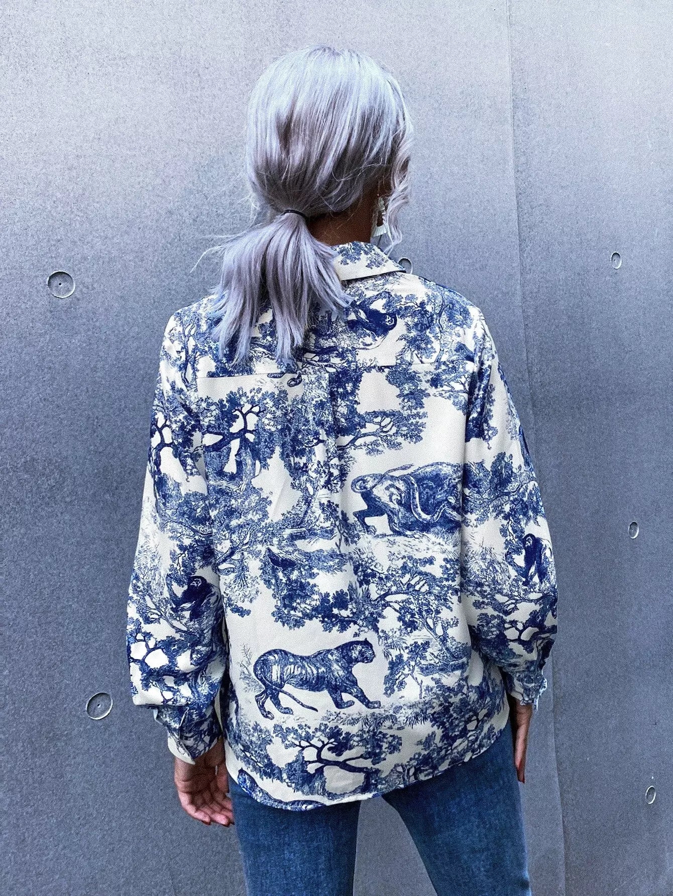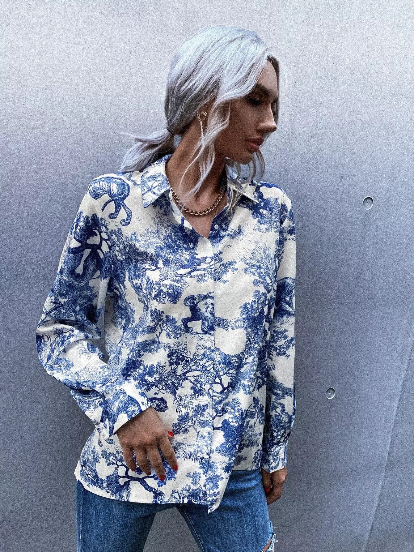 بلوزة بطبعة منقوشة على شكل أفقي بأزرار