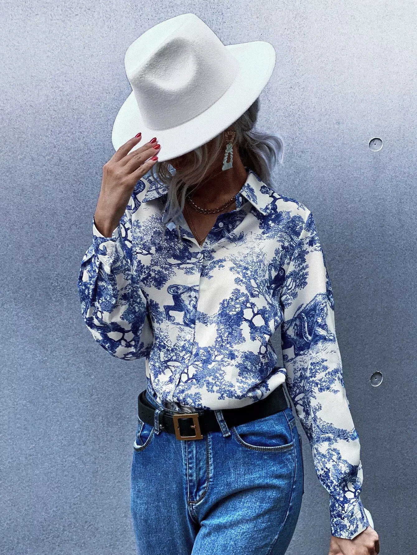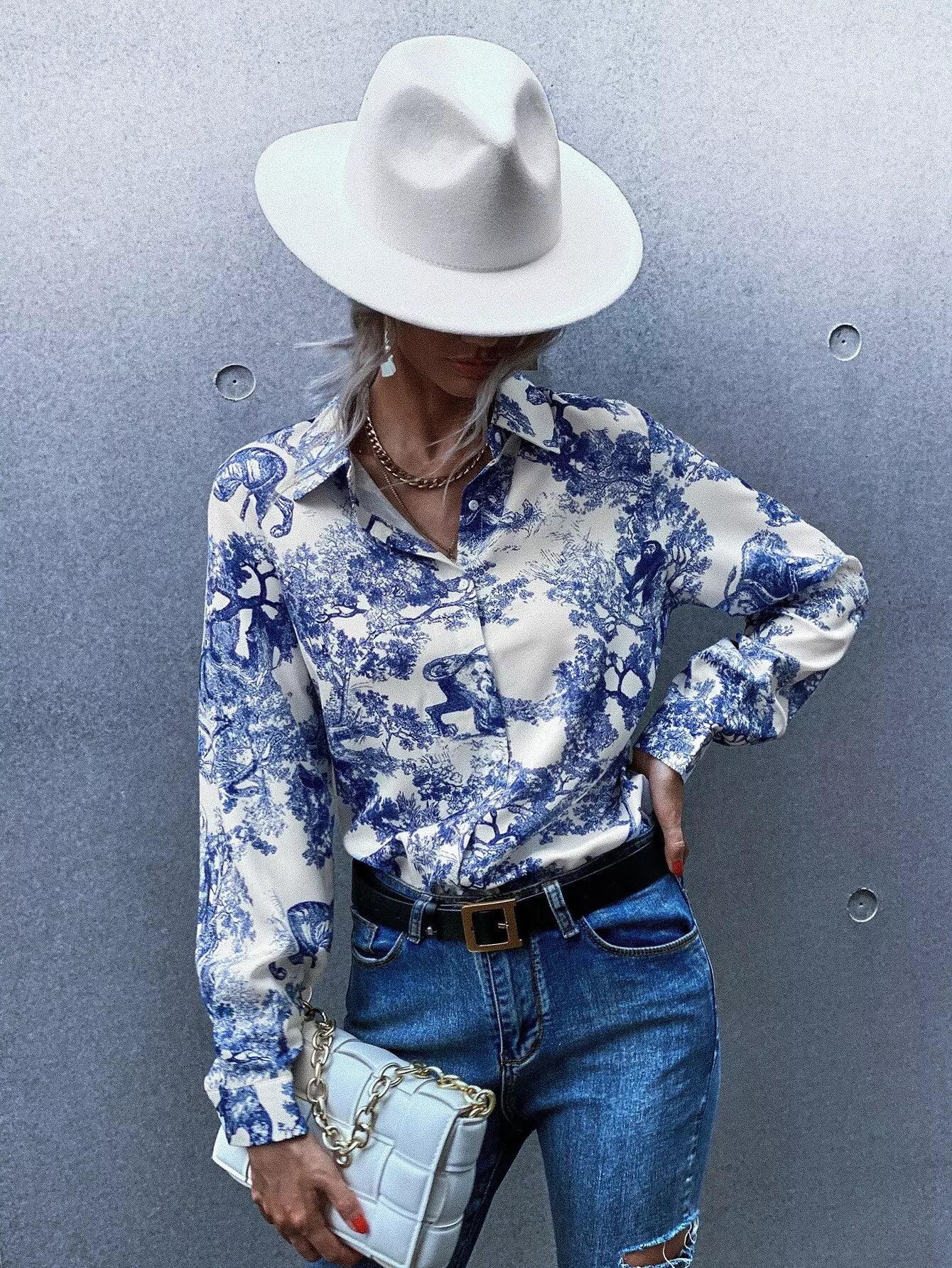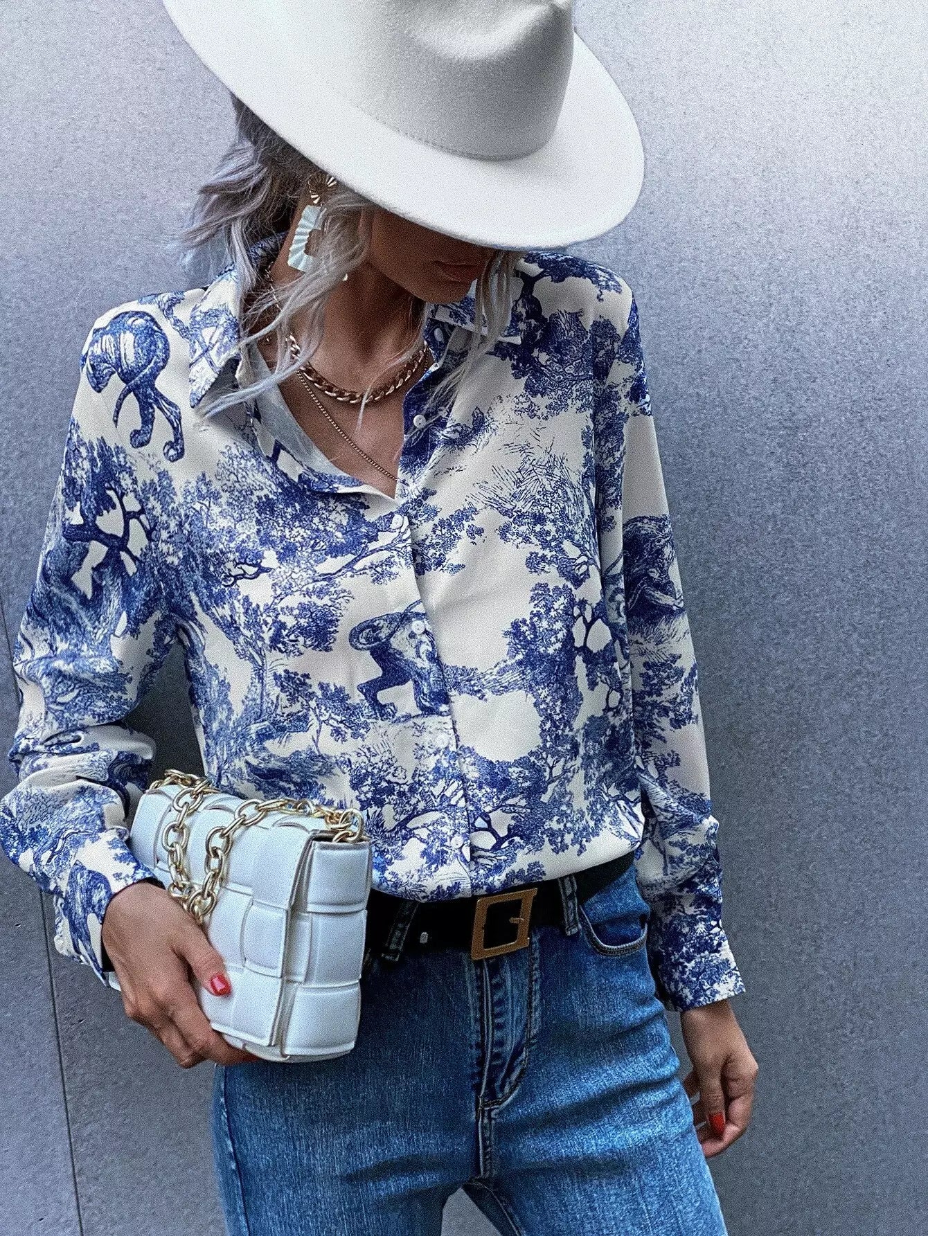 بلوزة بطبعة منقوشة على شكل أفقي بأزرار
