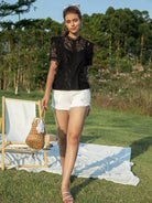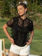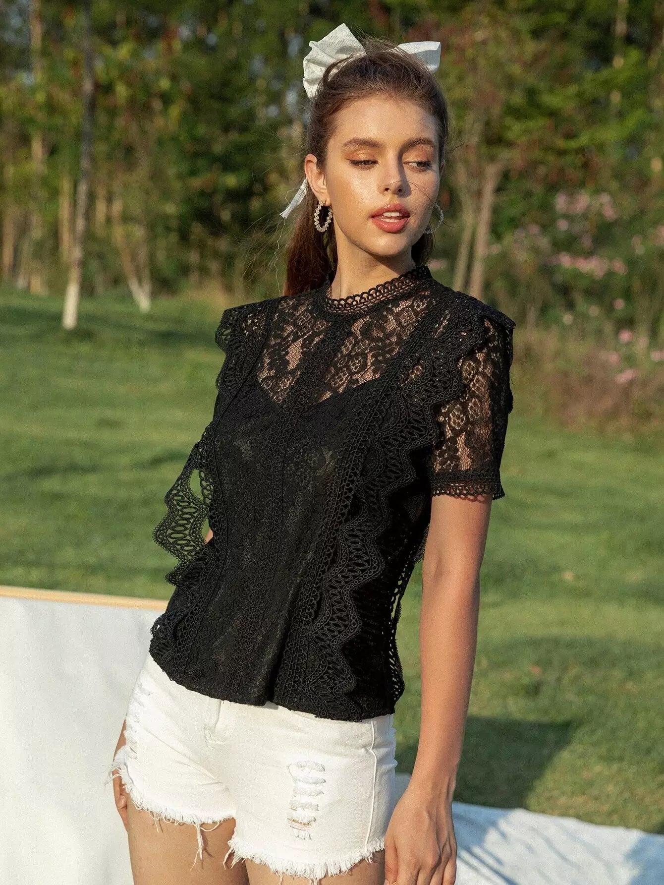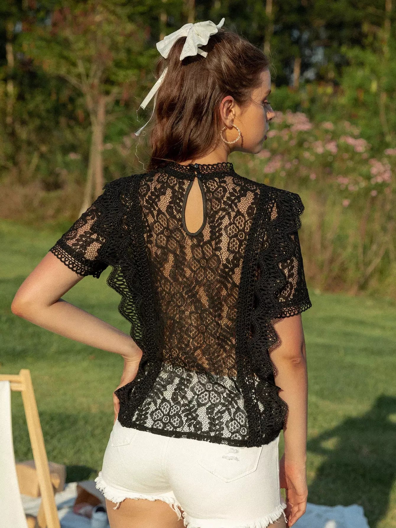 بلوزة دانتيل بياقة وهمية مزينة بكشكش من الدانتيل