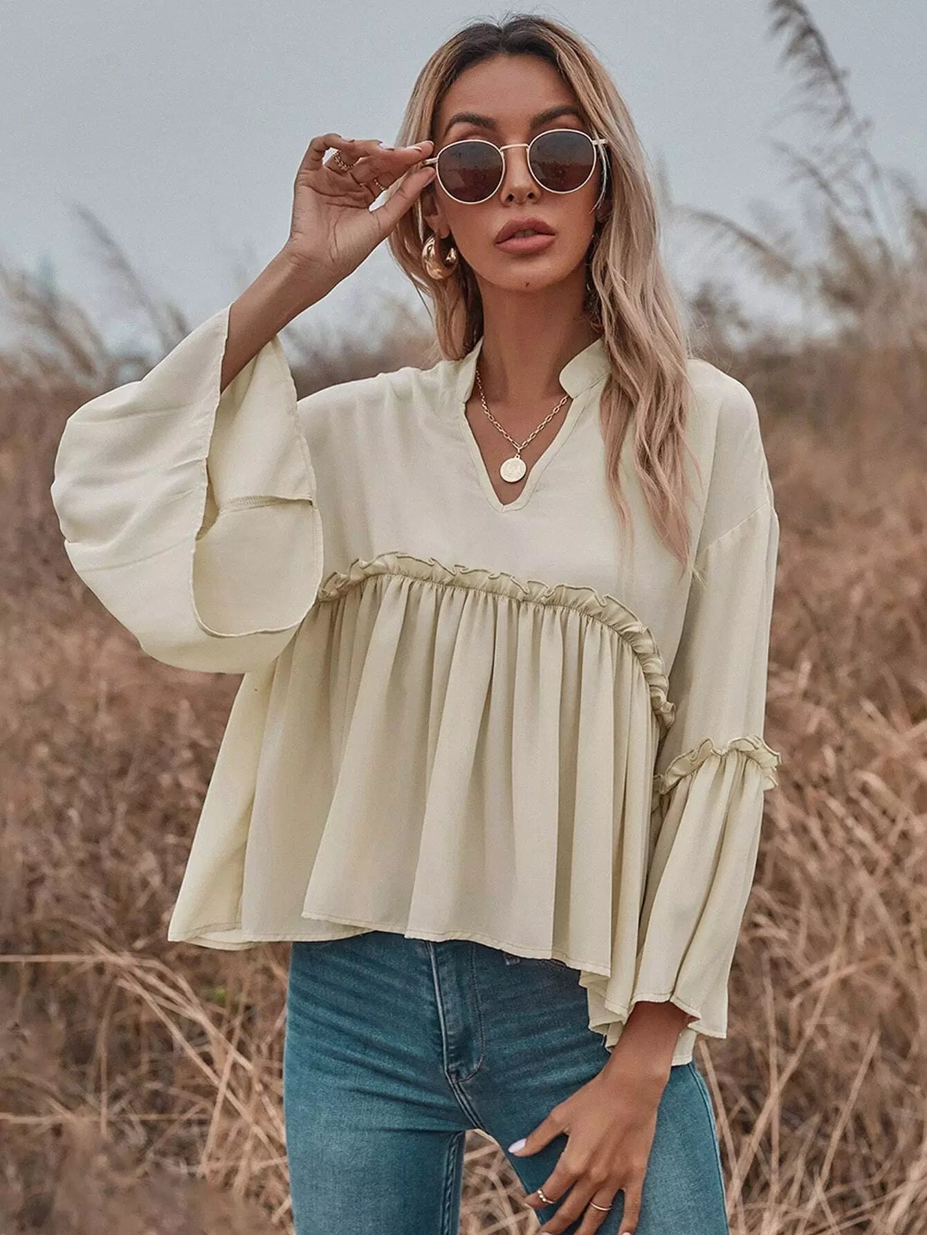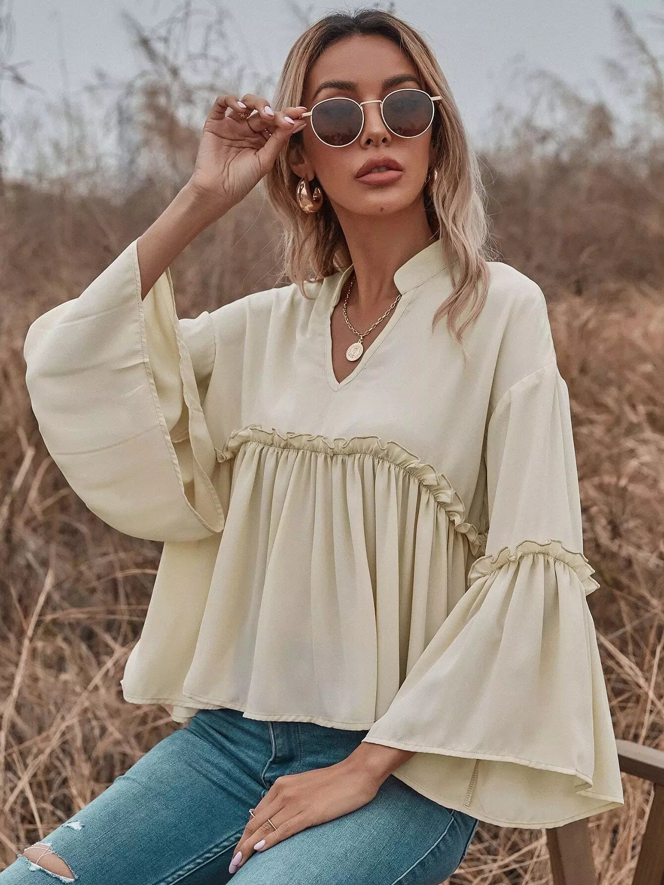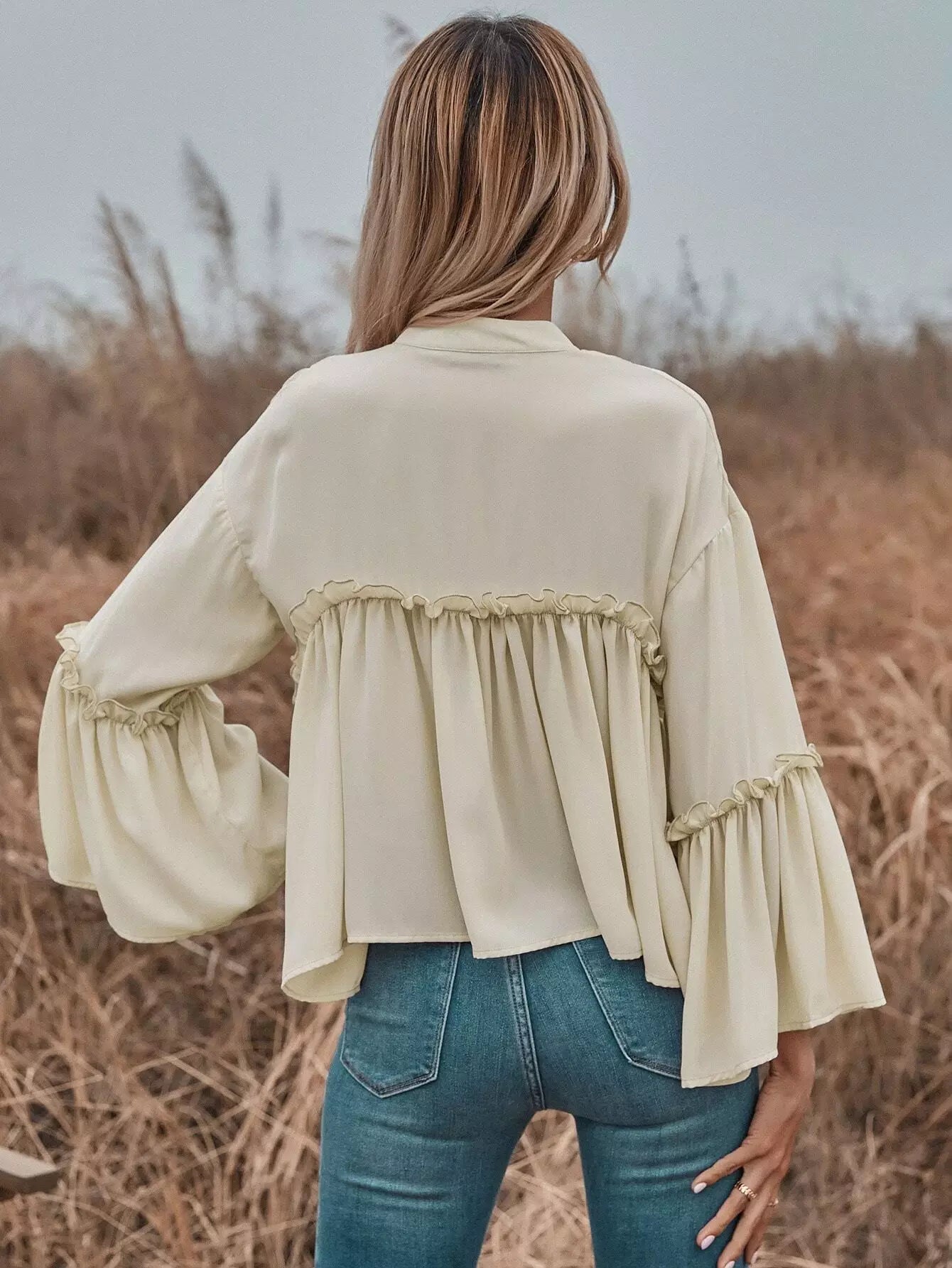 للنساء - بلوزة بيبي دول ذات فتحة رقبة مكشكشة وأكمام واسعة