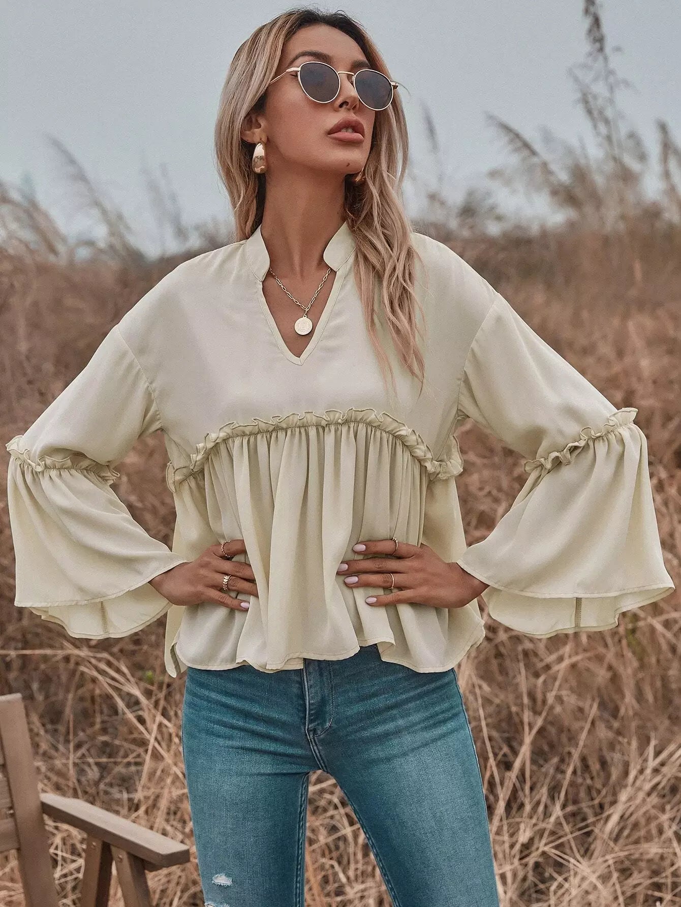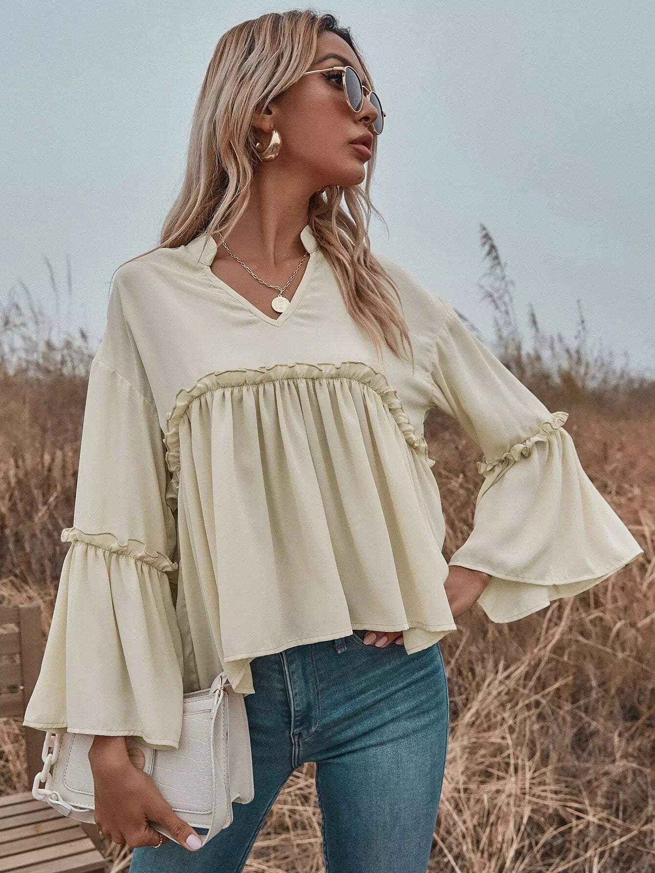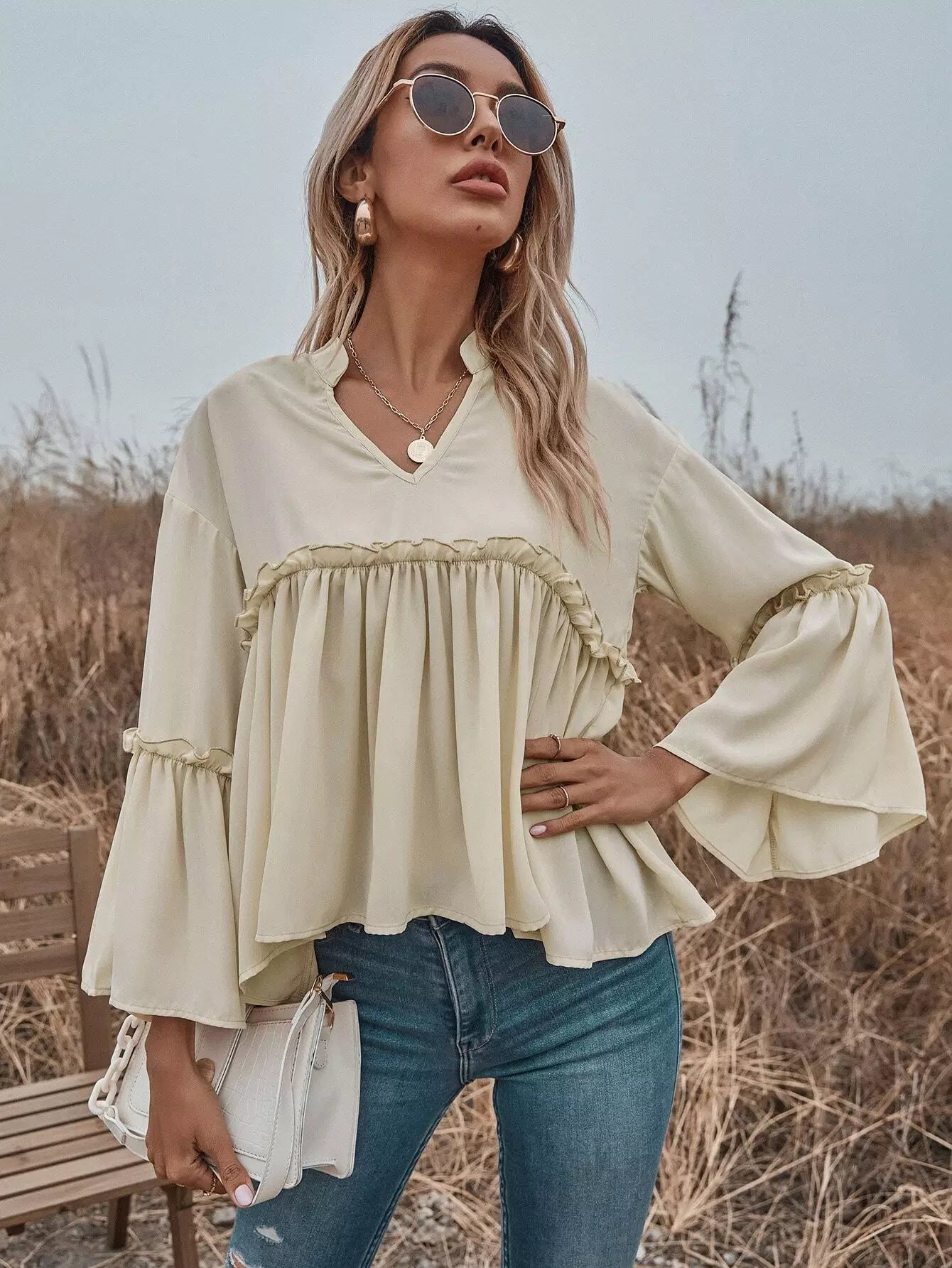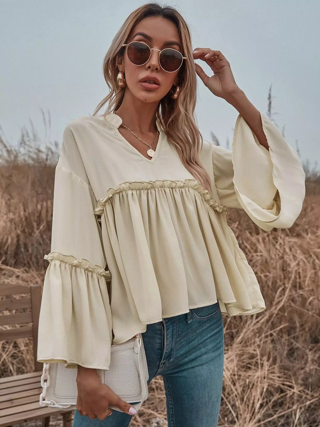 للنساء - بلوزة بيبي دول ذات فتحة رقبة مكشكشة وأكمام واسعة