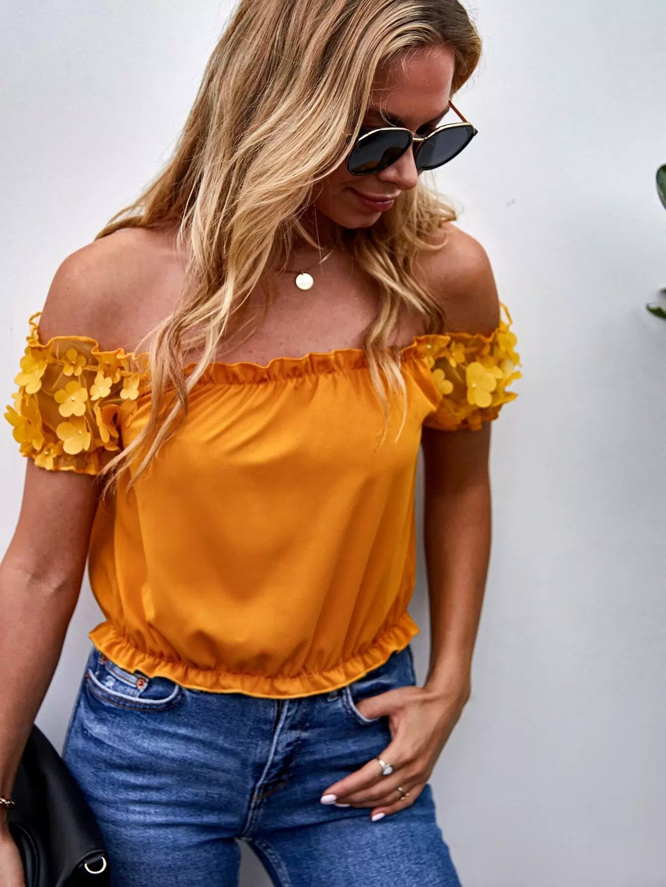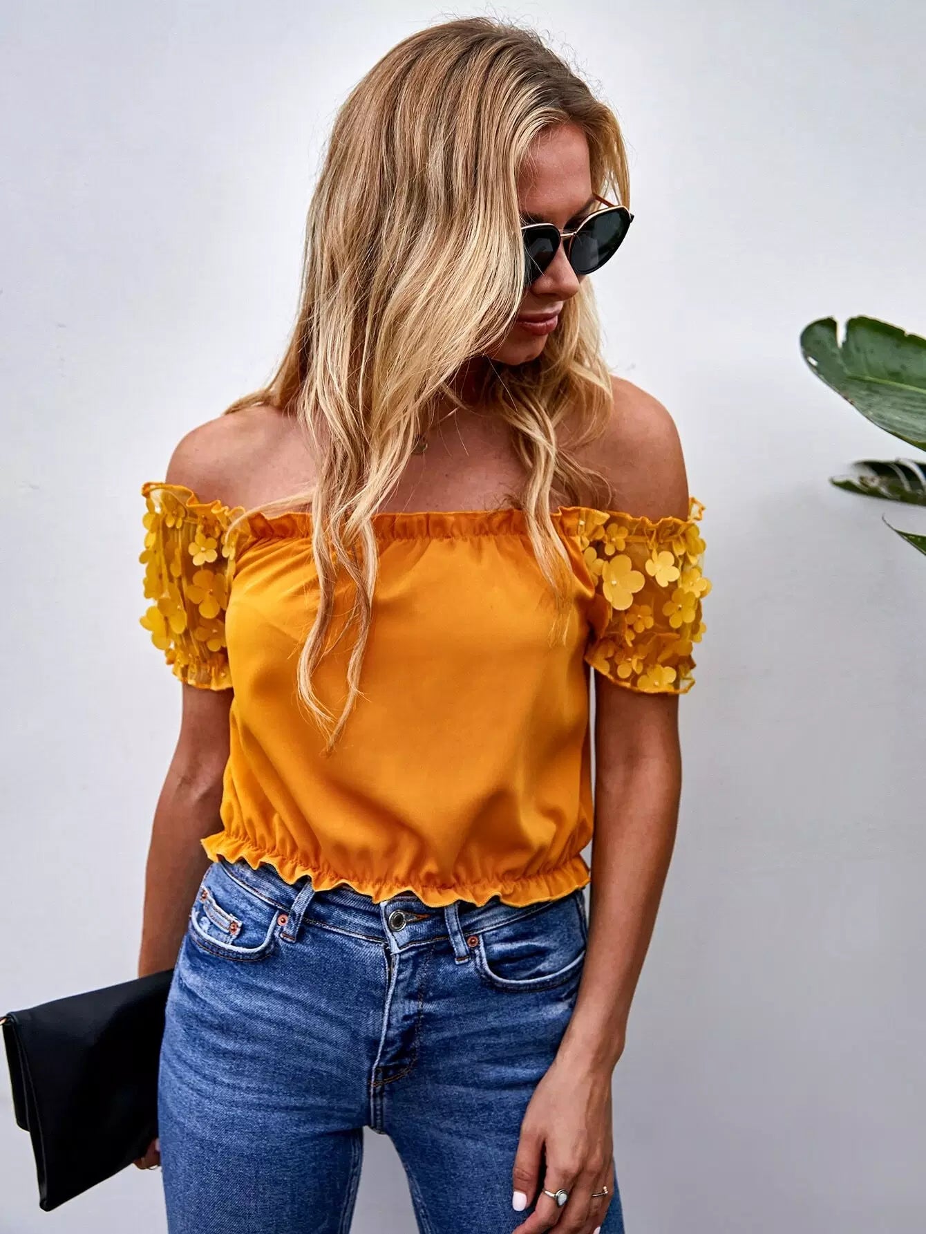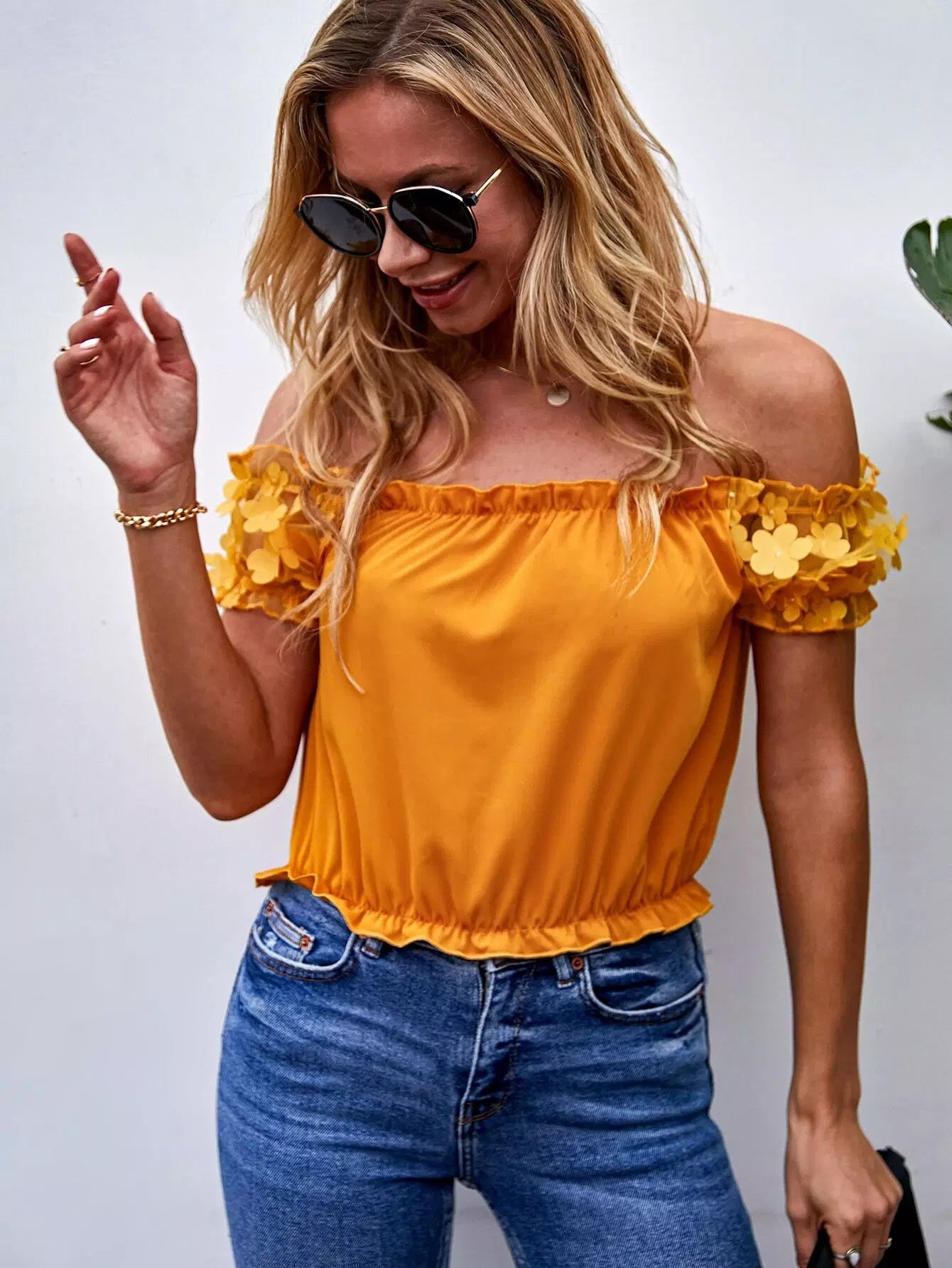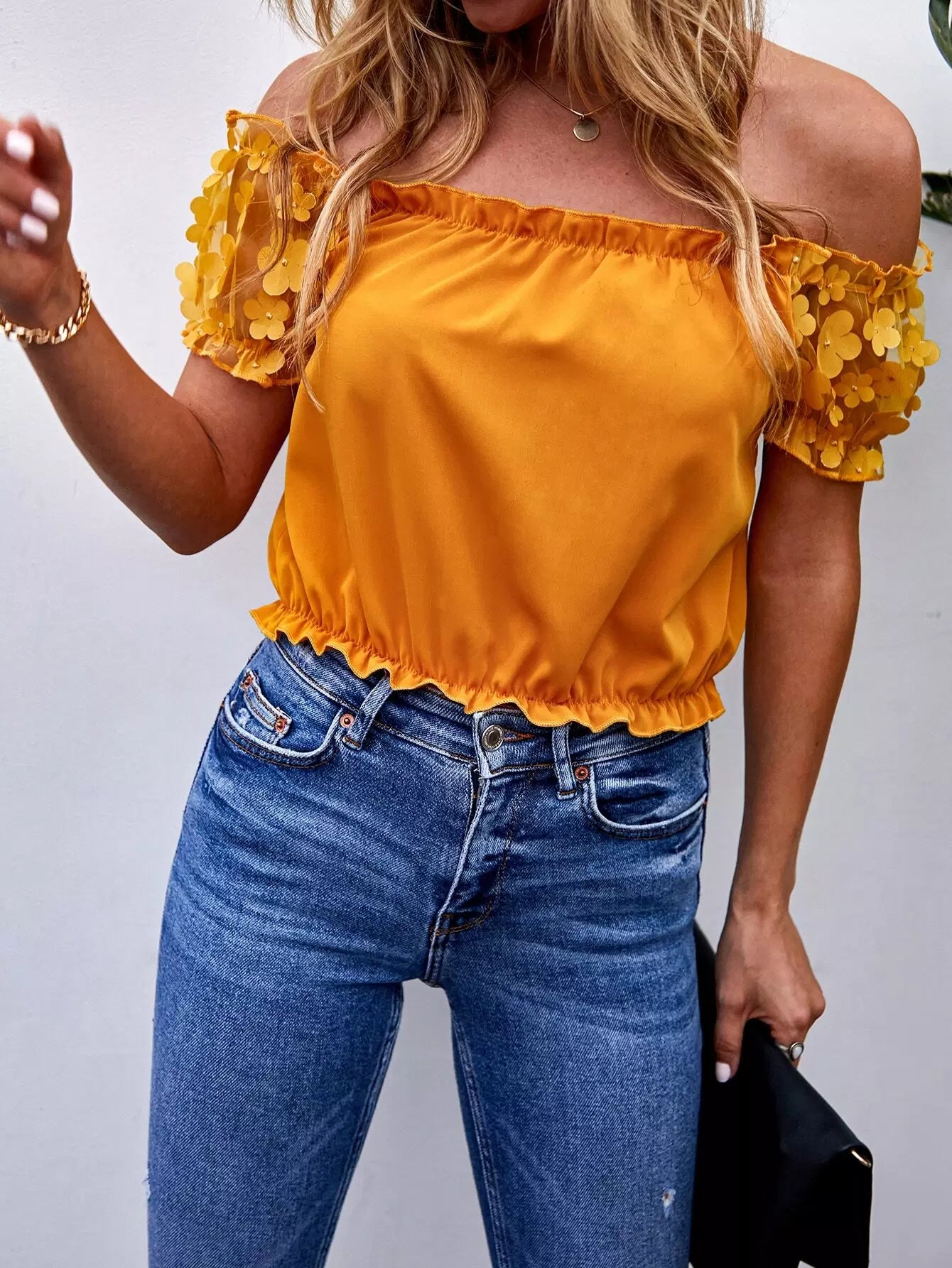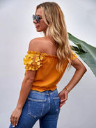 بلوزة كشكش بحواف كشكش مكشكشة مكشوفة الكتفين