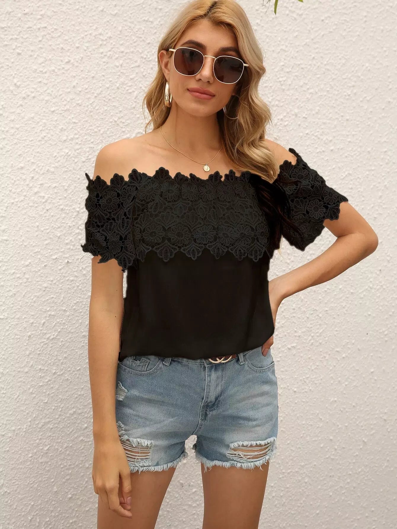 بلوزة سادة بحواف من الدانتيل بدون أكتاف