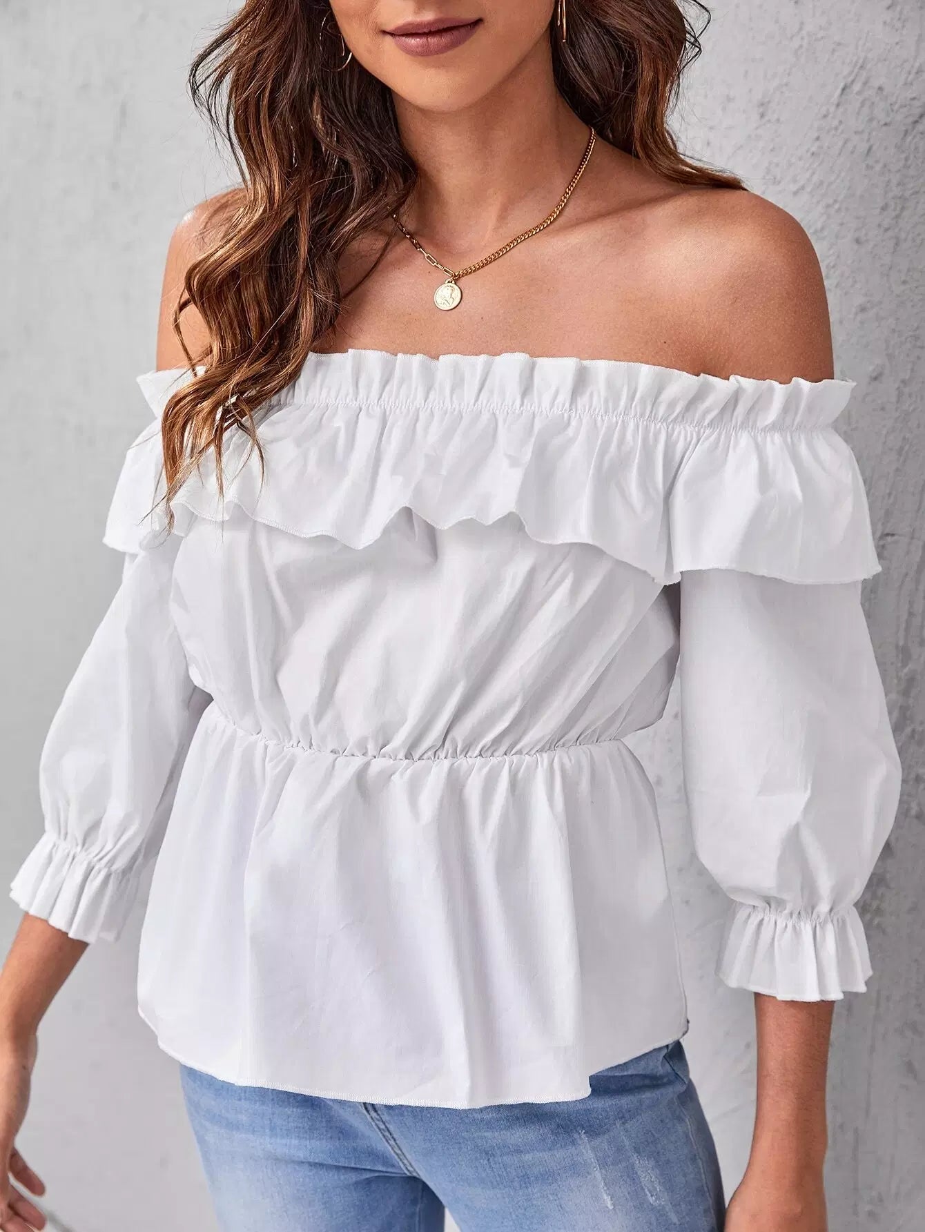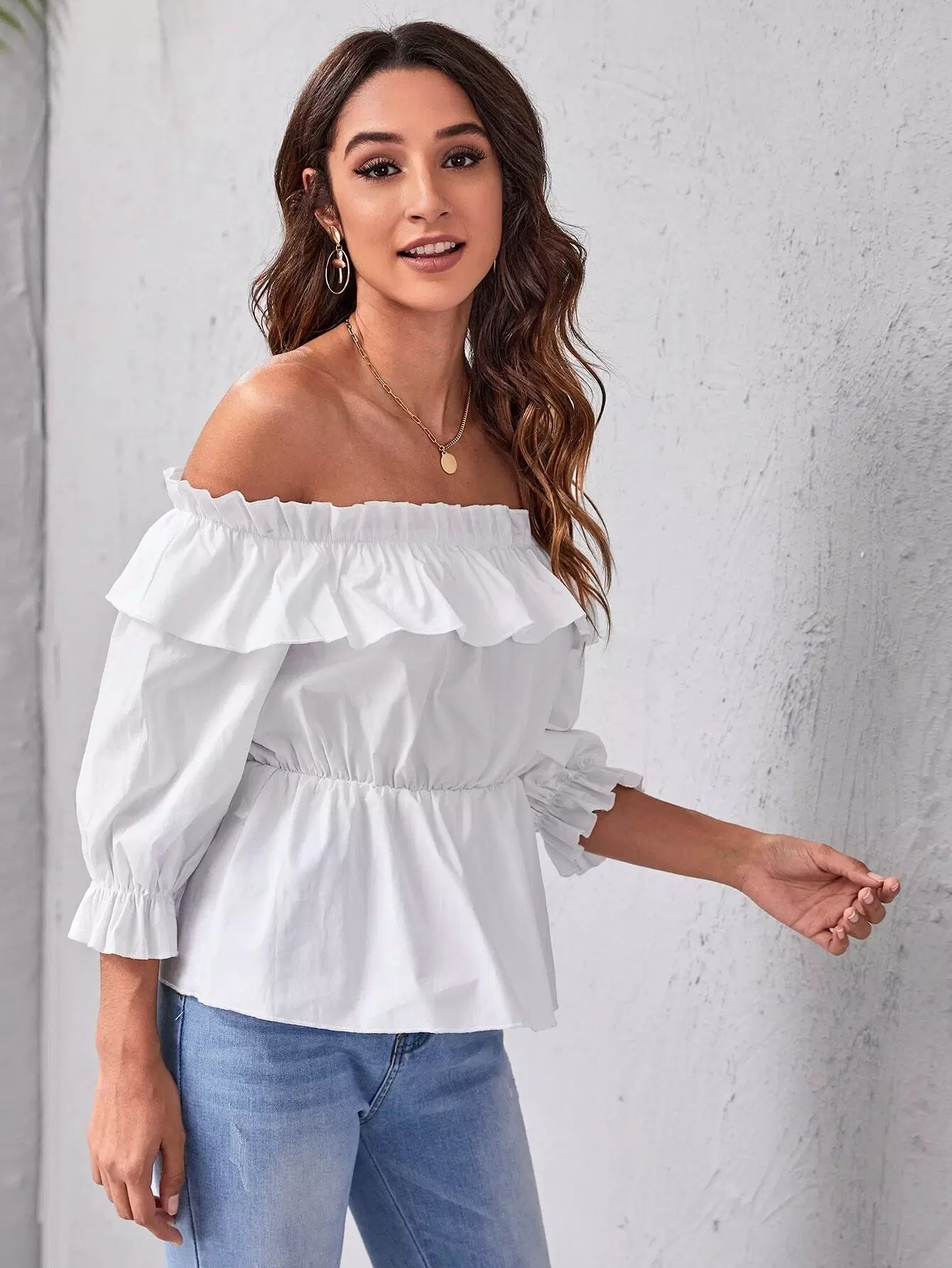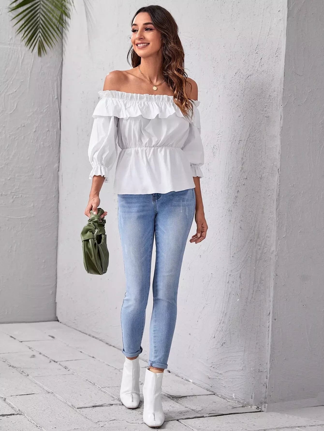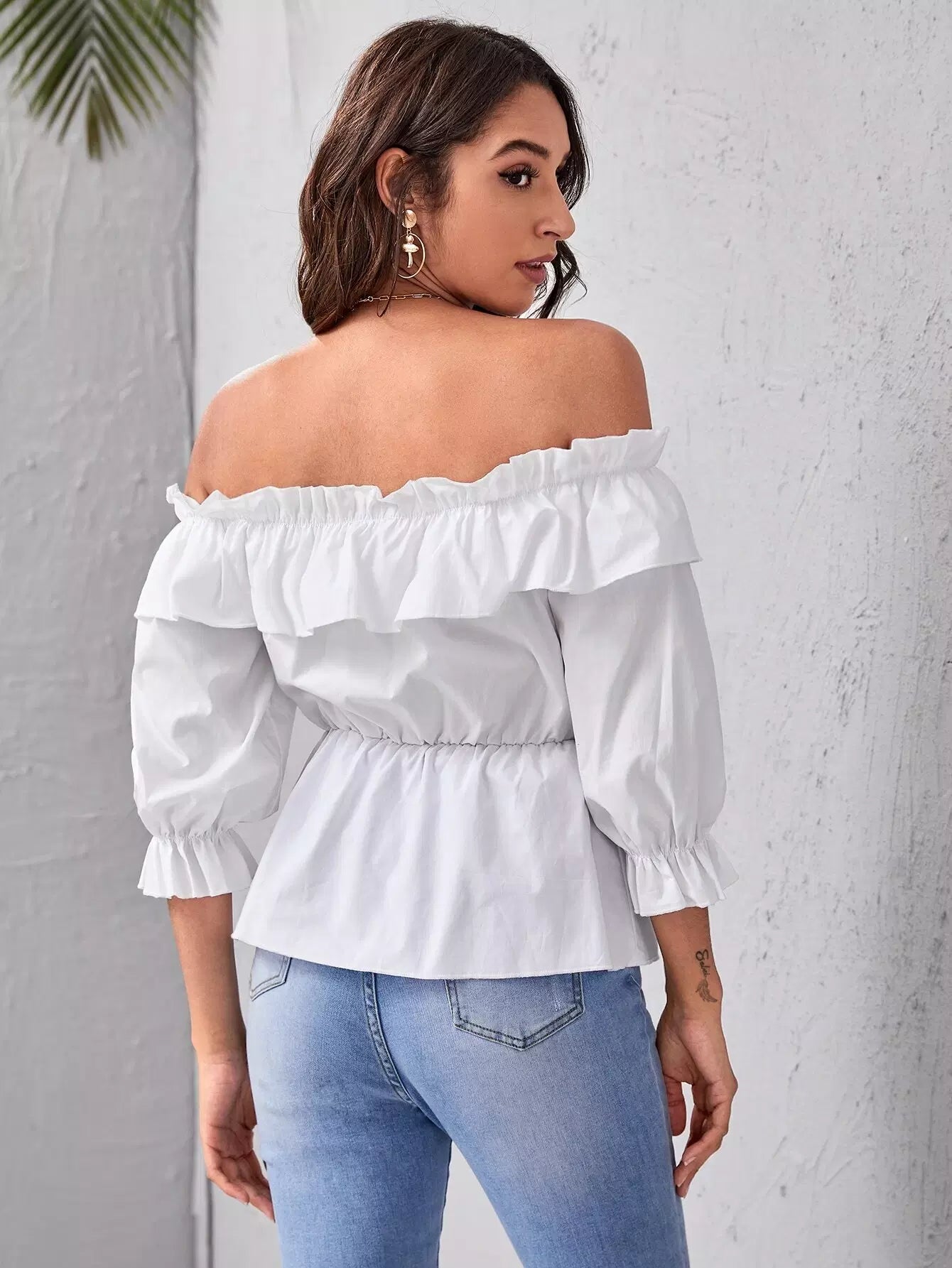 بلوزة كشكش بحواف مكشكشة من دون أكتاف