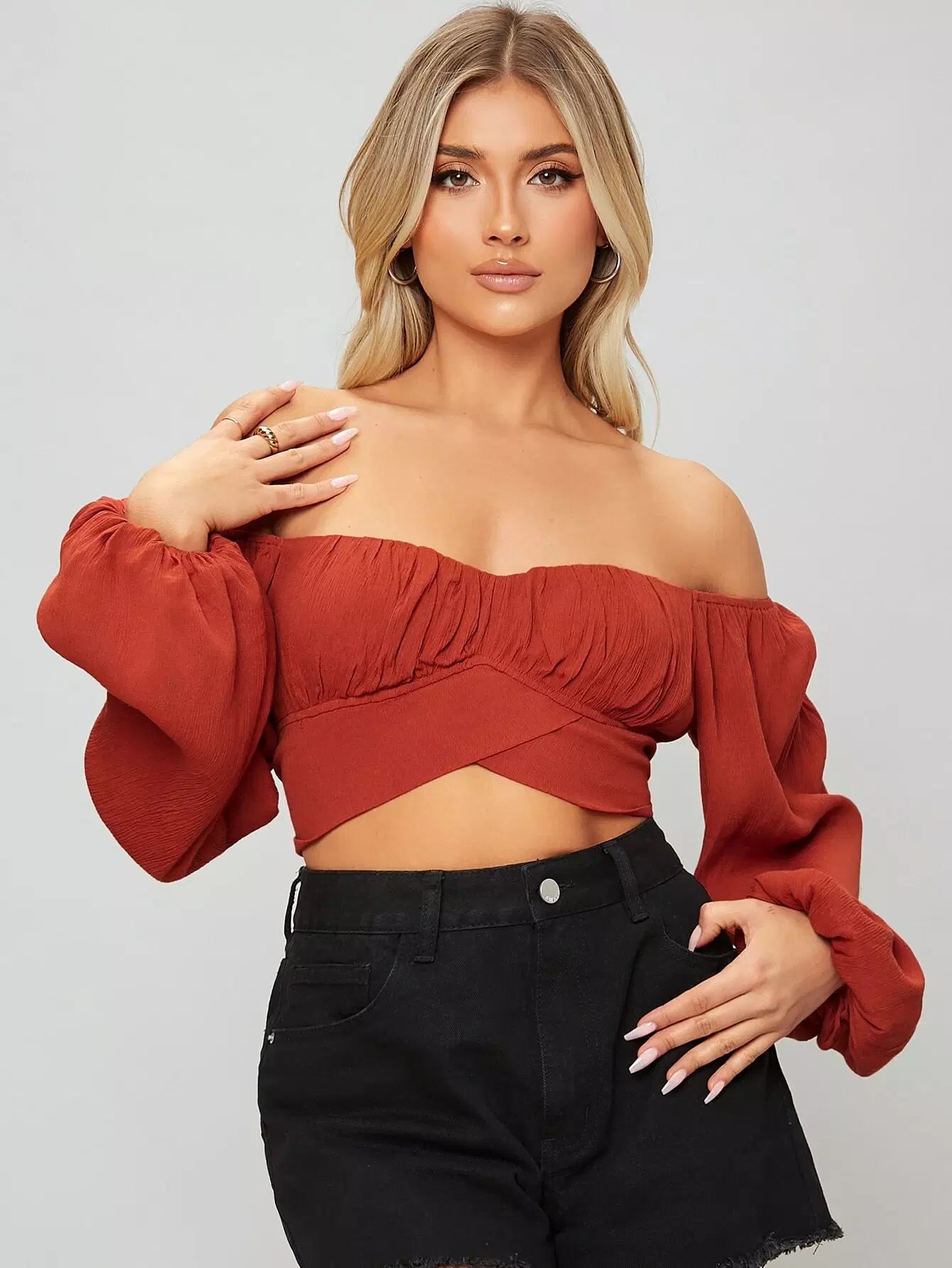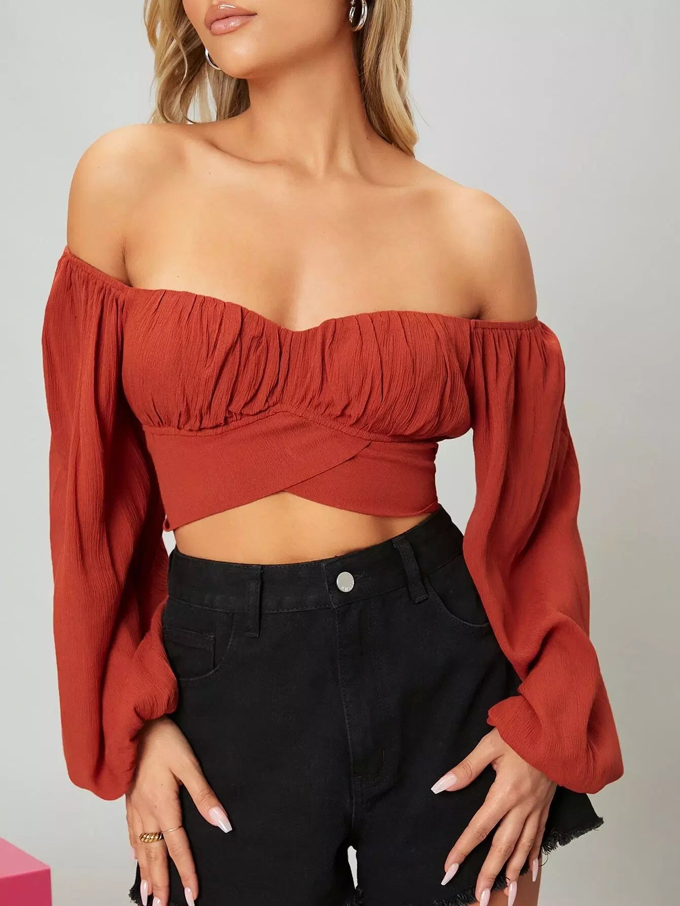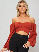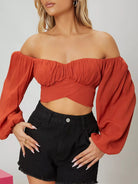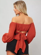 بلوزة قصيرة مكشوفة الكتفين بأكمام فلاحية مع رباط ذاتي