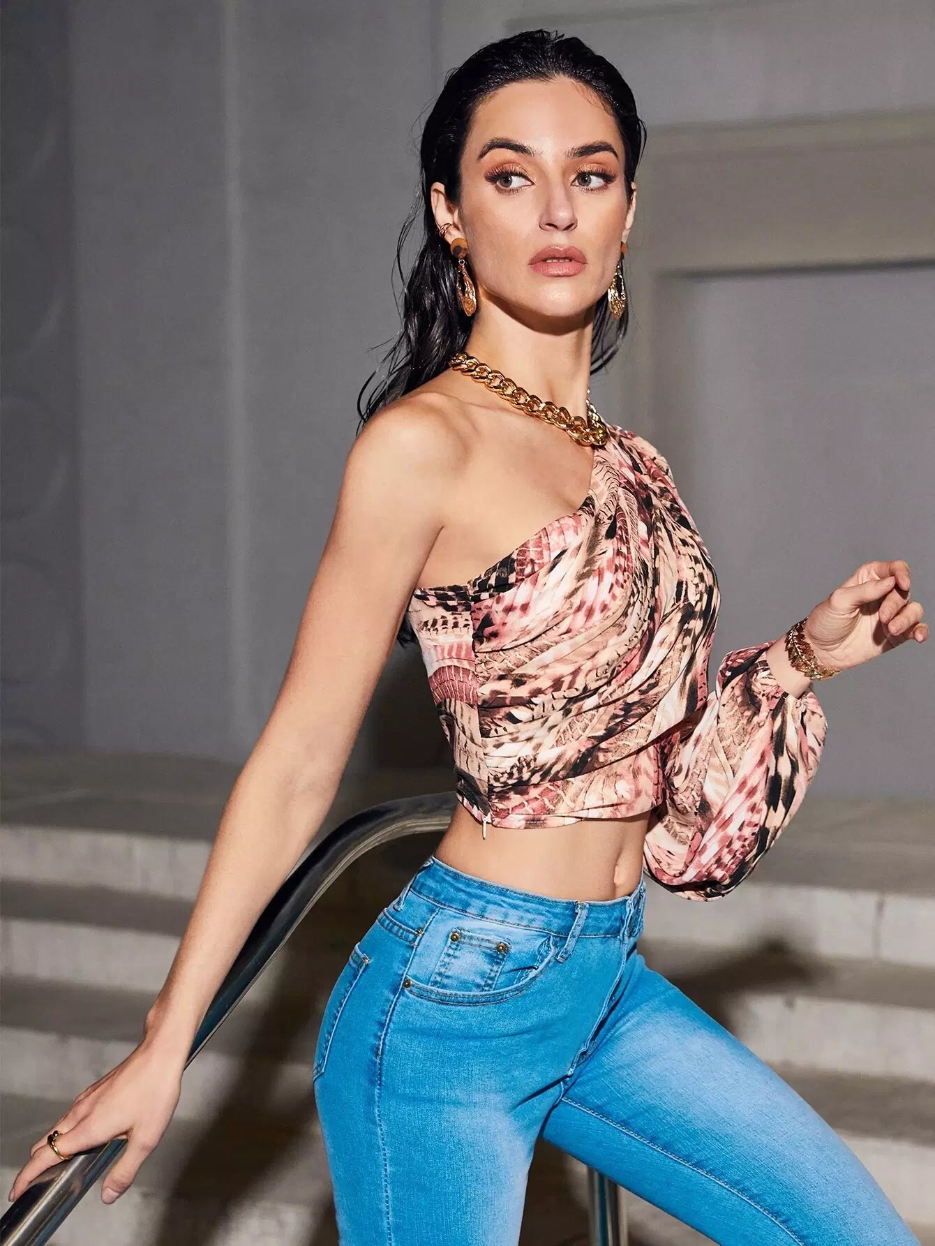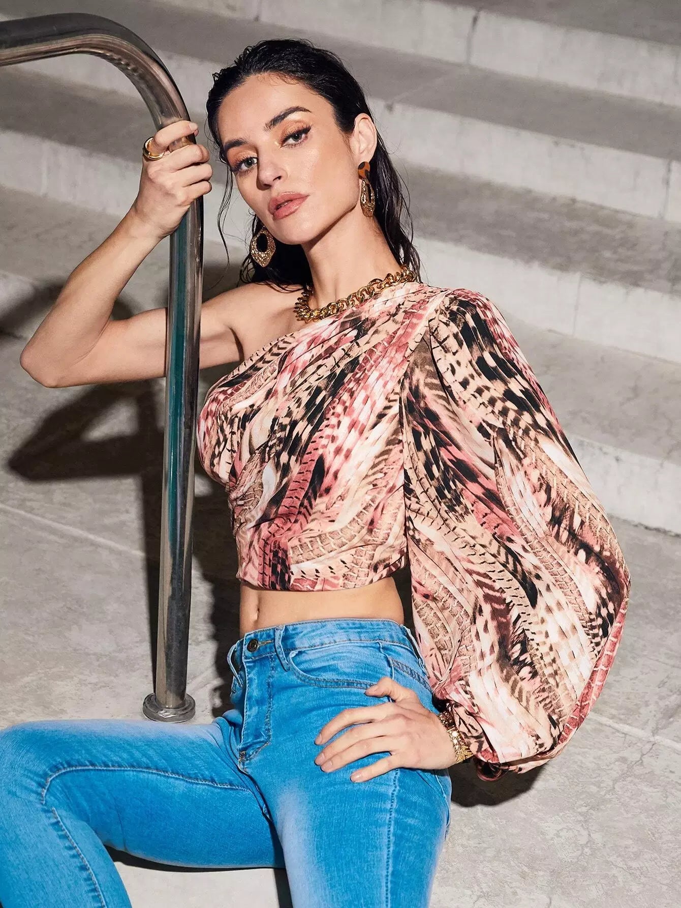 للنساء - بلوزة بكتف واحد وطبعة جلد الثعبان
