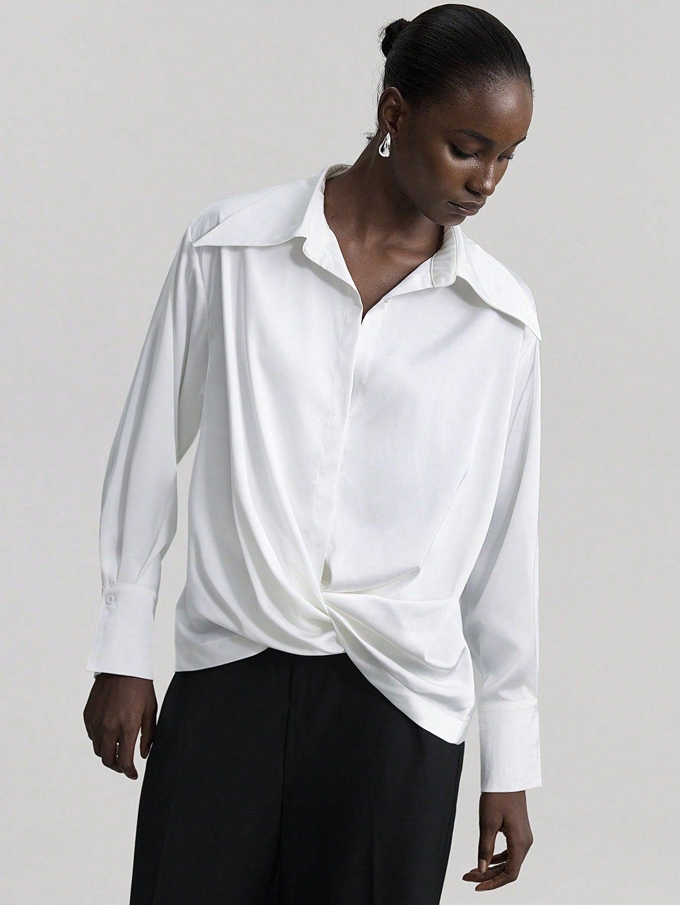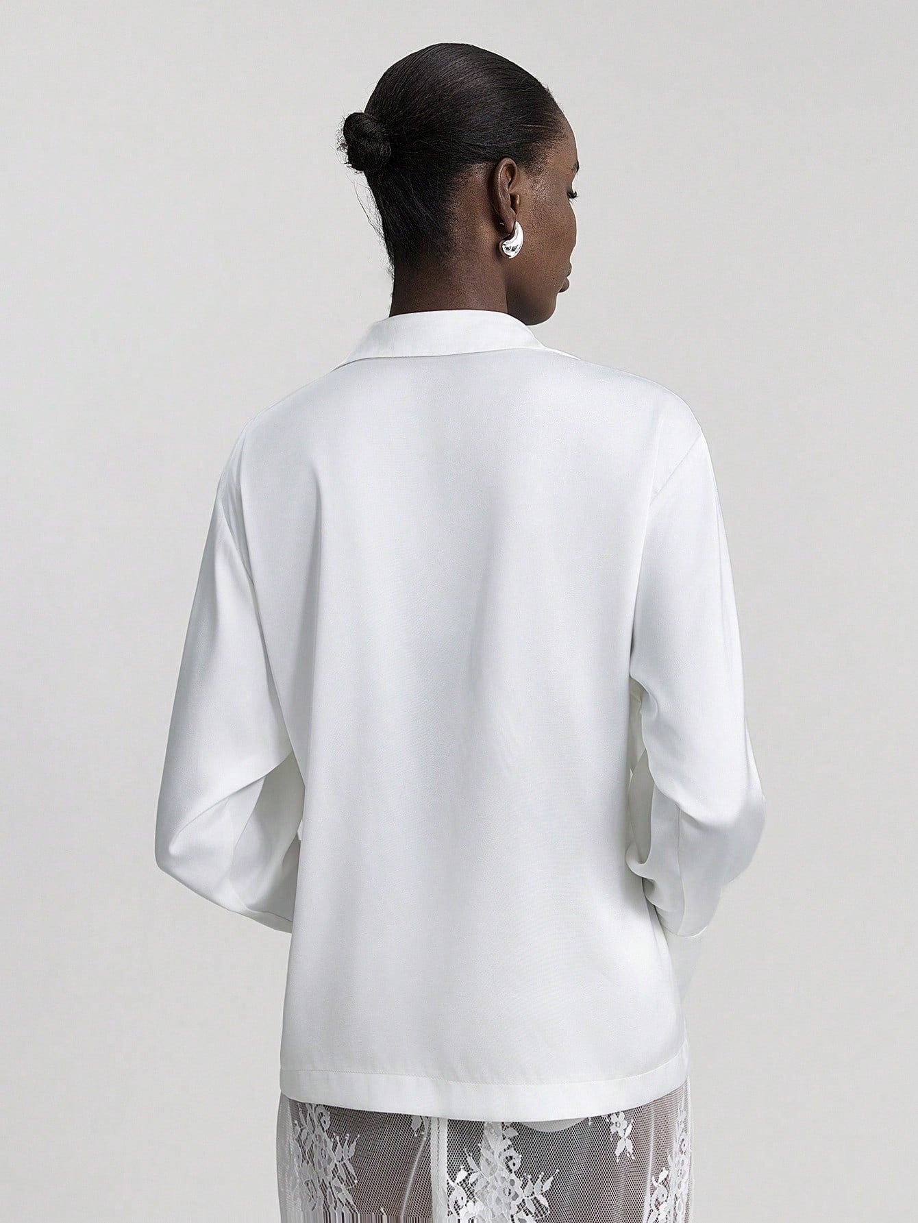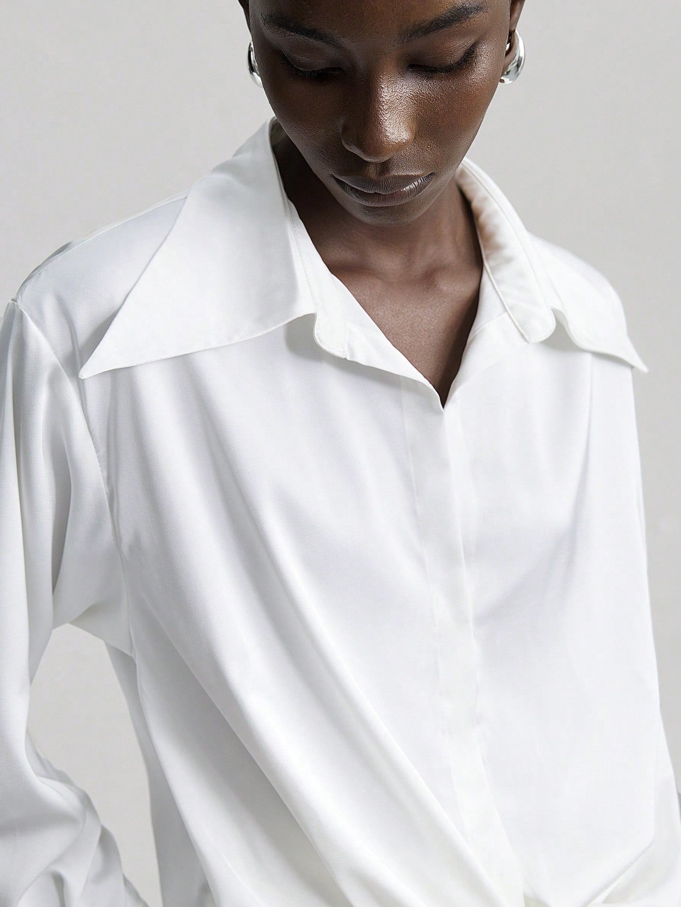 Ontre 2025 Spring & Summer Women's Solid White Shirt With Collar, Long Sleeve, Minimalist & Fashionable,