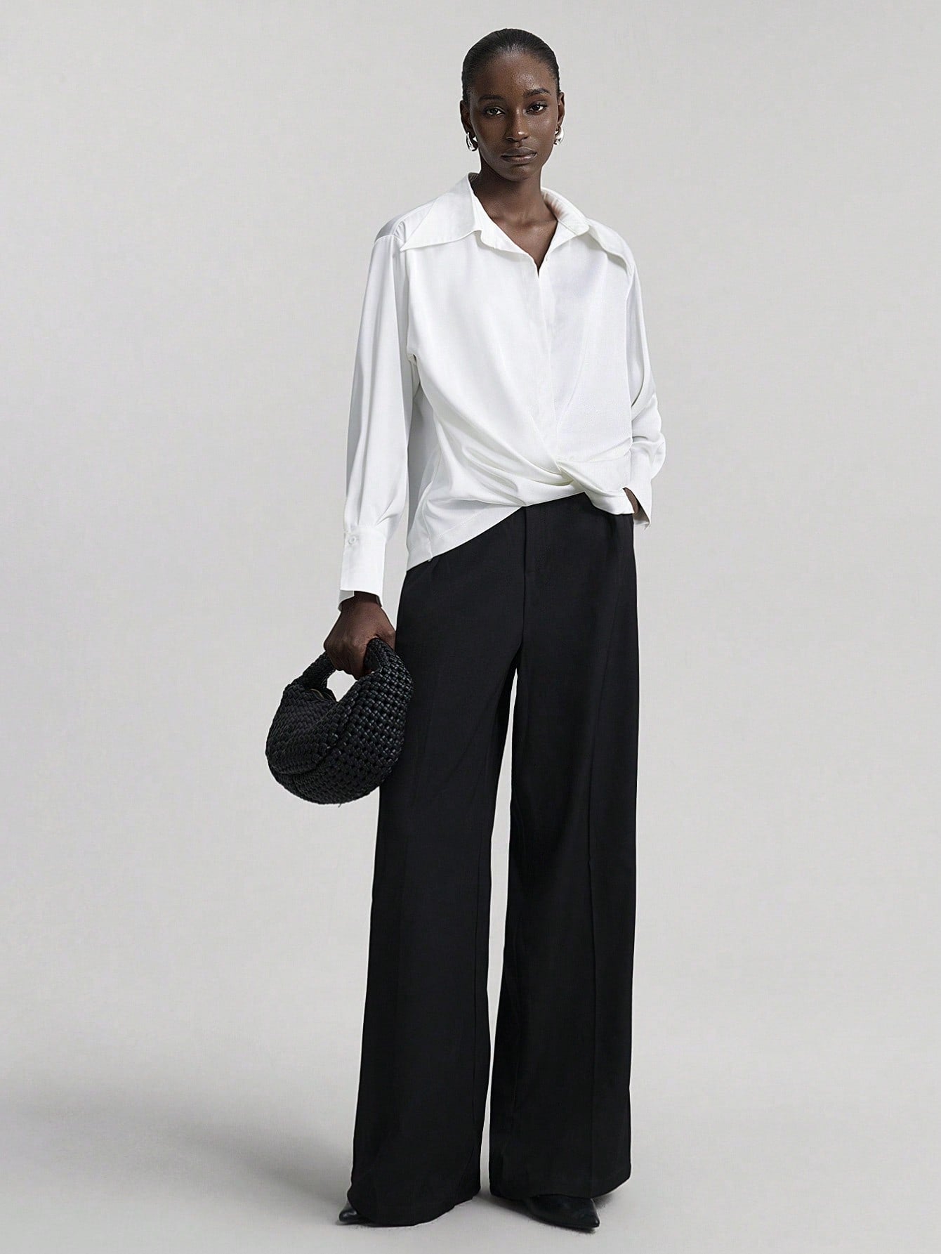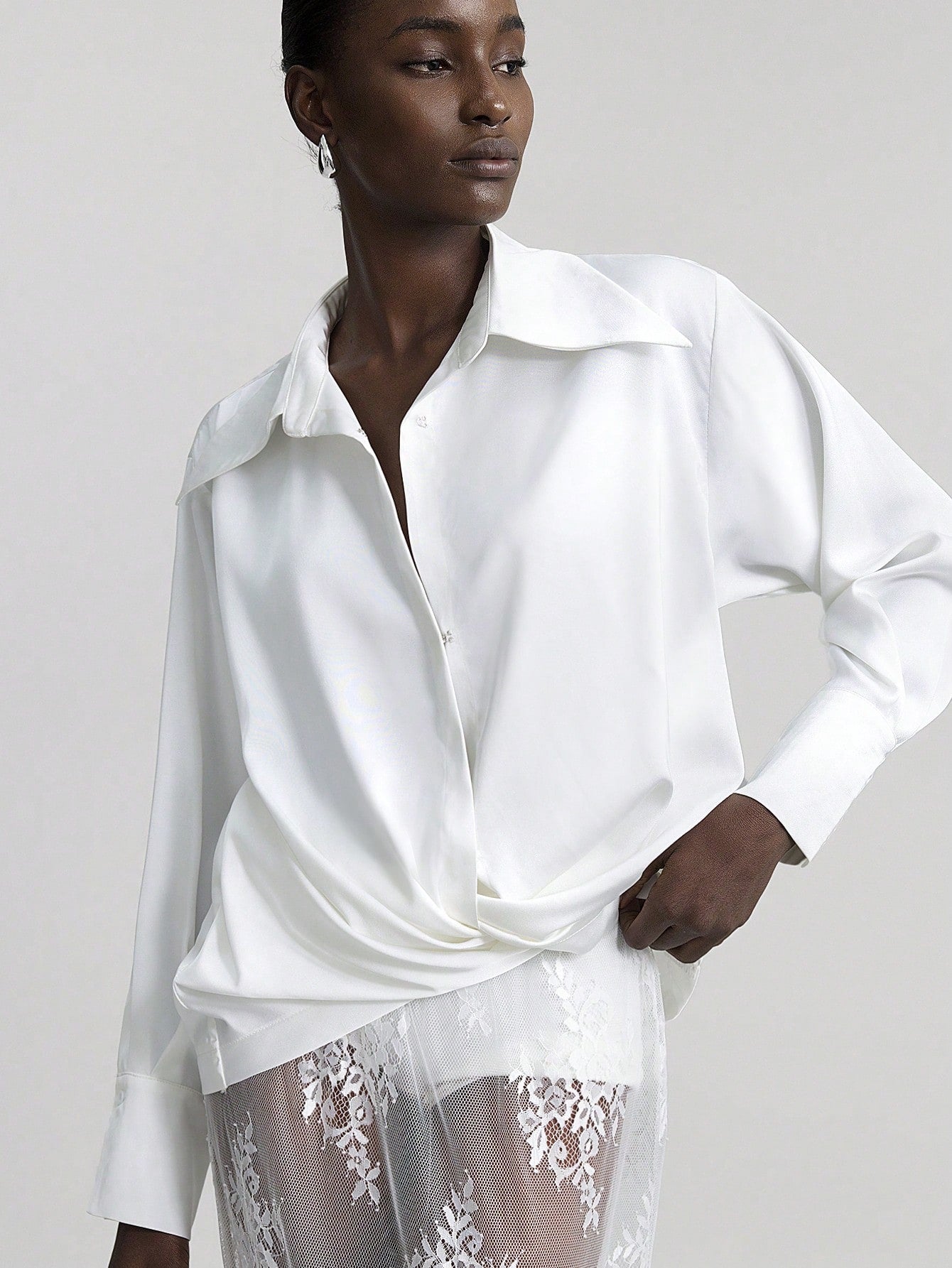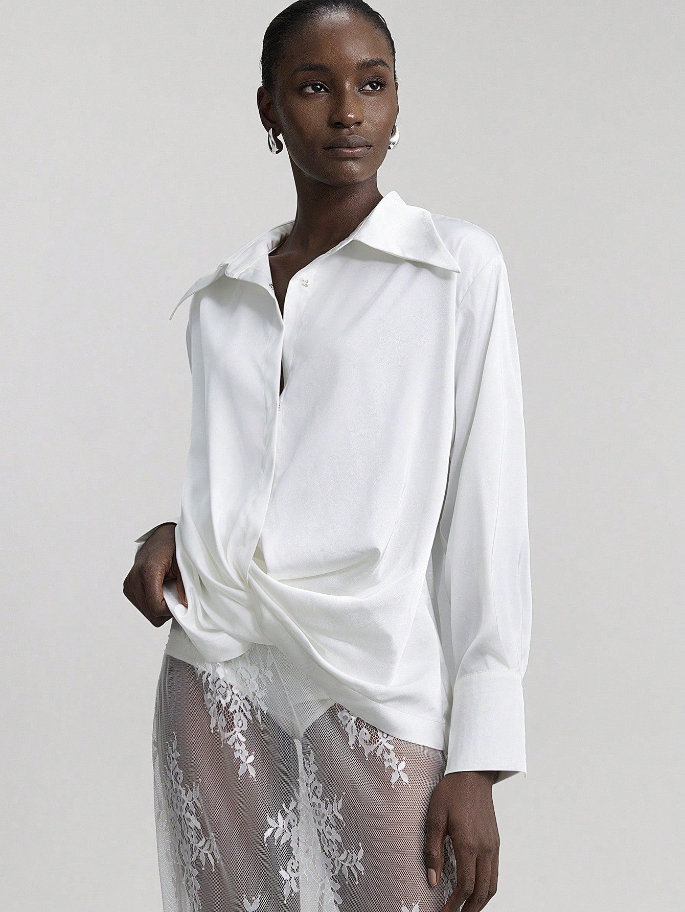 Ontre 2025 Spring & Summer Women's Solid White Shirt With Collar, Long Sleeve, Minimalist & Fashionable,