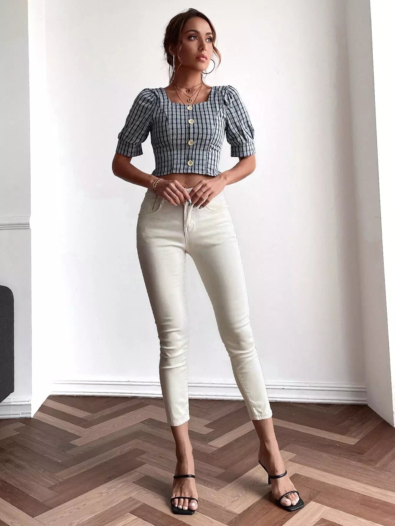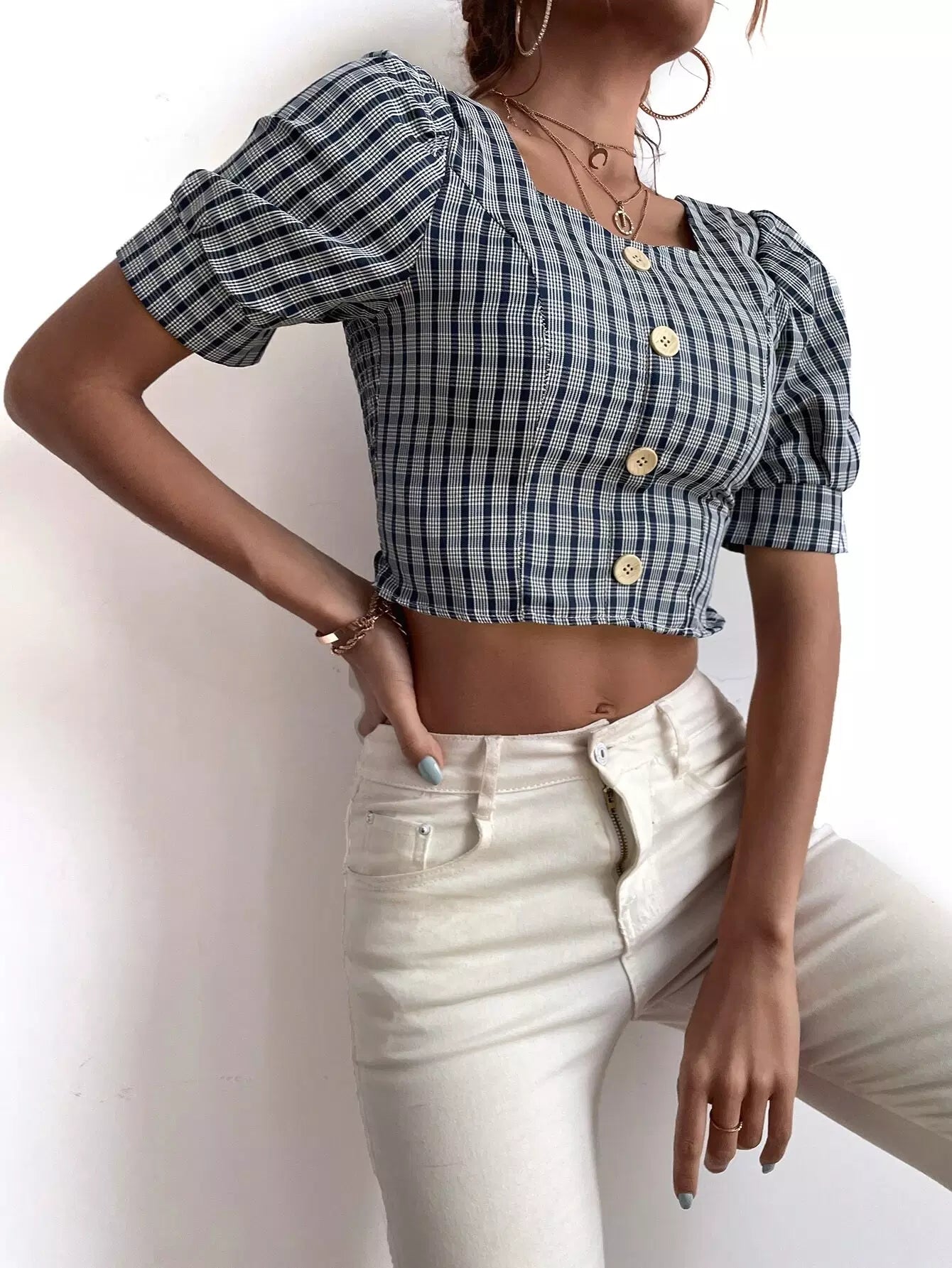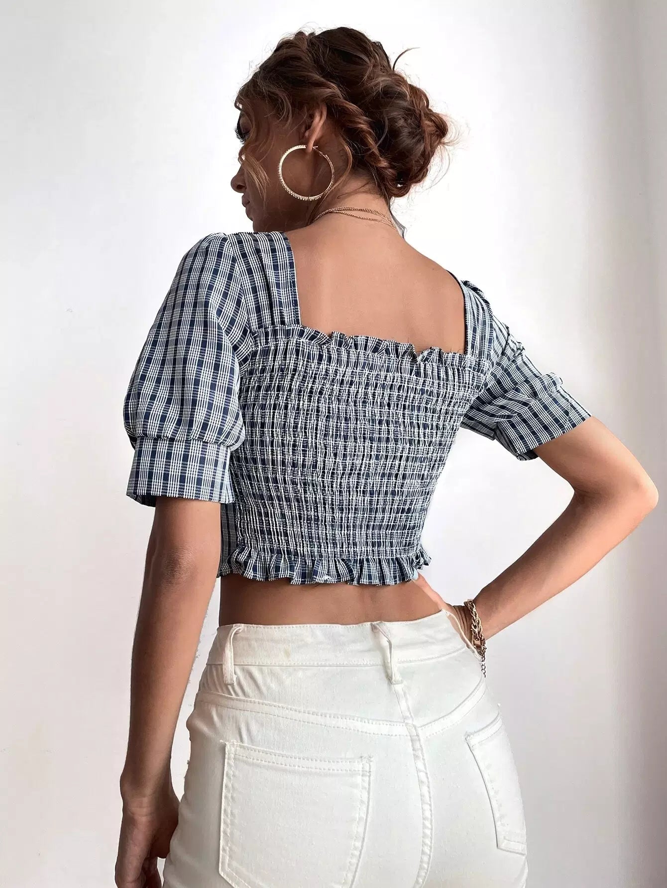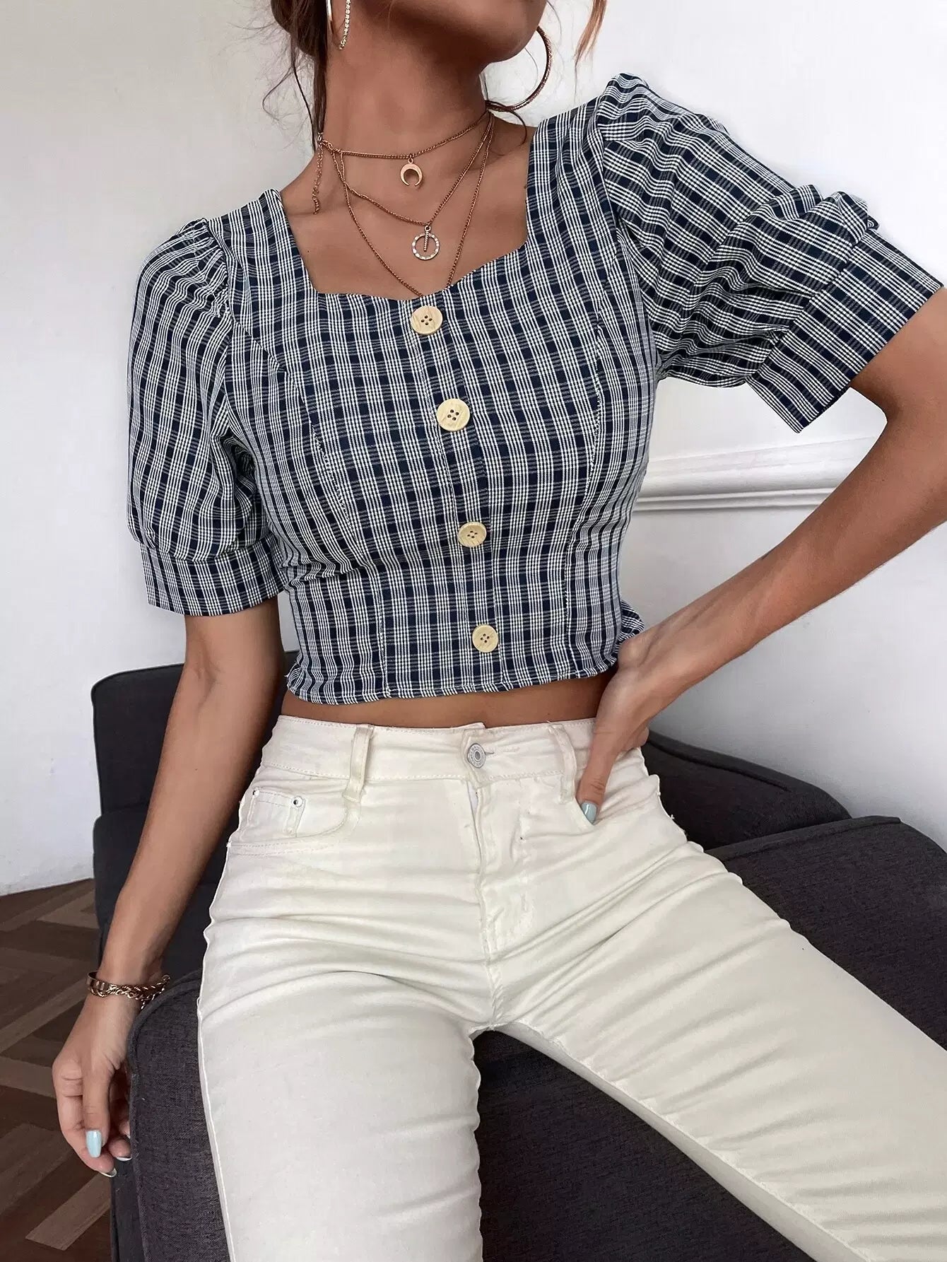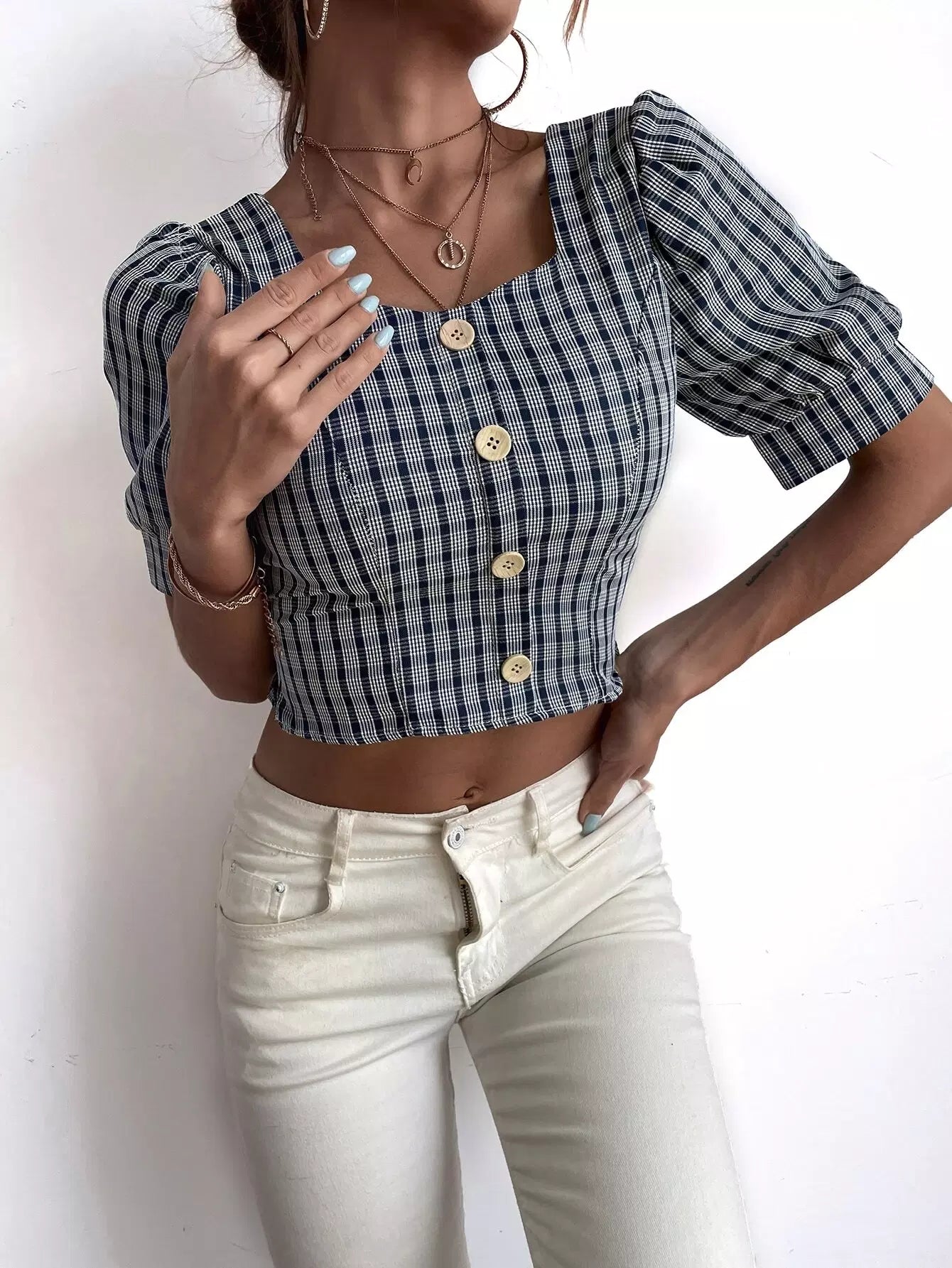 بلوزة قصيرة منقوشة بأزرار أمامية منقوشة