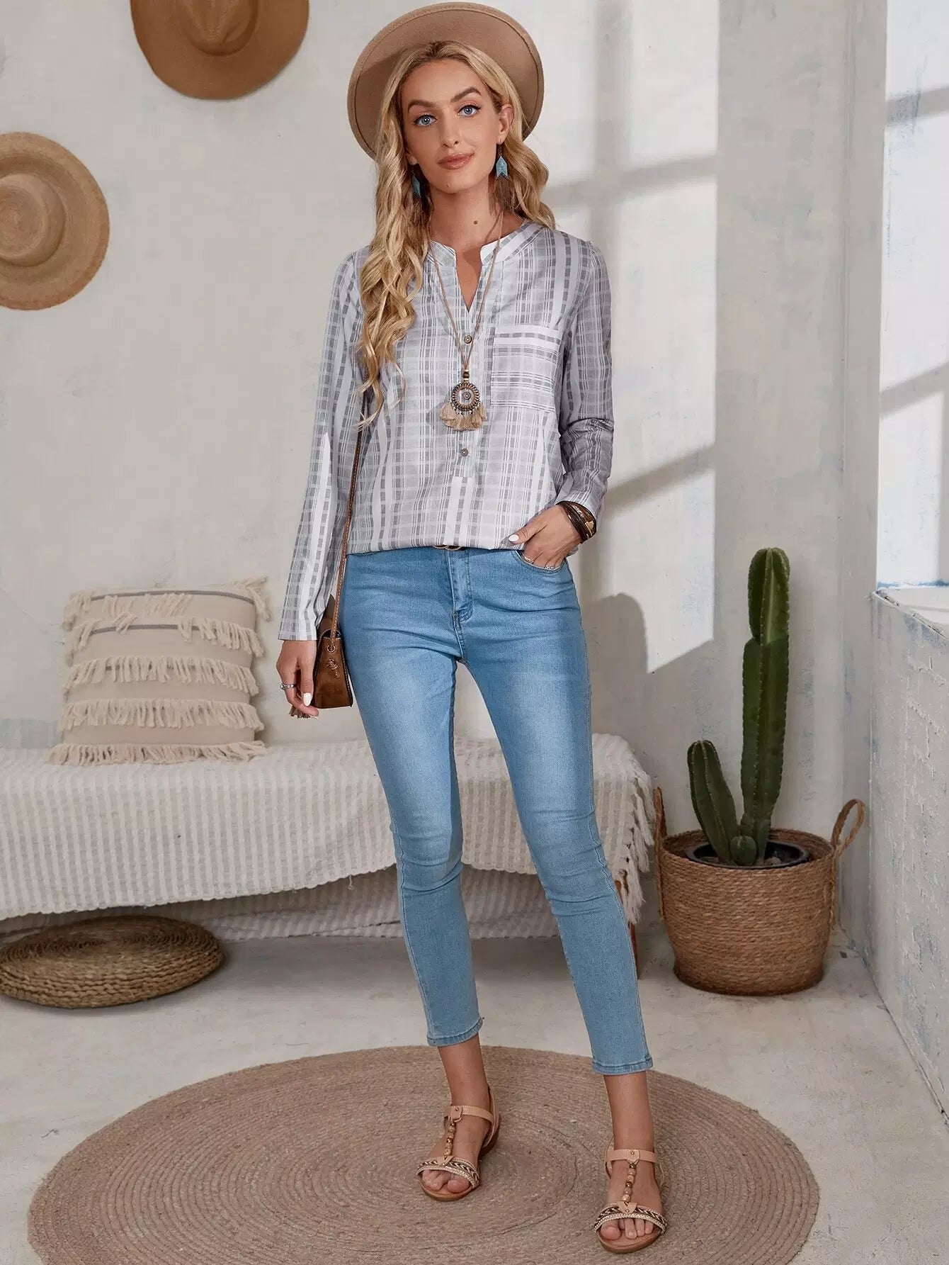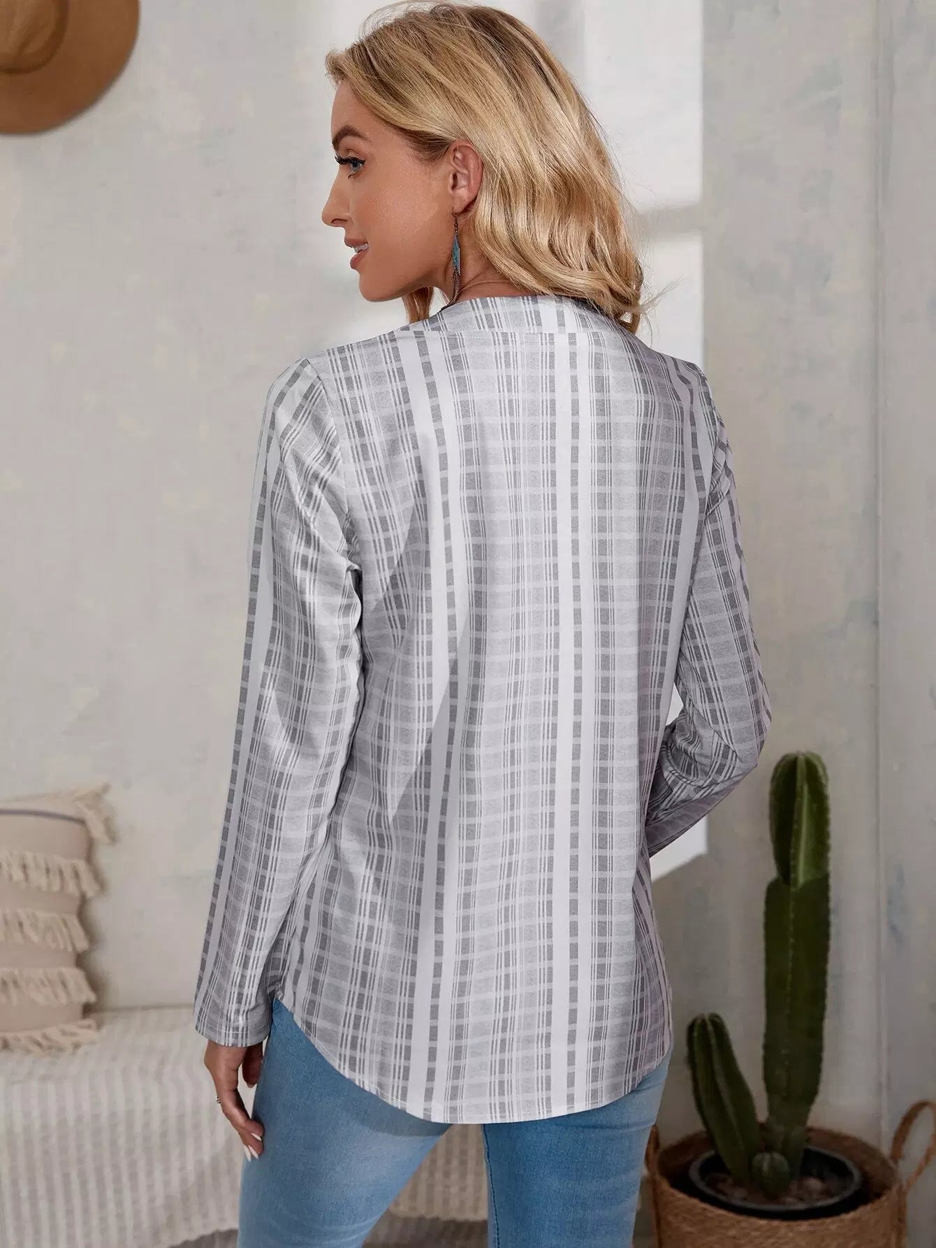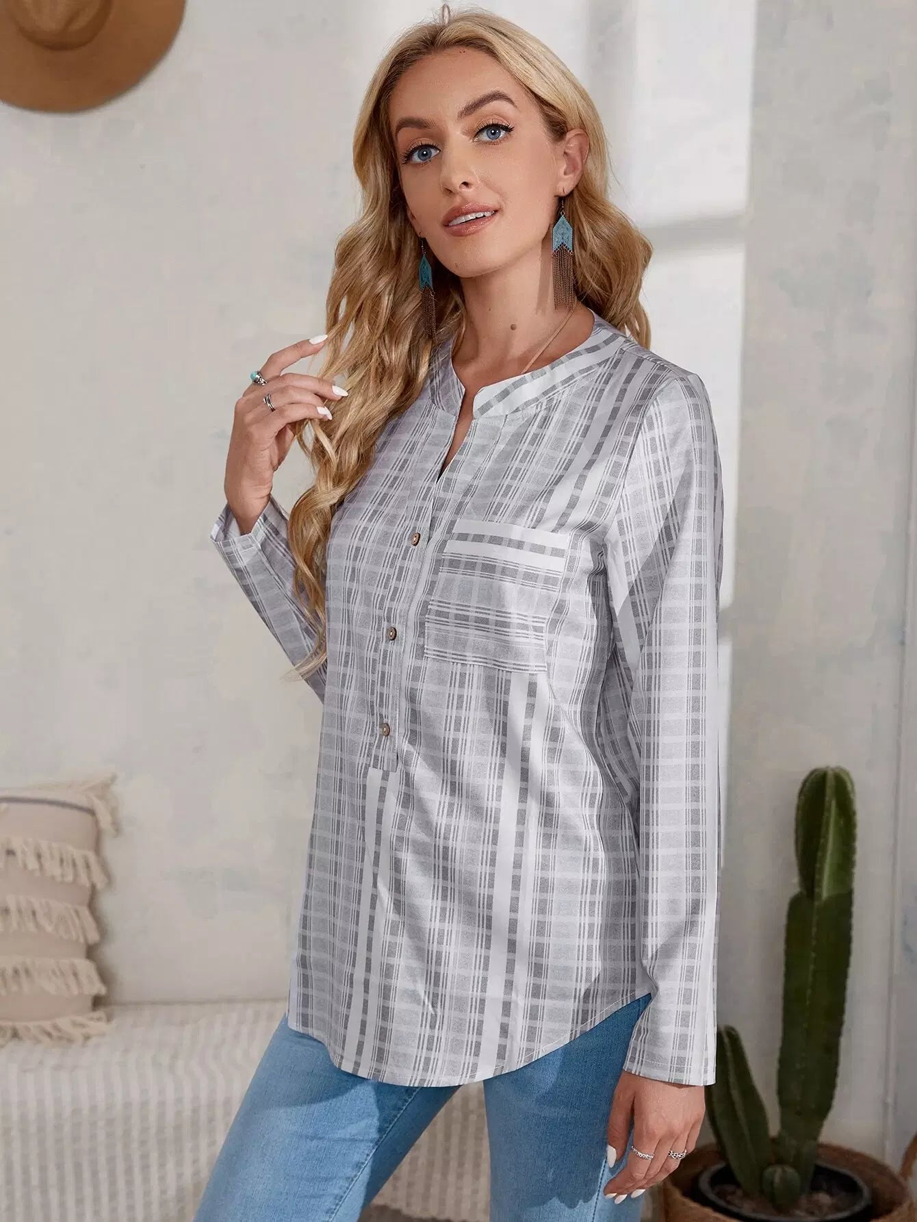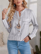 بلوزة منقوشة بجيب منقوش بنصف زر منقوش