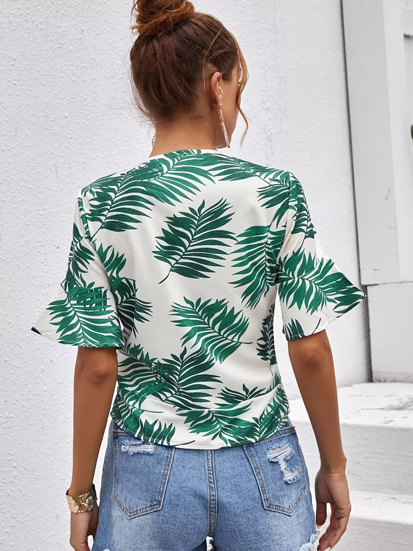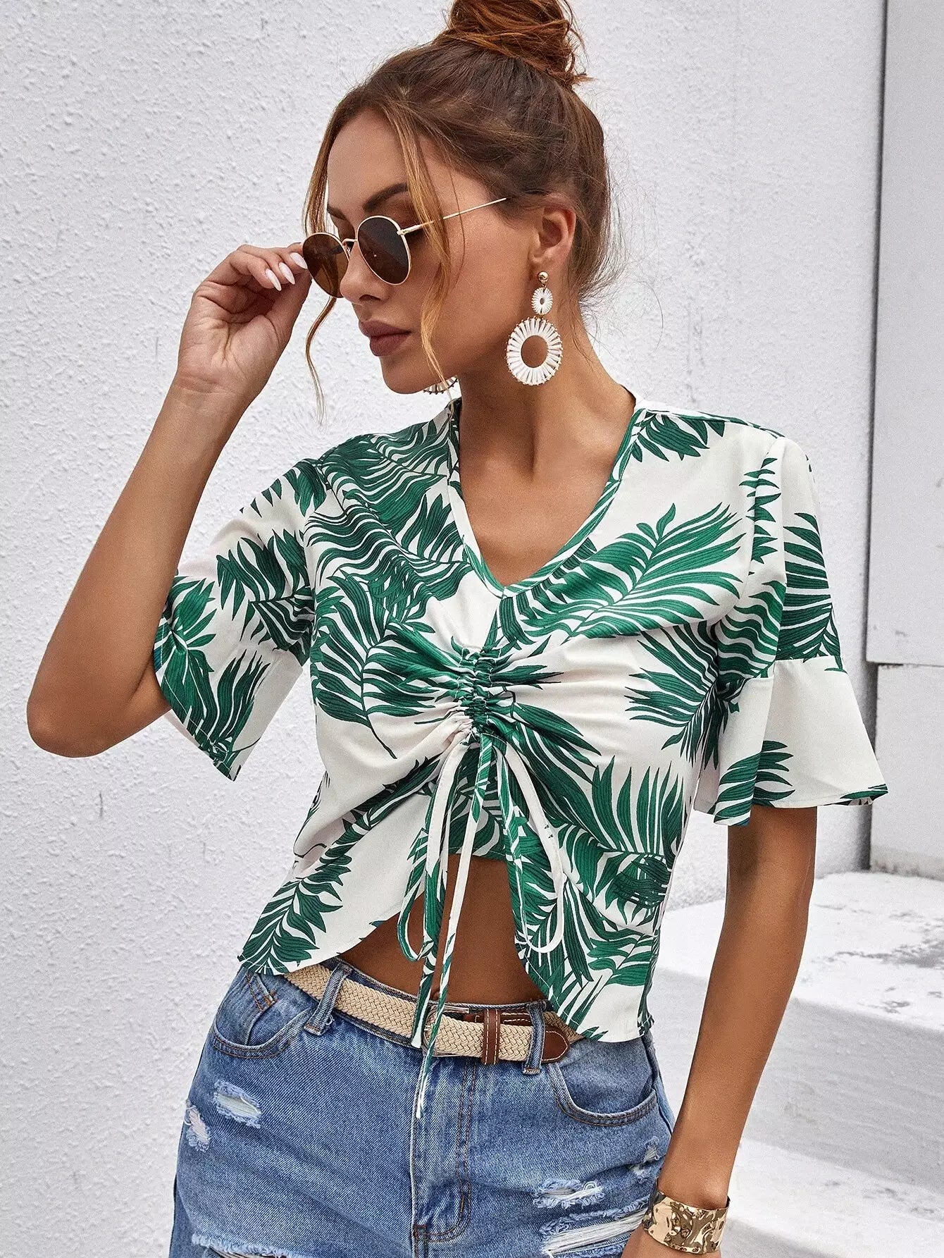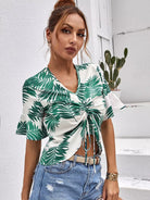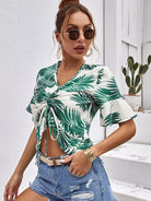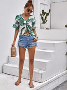 بلوزة بأكمام منفوشة بأربطة أمامية مطبوع عليها نباتات