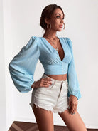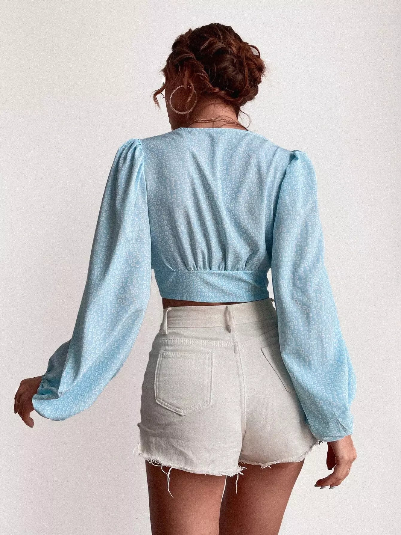 بلوزة قصيرة بأكمام منفوخة بفتحة رقبة واسعة منفوشة