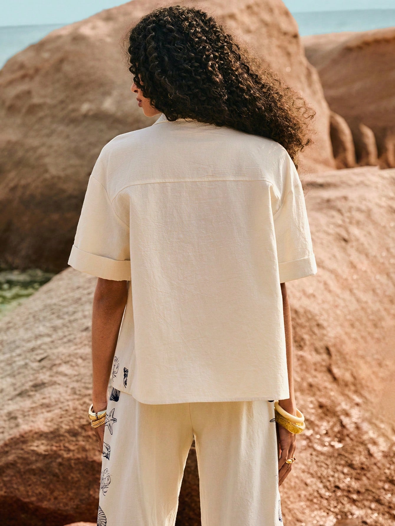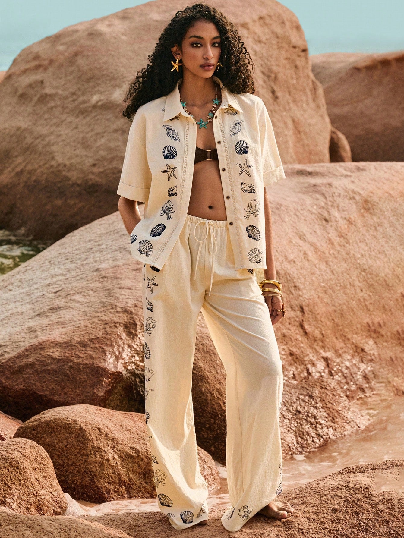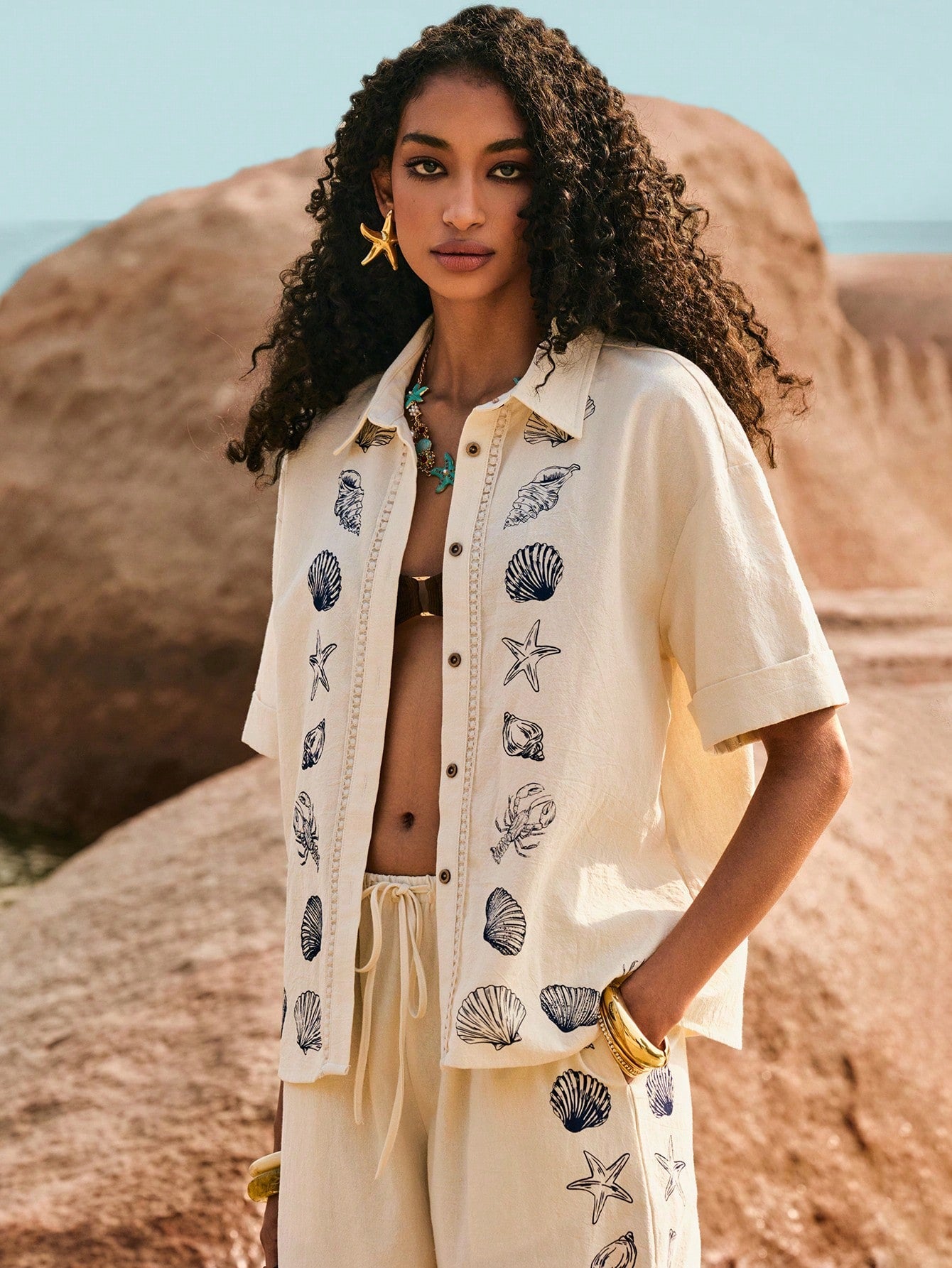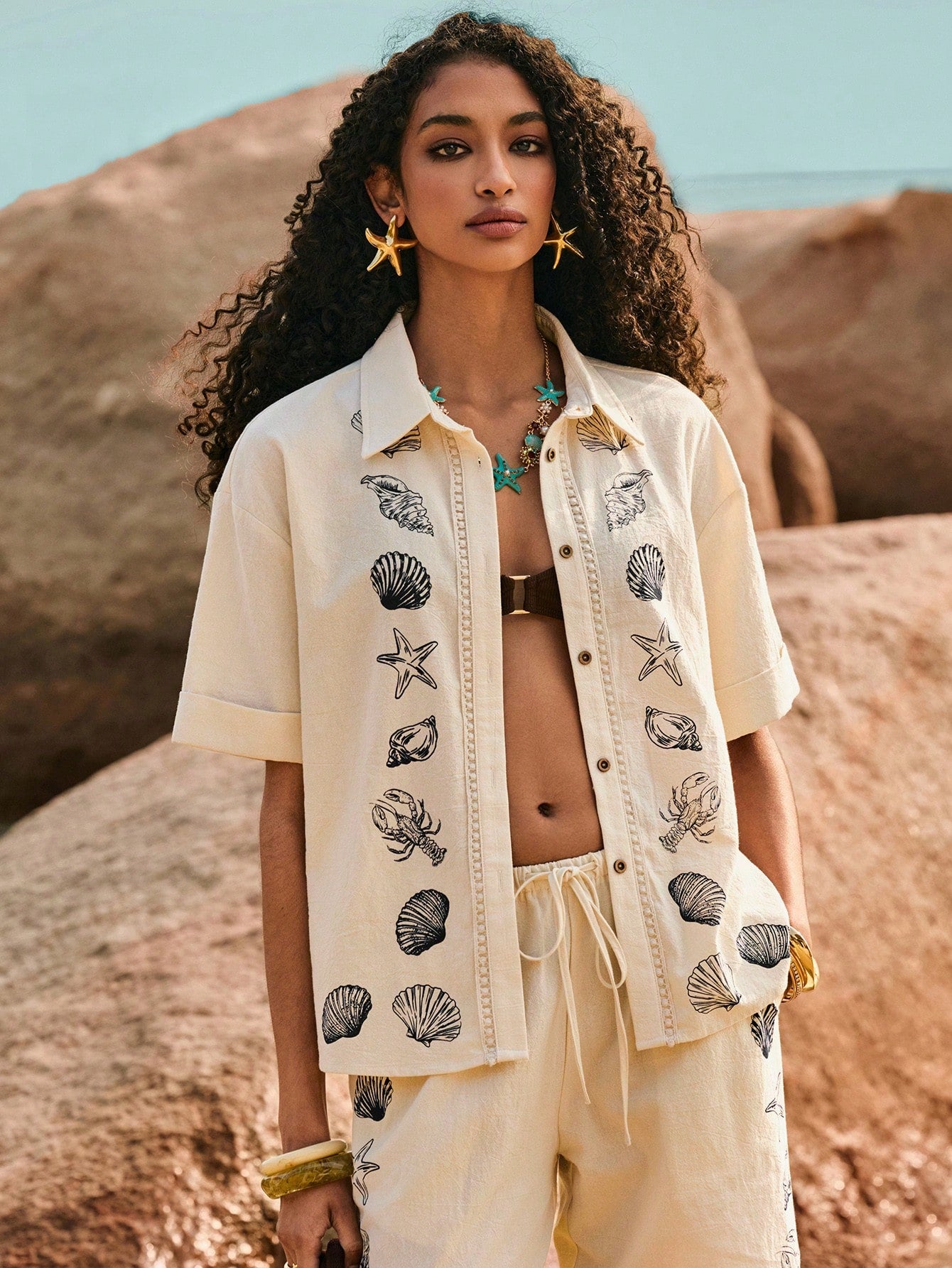 قميص Poï½selle نسائي كاجوال مريح بكتف منسدل وزر واحد وطبعة نجمة البحر