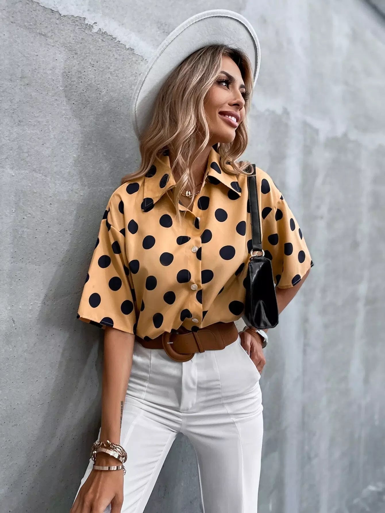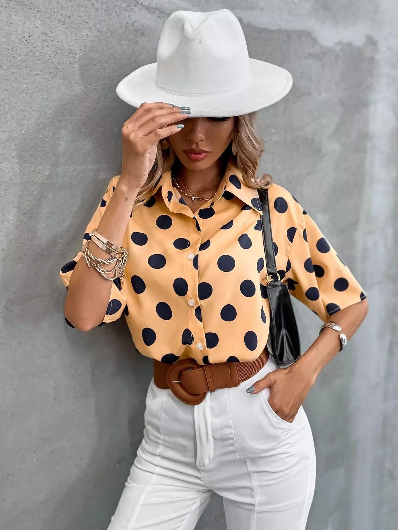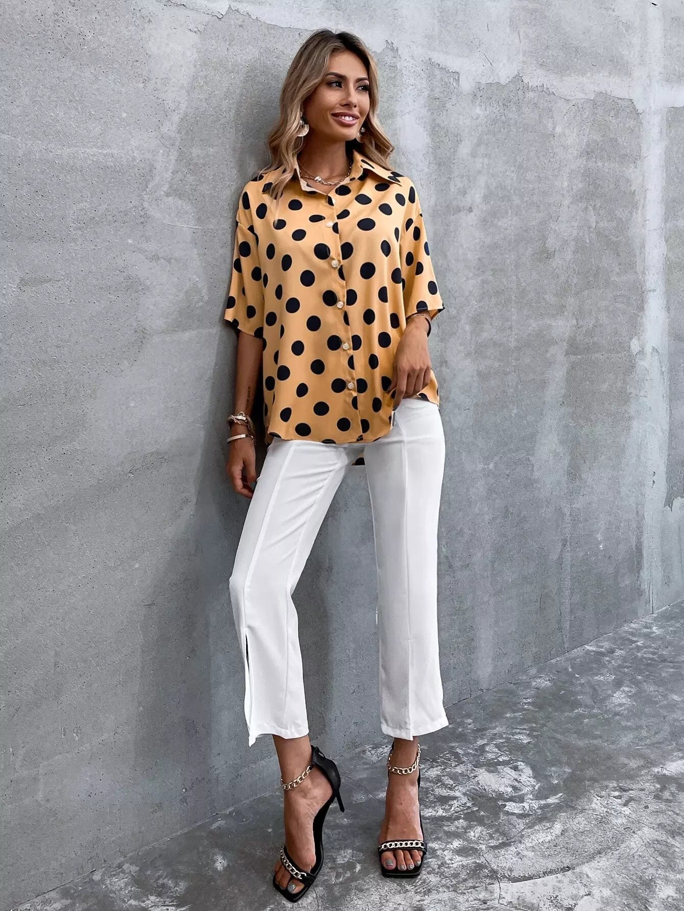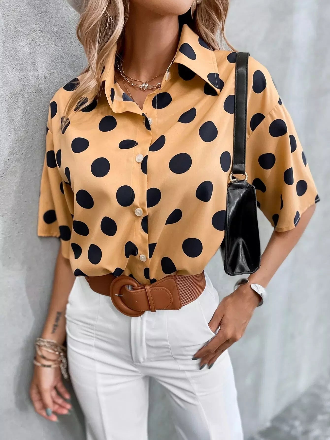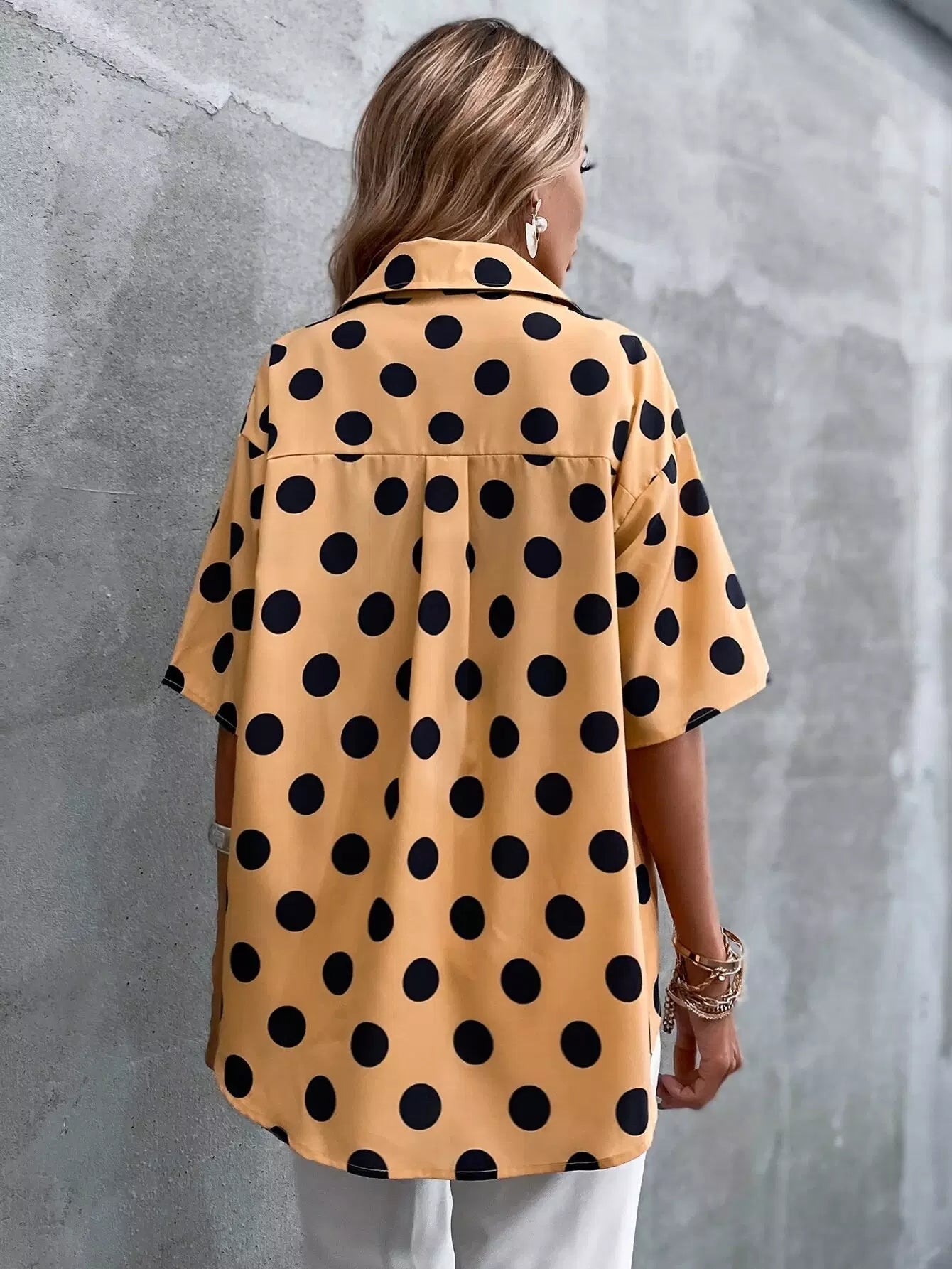 بلوزة بأزرار منقطة منسدلة منسدلة من الأمام بأزرار منسدلة على الكتف