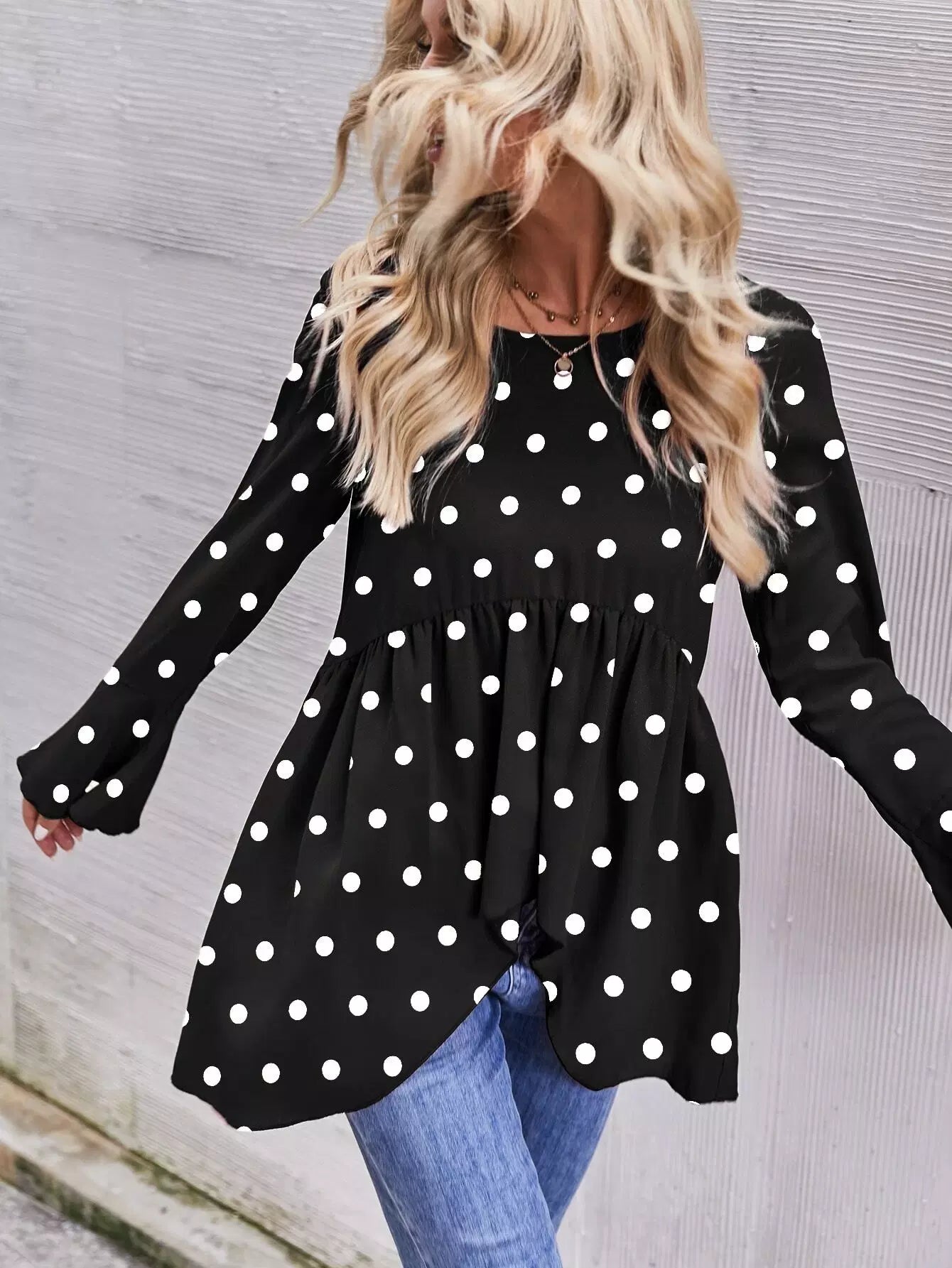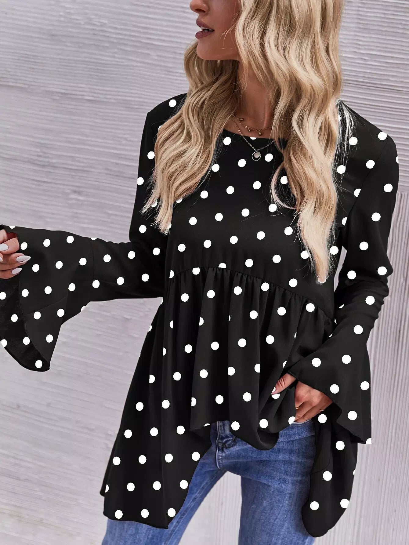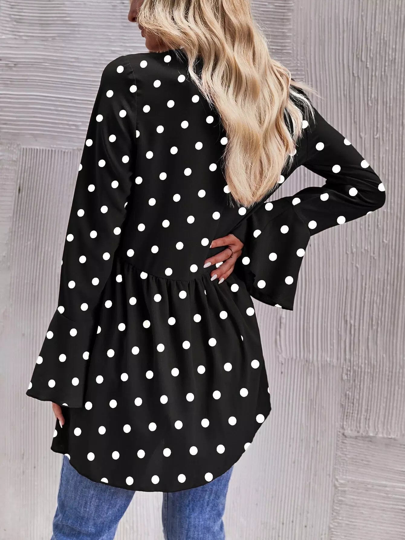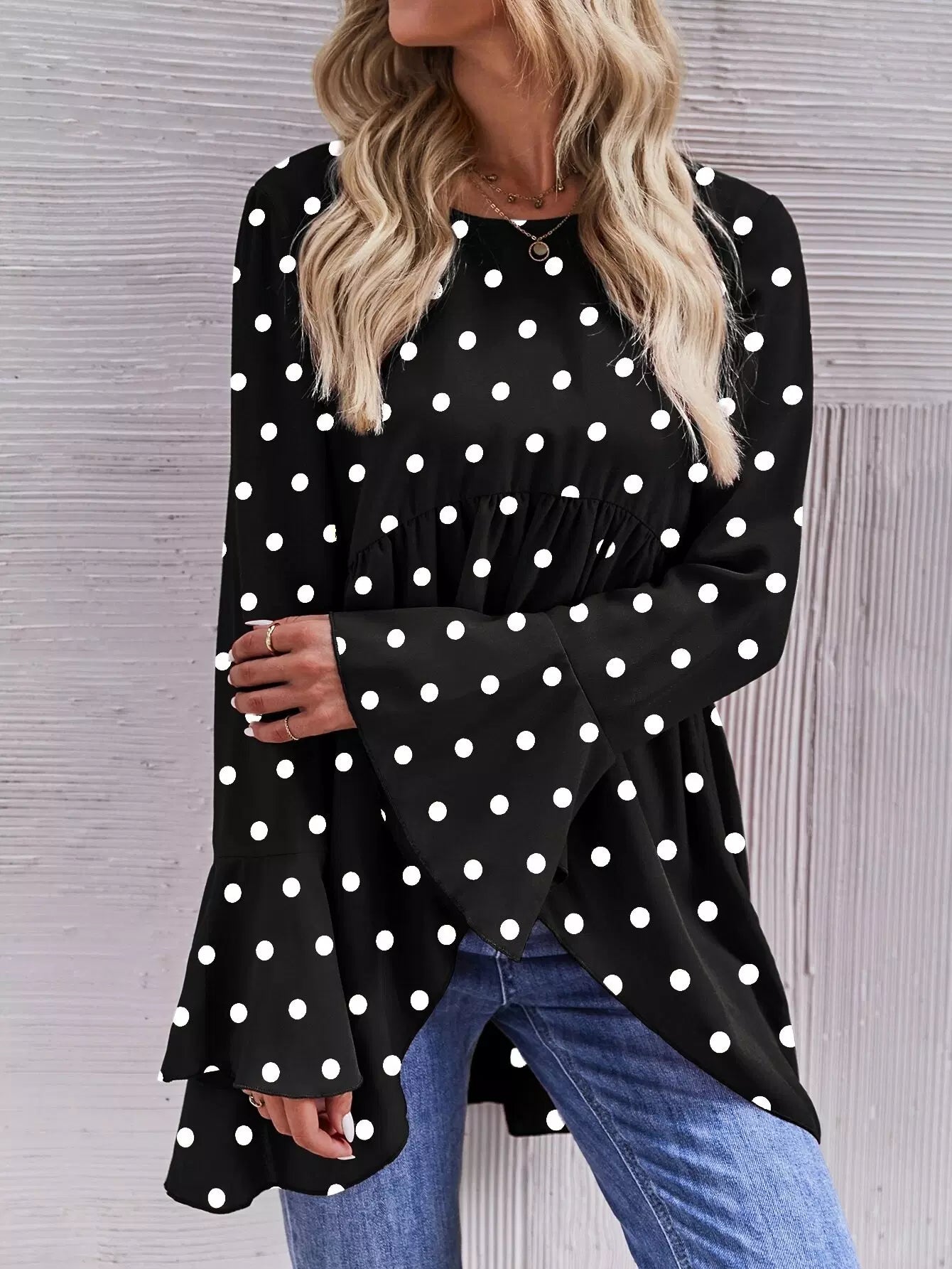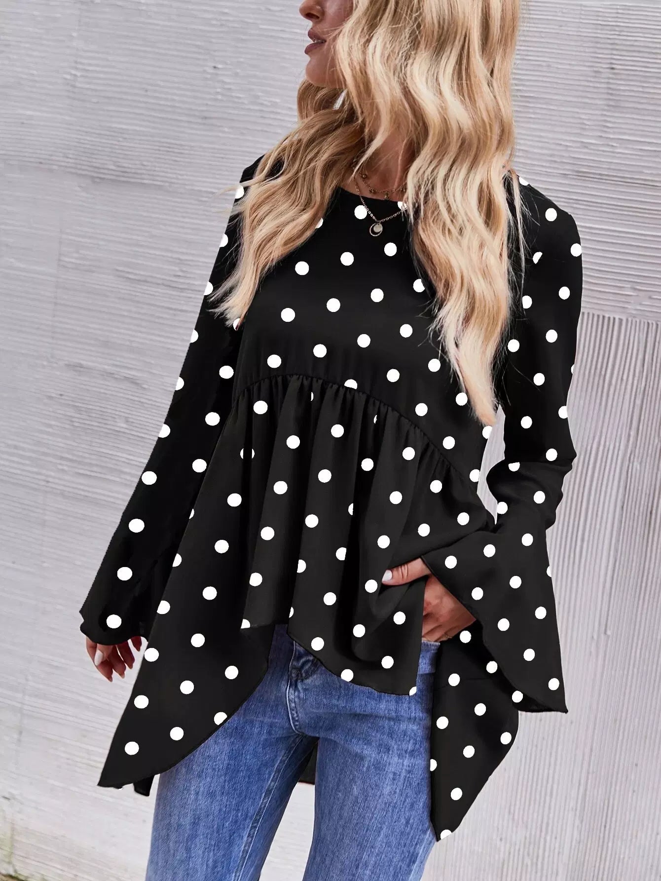 بلوزة منقطة بأكمام منفوشة بأكمام منفوشة بأكمام منفوشة بحاشية بيبلوم عالية منخفضة