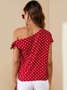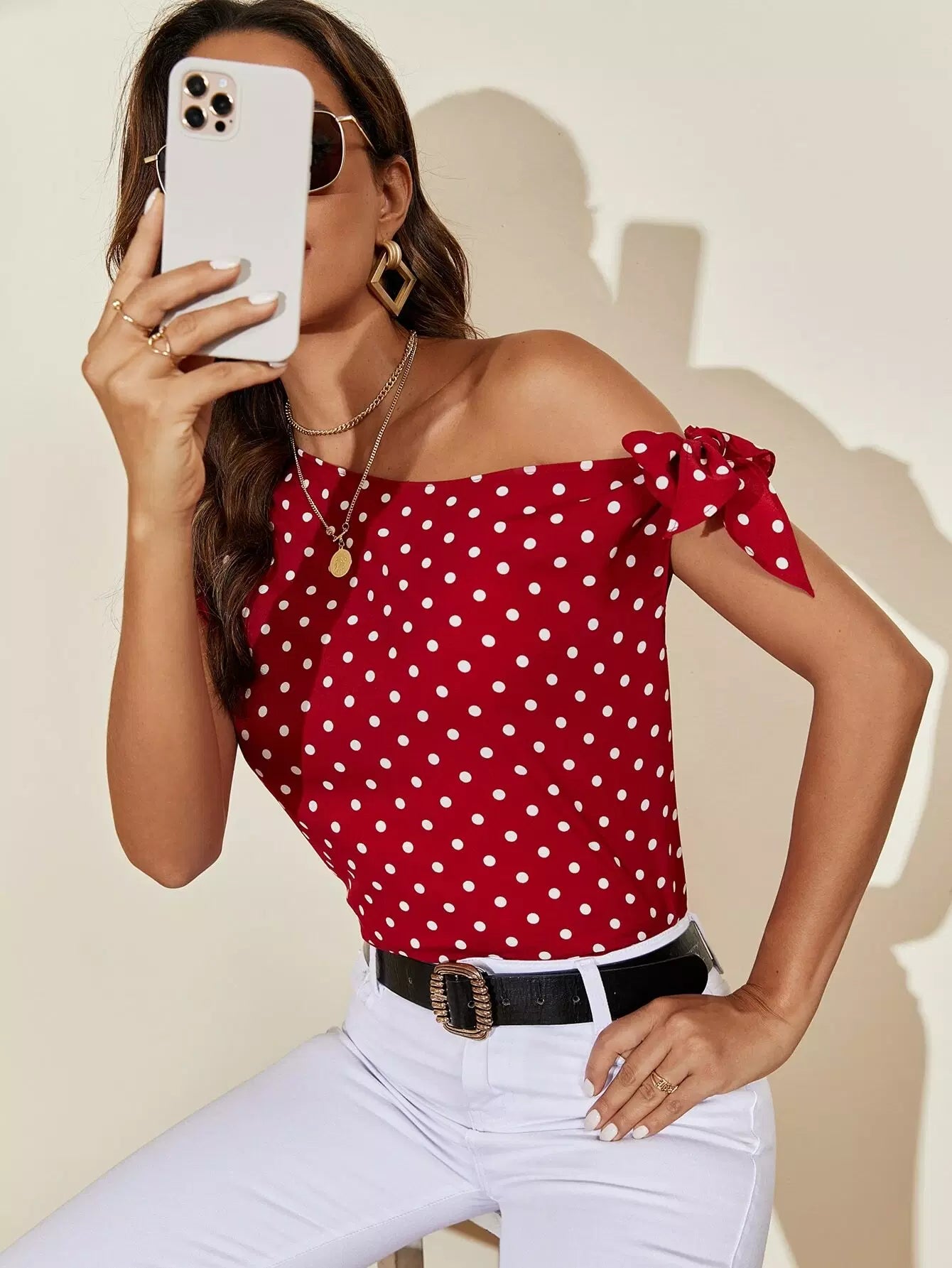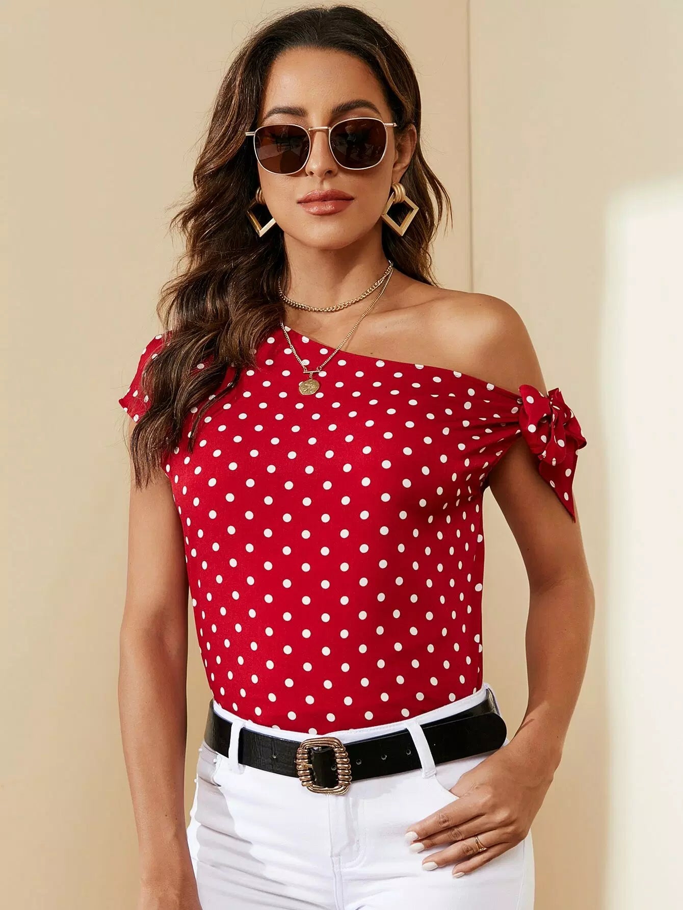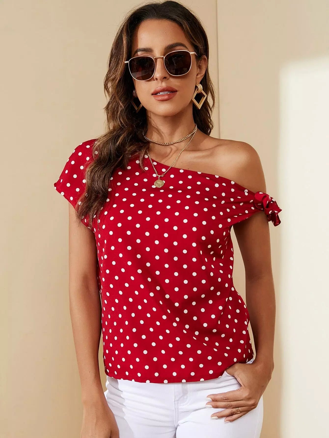 بلوزة برقبة غير متناسقة مطبوعة بنقشة البولكا المنقطة
