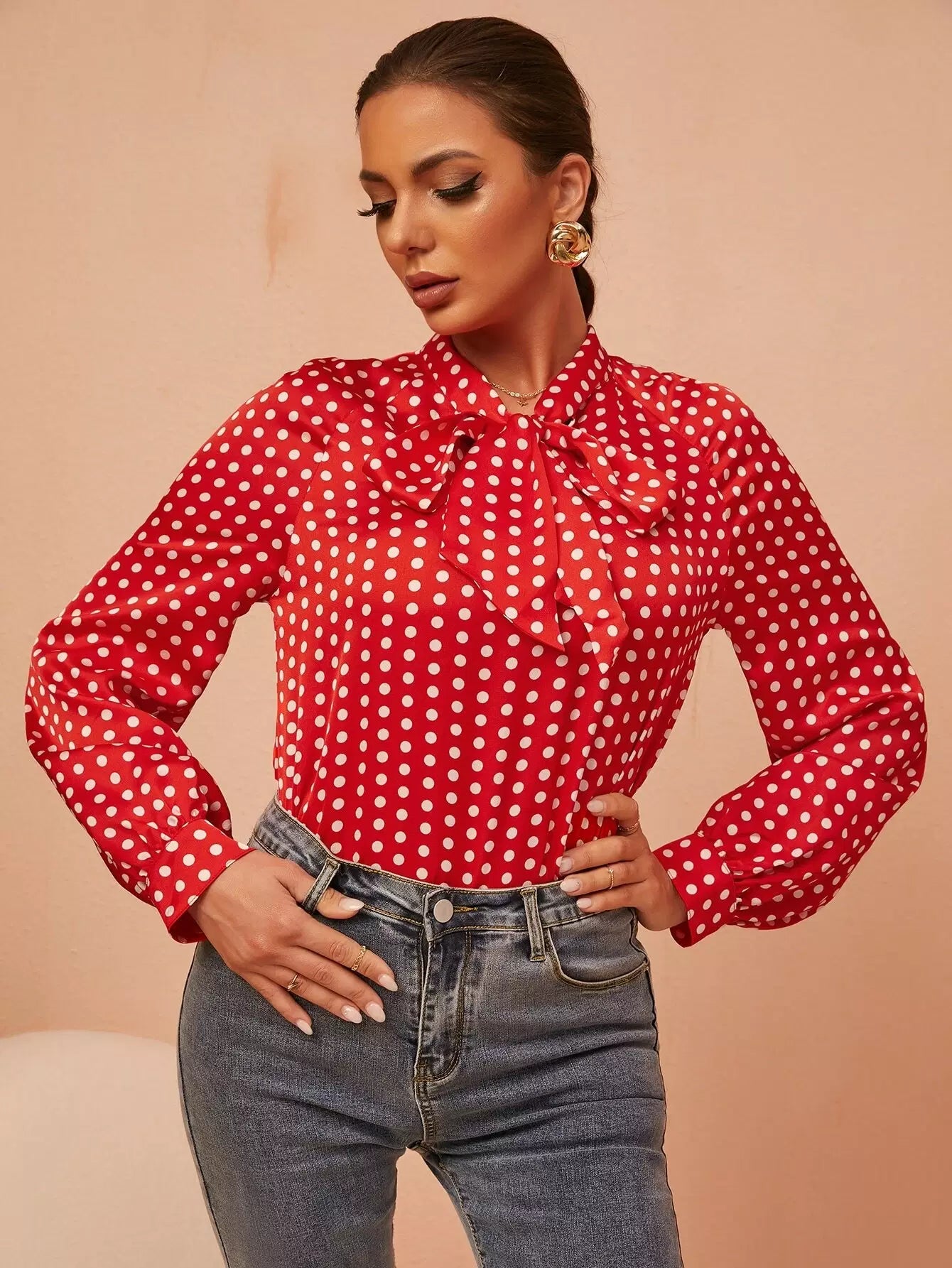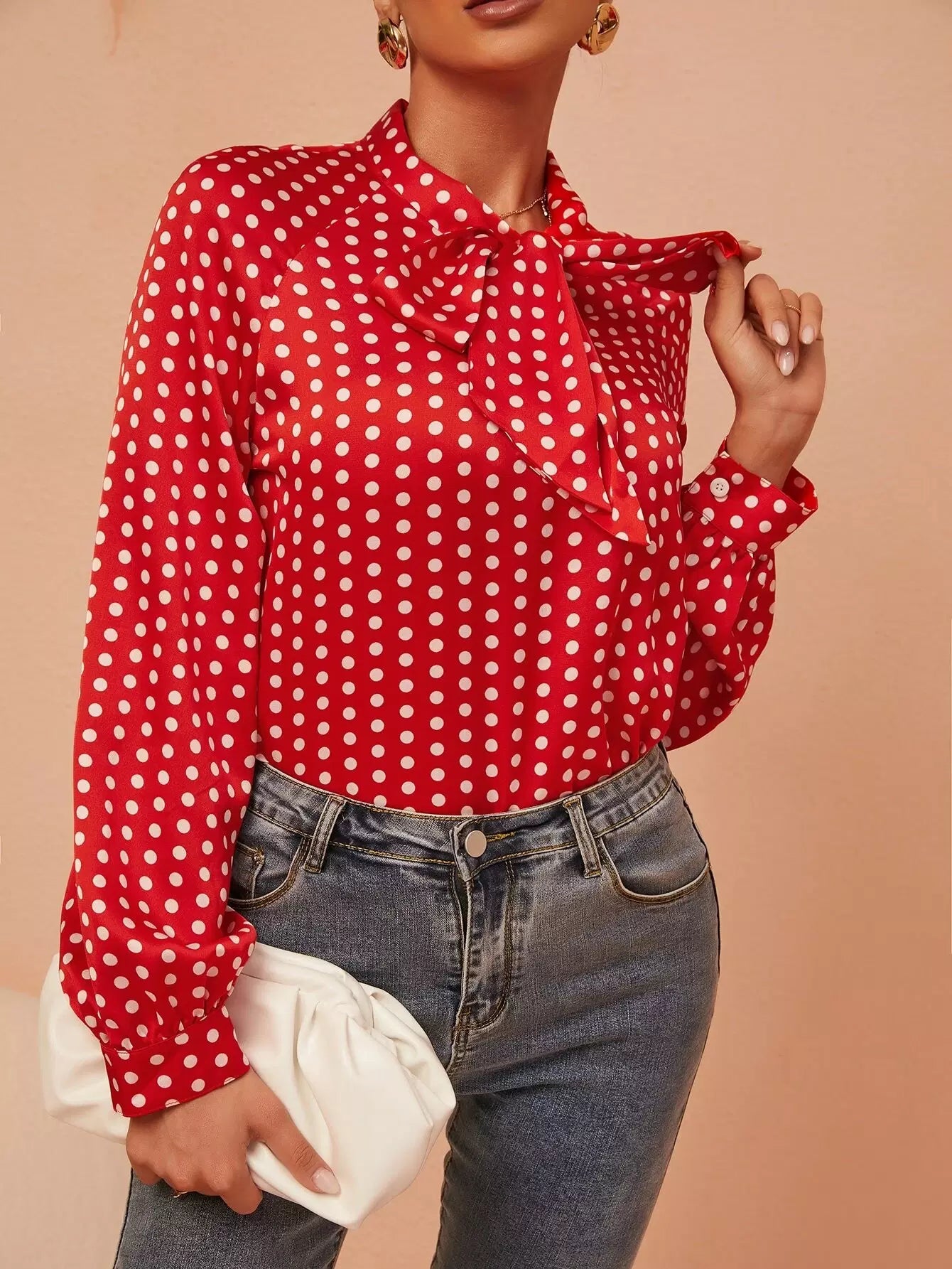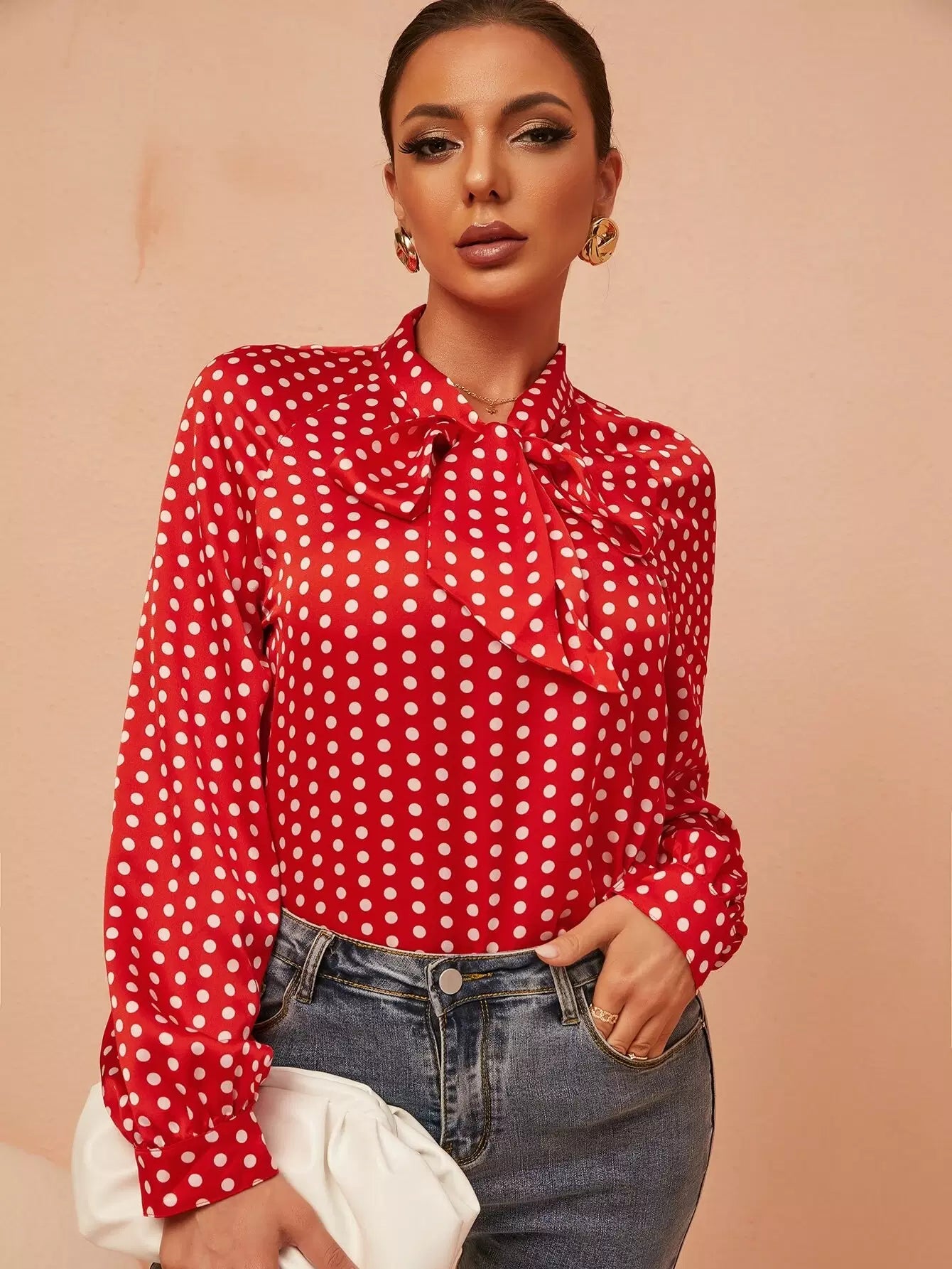 بلوزة برقبة منقطة بطبعة منقطة بربطة عنق عنق منفوشة