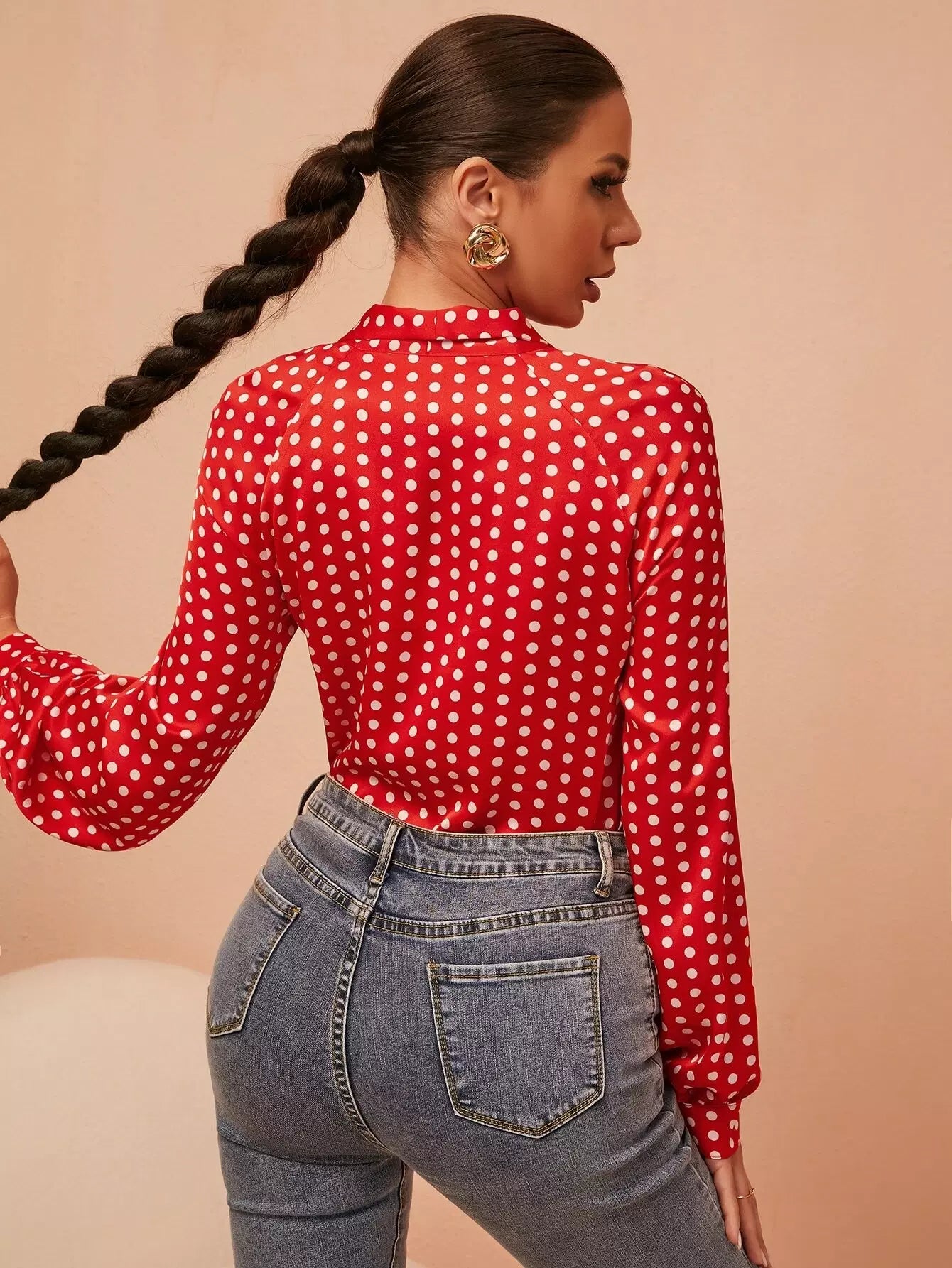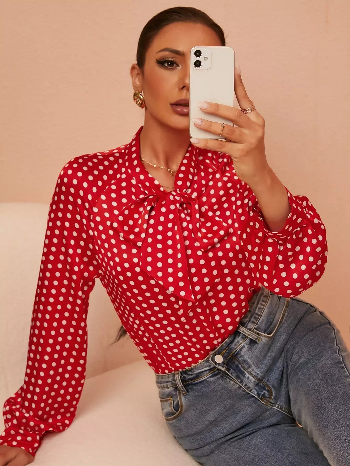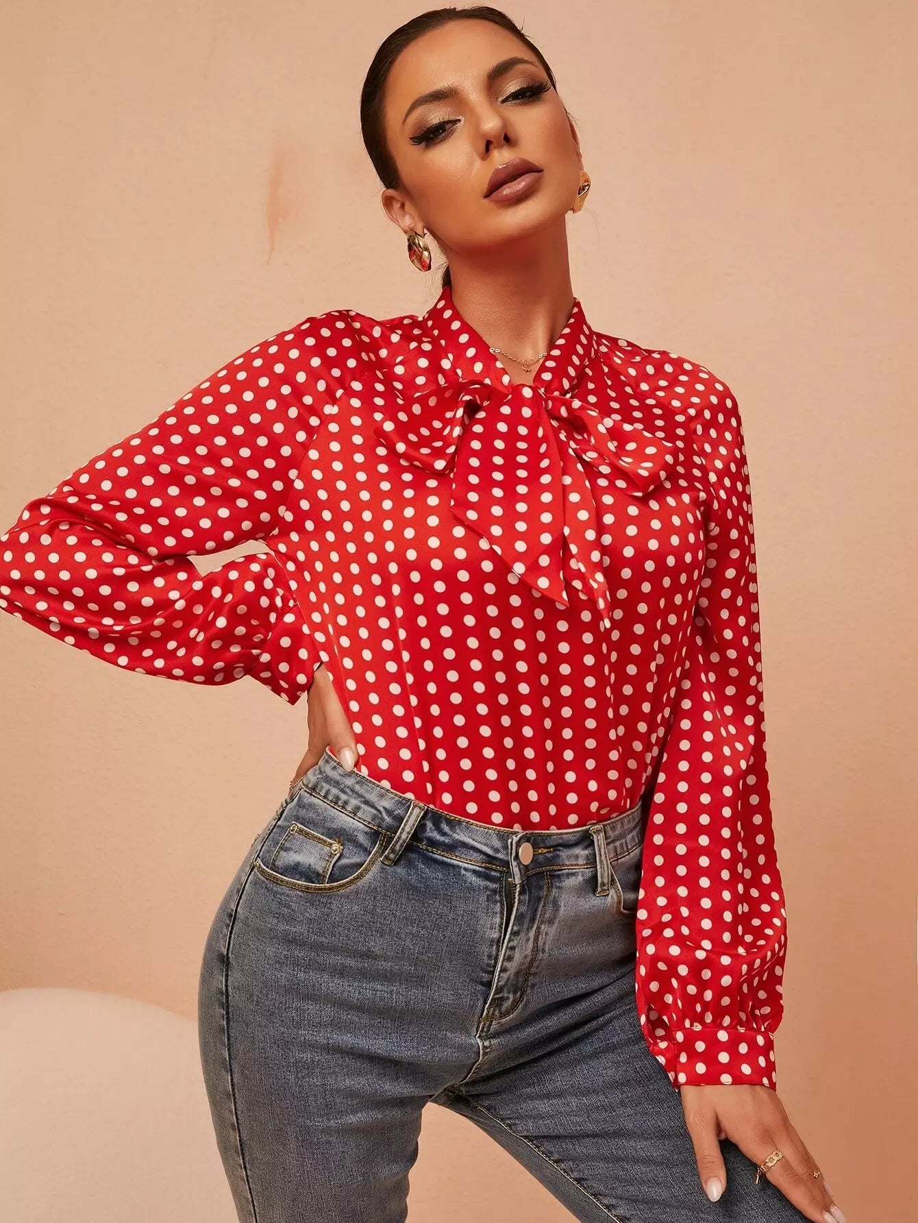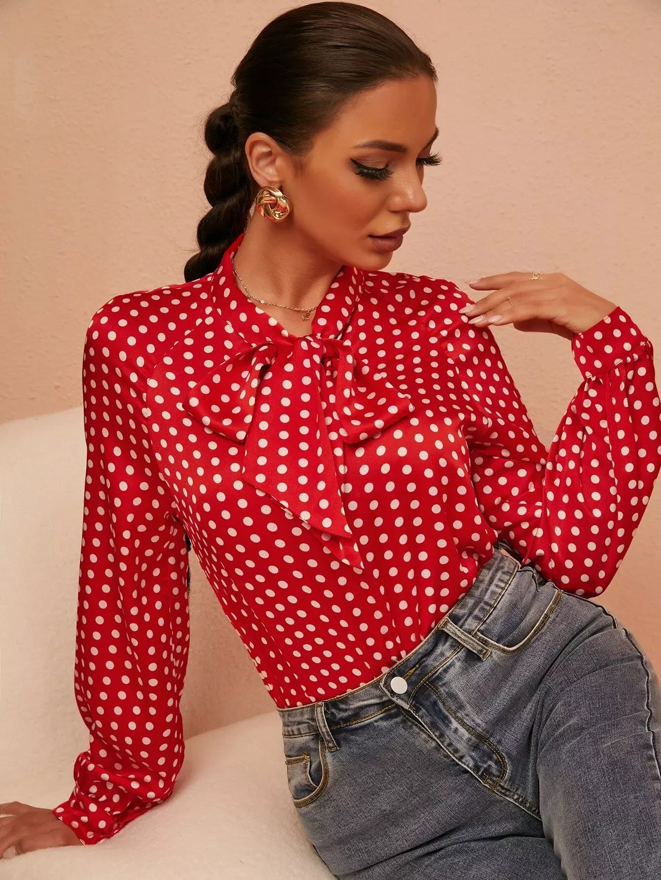 بلوزة برقبة منقطة بطبعة منقطة بربطة عنق عنق منفوشة