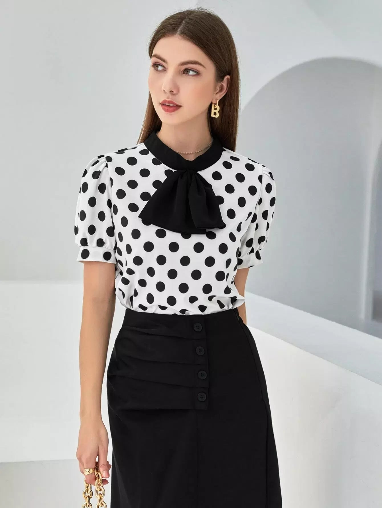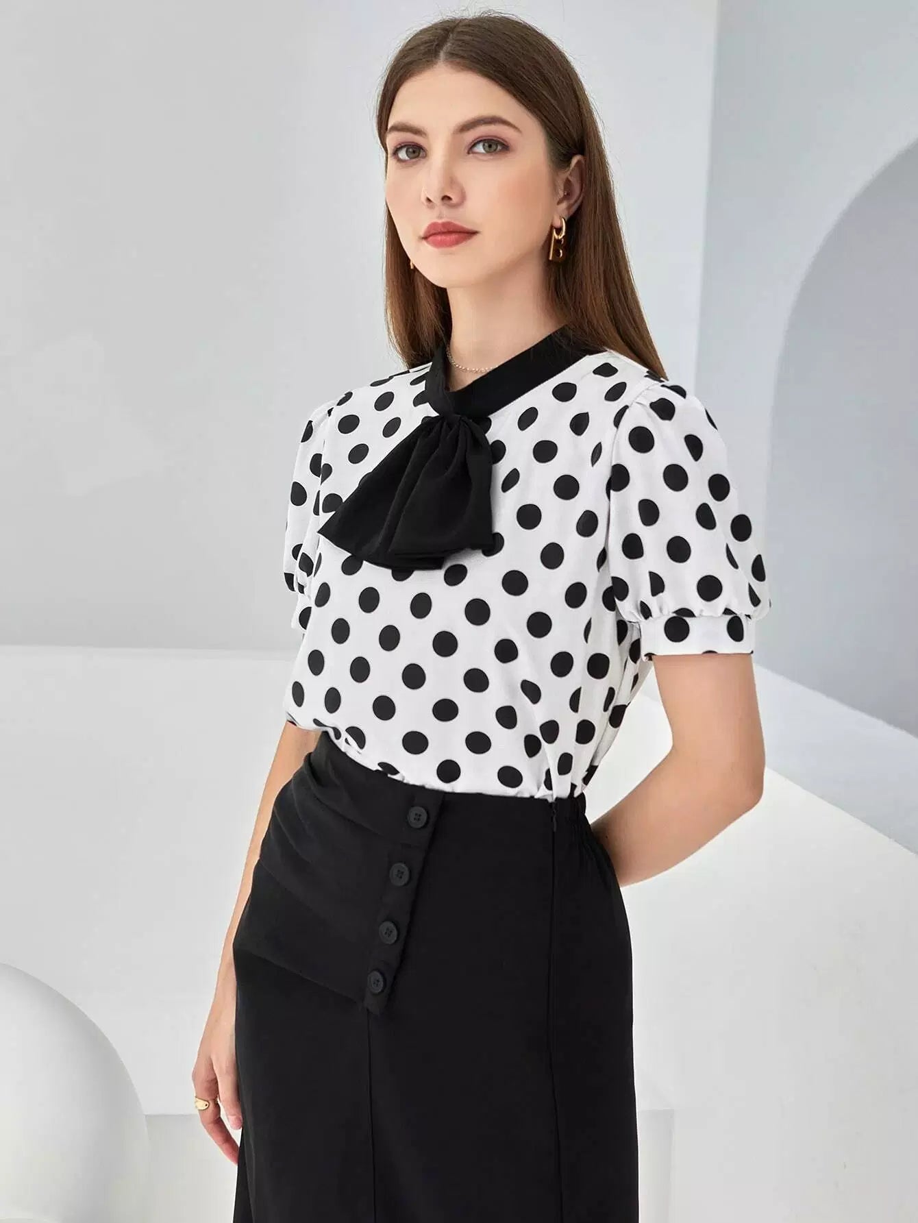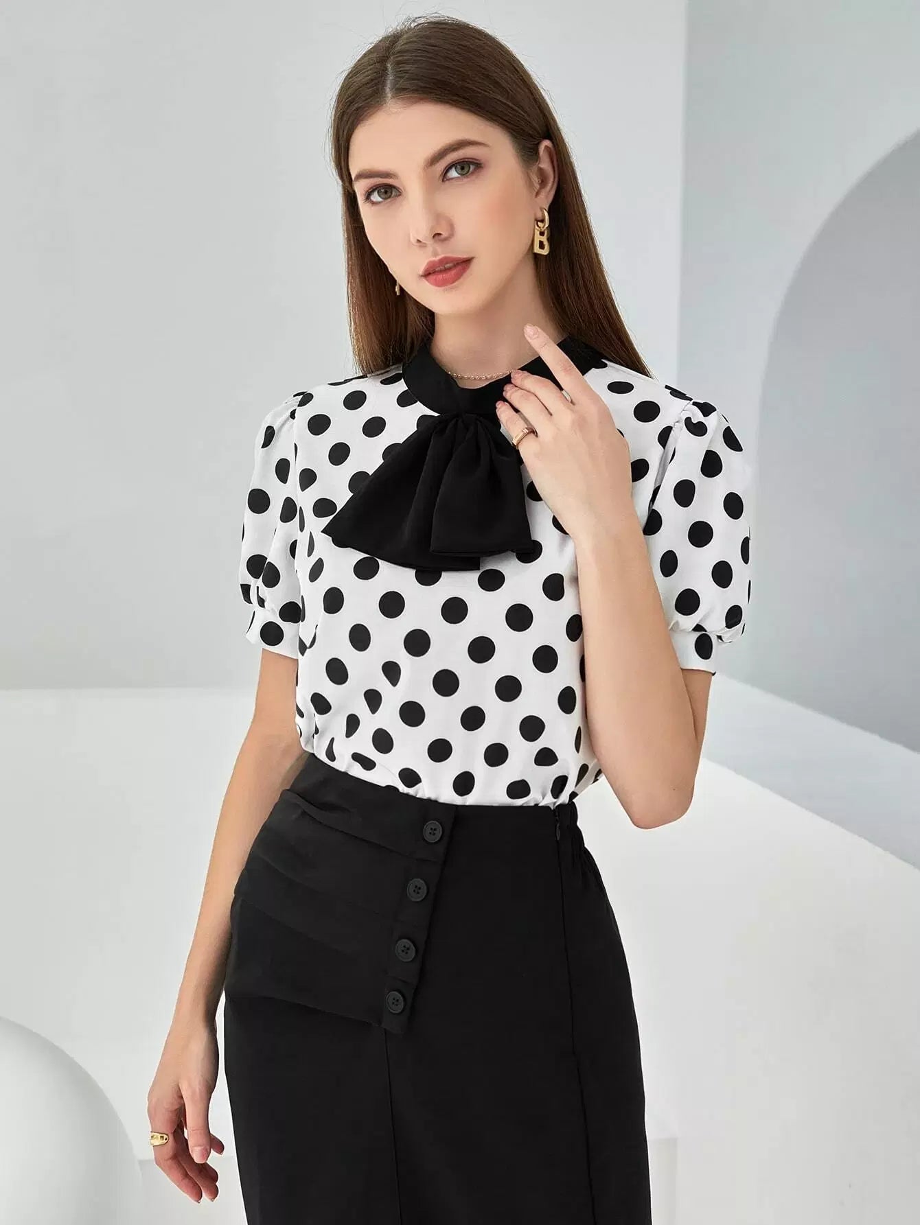 بلوزة منقطة بأكمام منفوخة وربطة أمامية