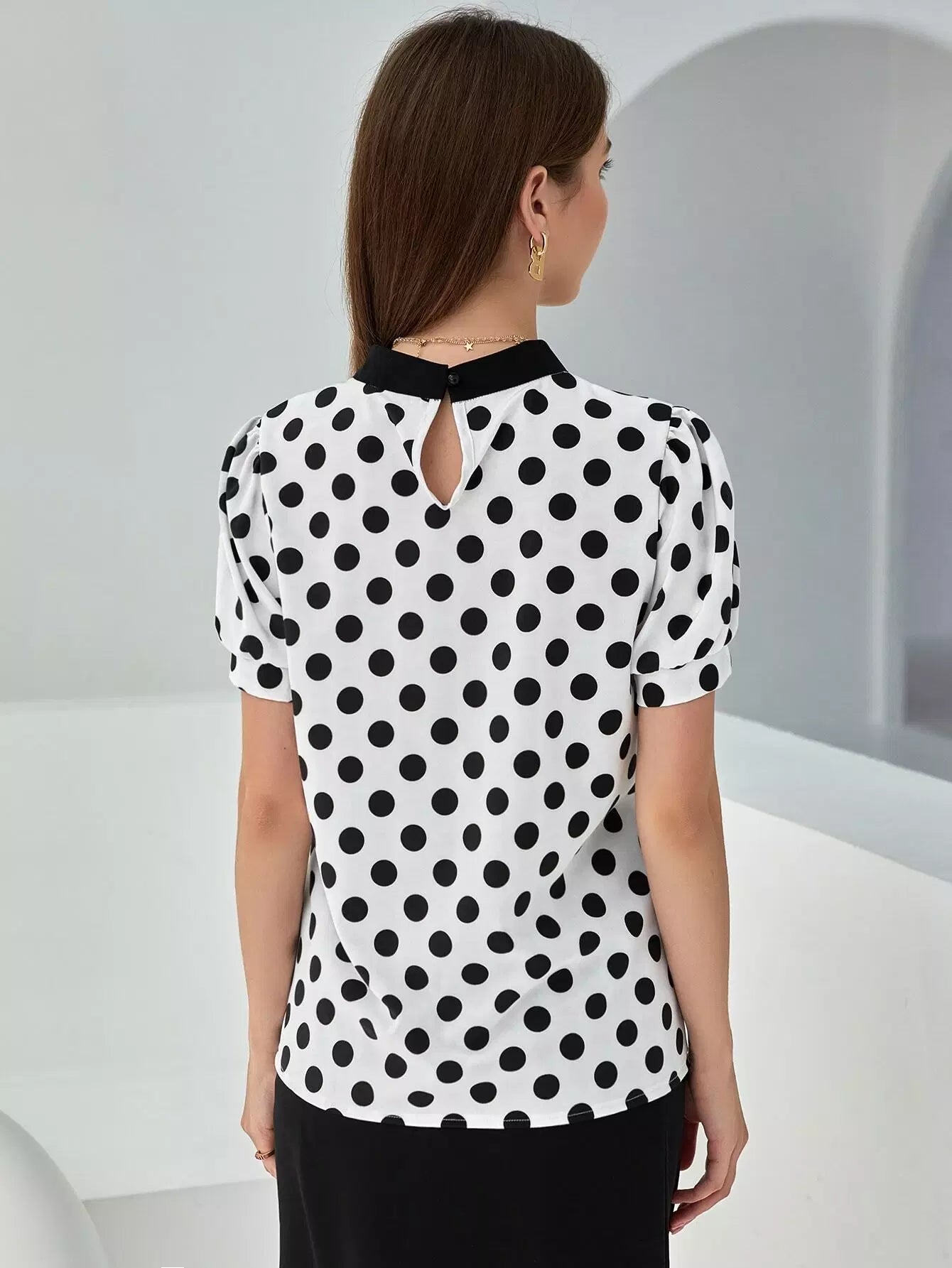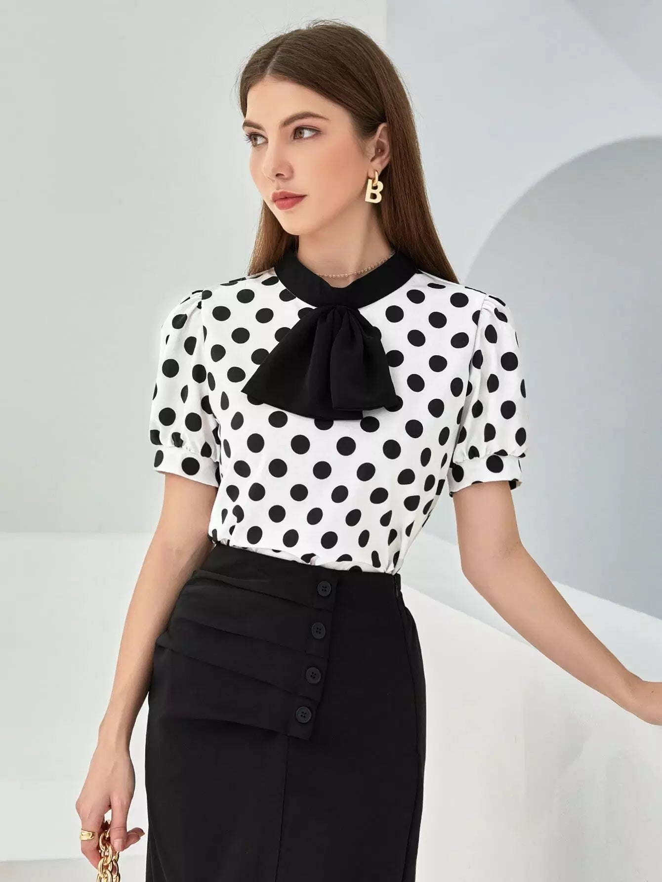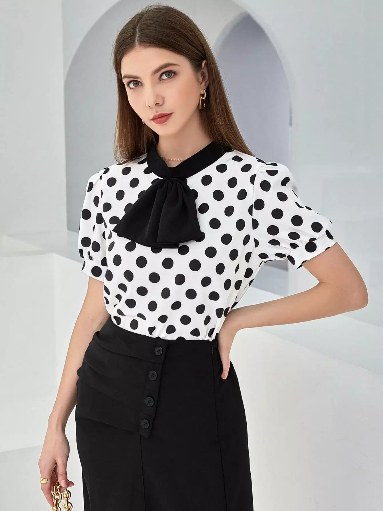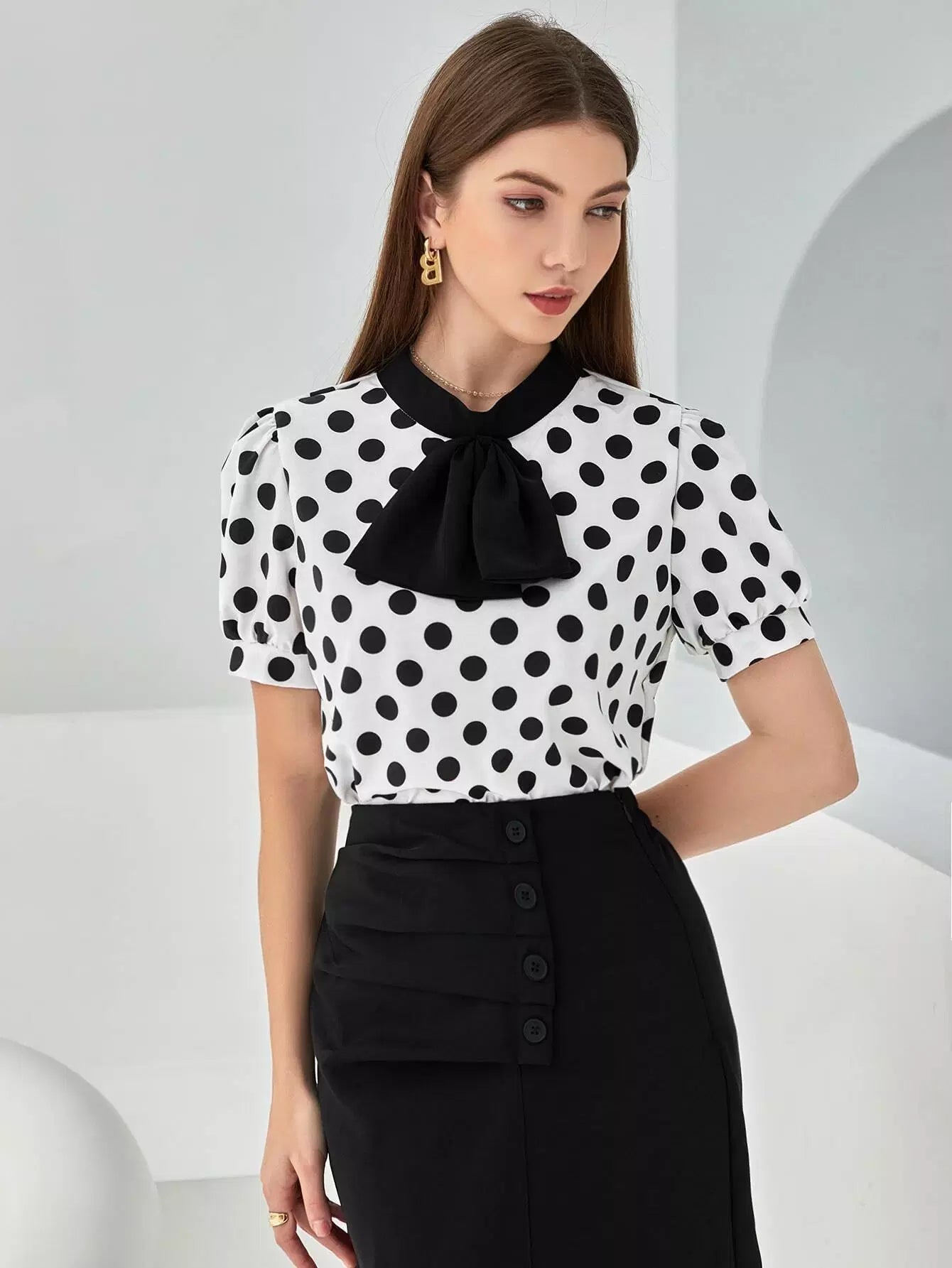 بلوزة منقطة بأكمام منفوخة وربطة أمامية