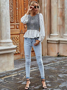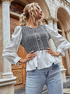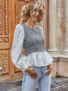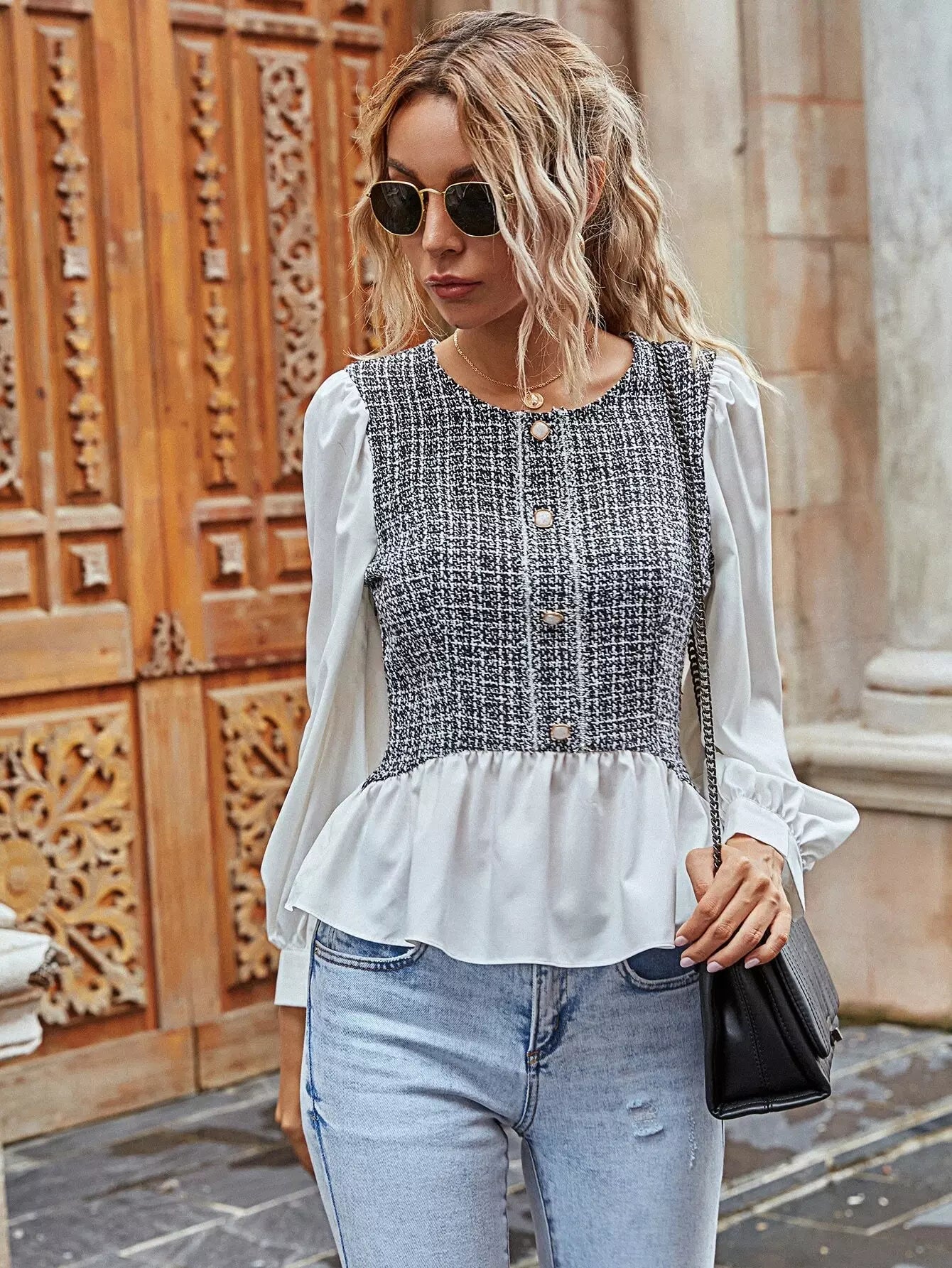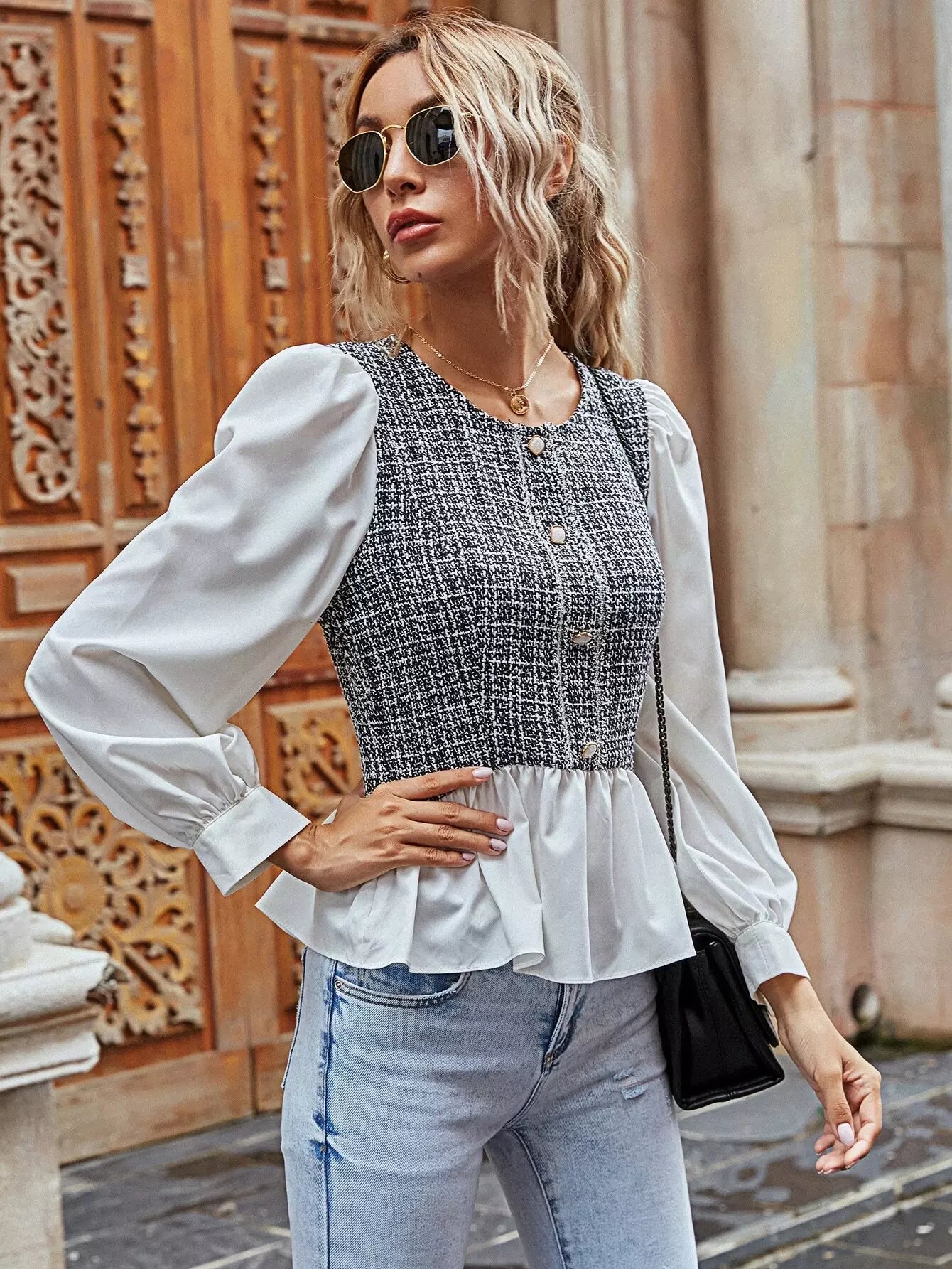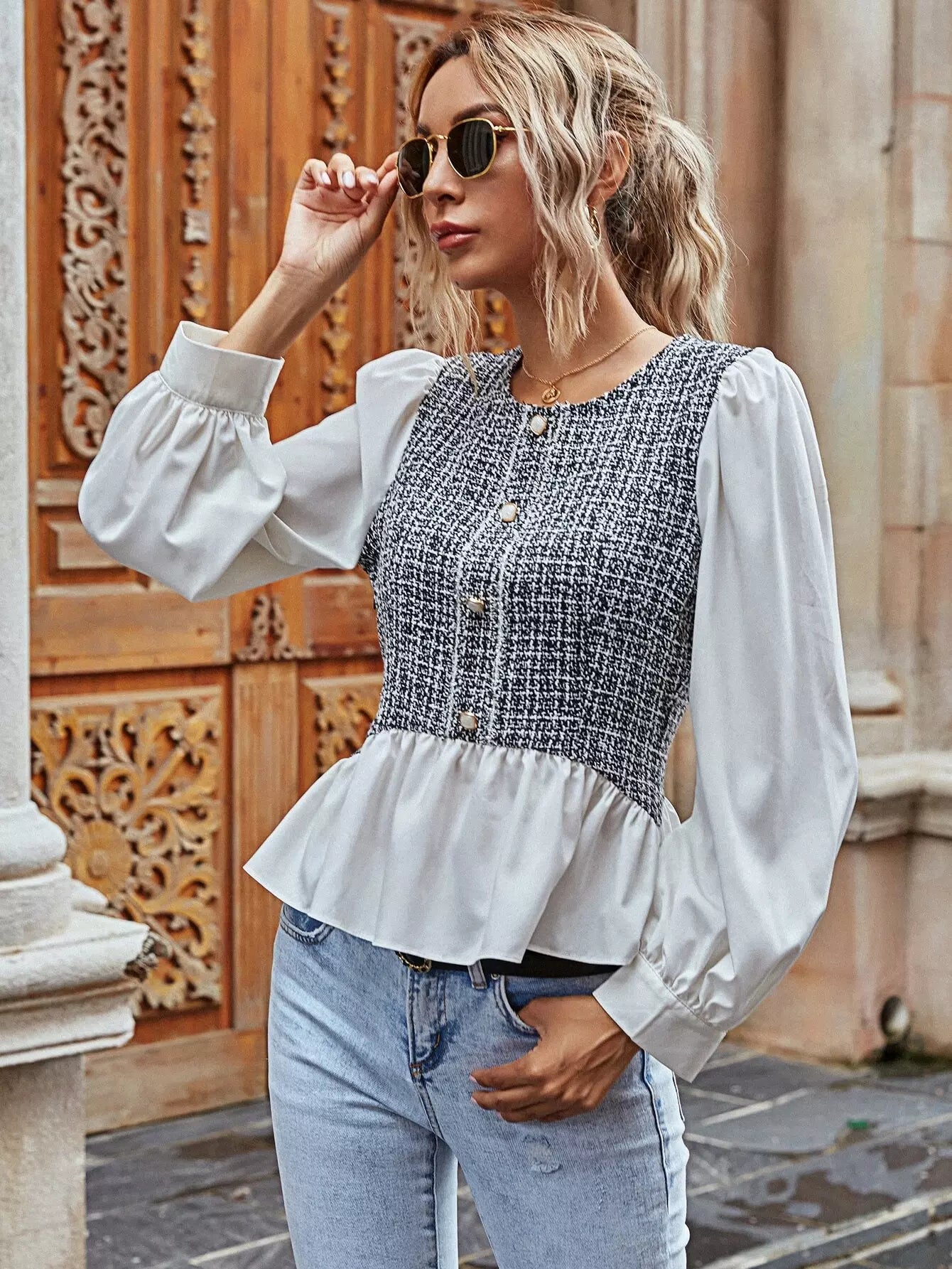 للنساء - بلوزة بيبلوم مقسمة بأكمام منتفخة وأزرار أمامية