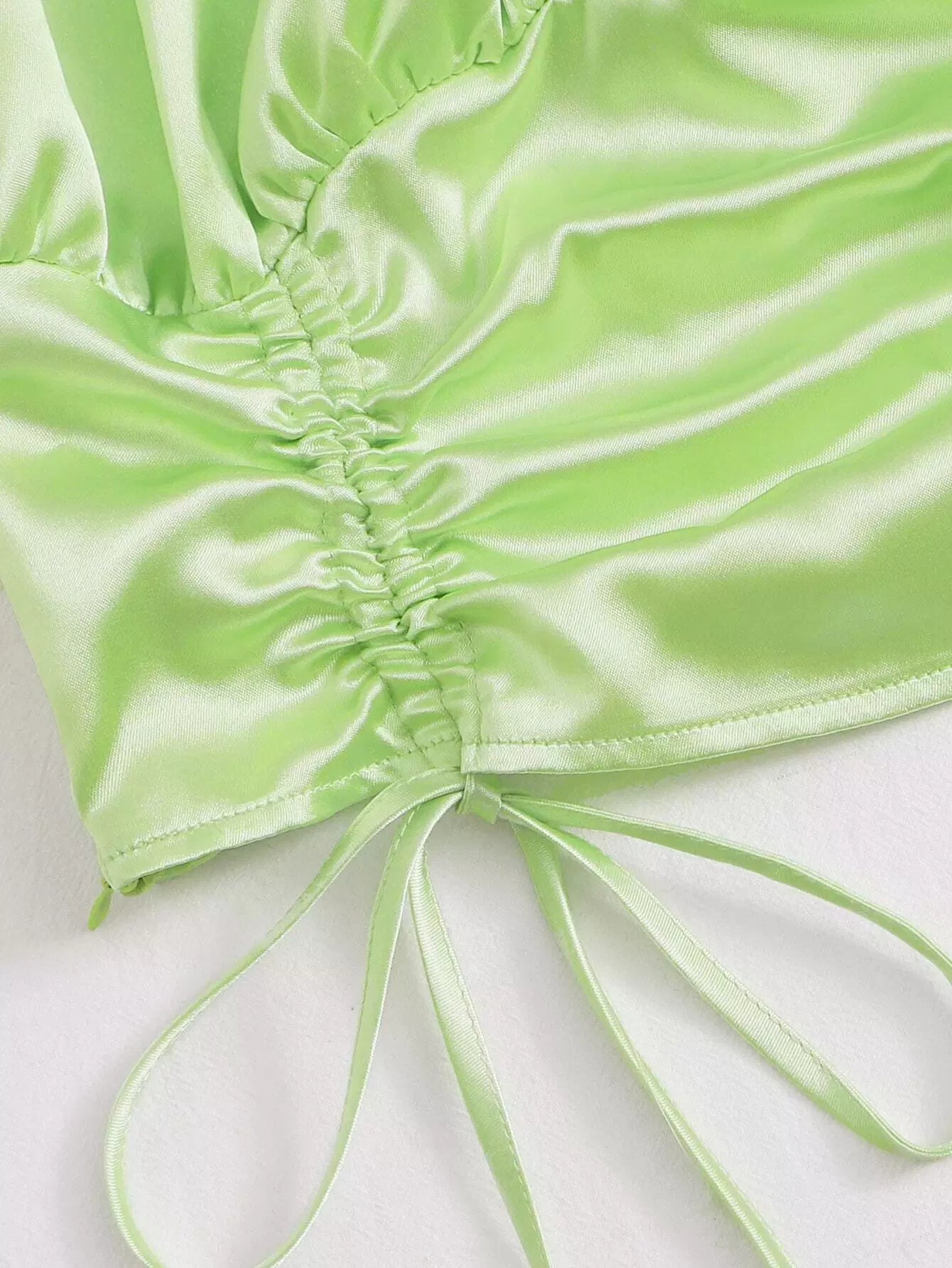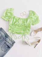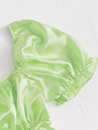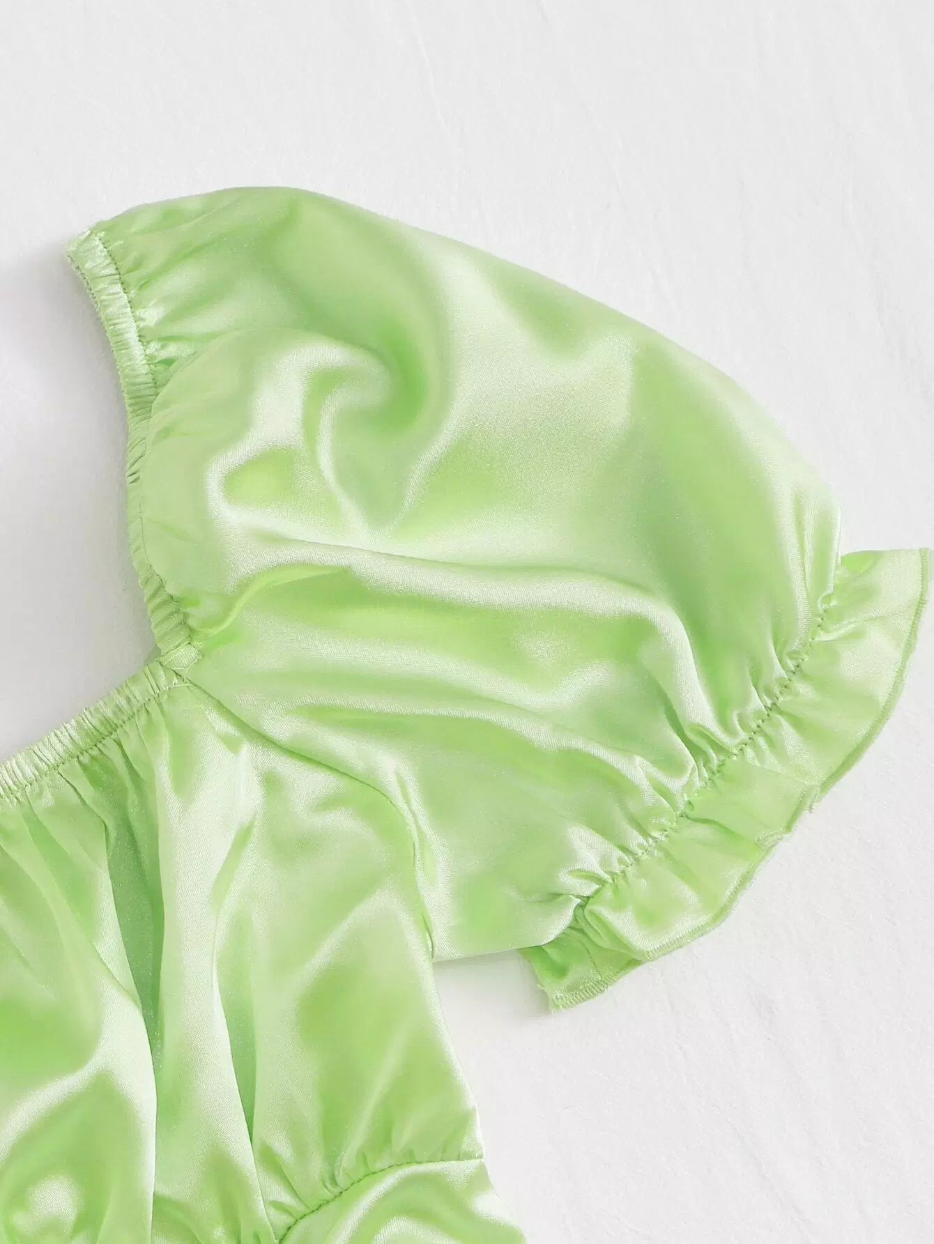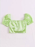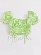 بلوزة من الساتان بأكمام منفوخة وحاشية برباط وصدرية مكشكشة