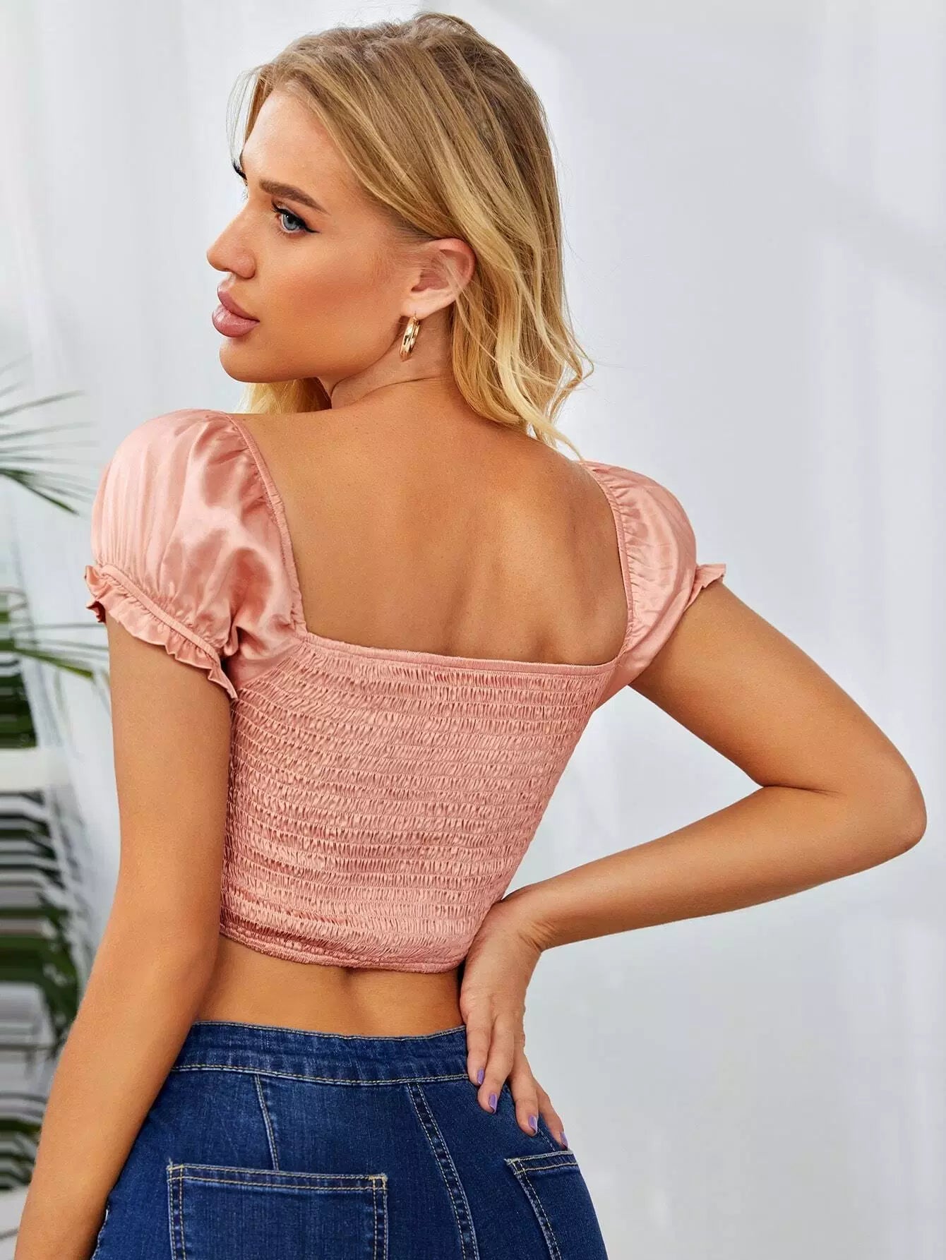 بلوزة بأكمام منفوخة بأكمام منفوشة من الساتان بحافة غير متماثلة من الساتان
