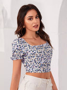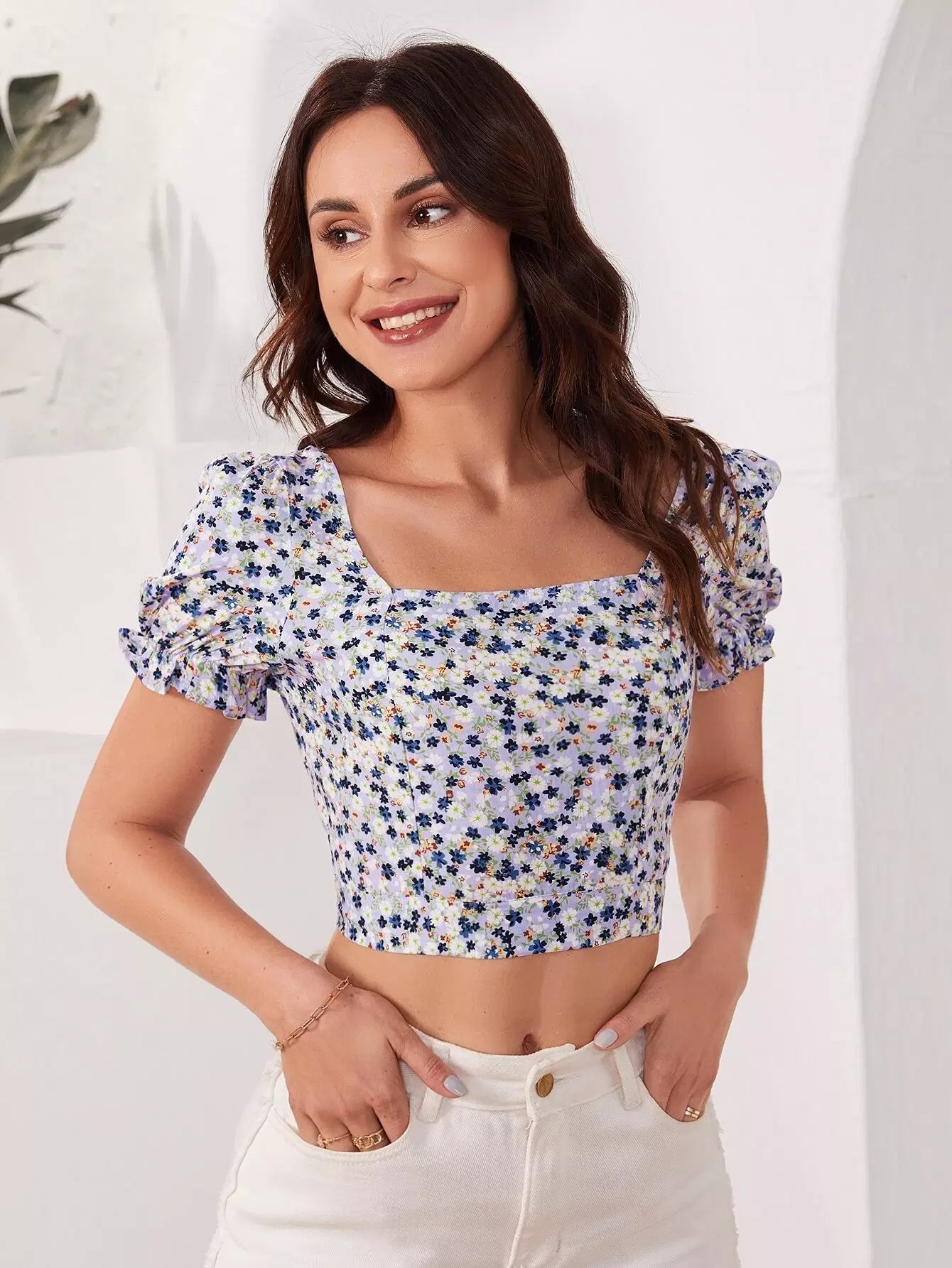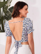 توب بأكمام منفوشة بربطة عنق بدون أكمام منسدلة من الخلف مزين بالزهور