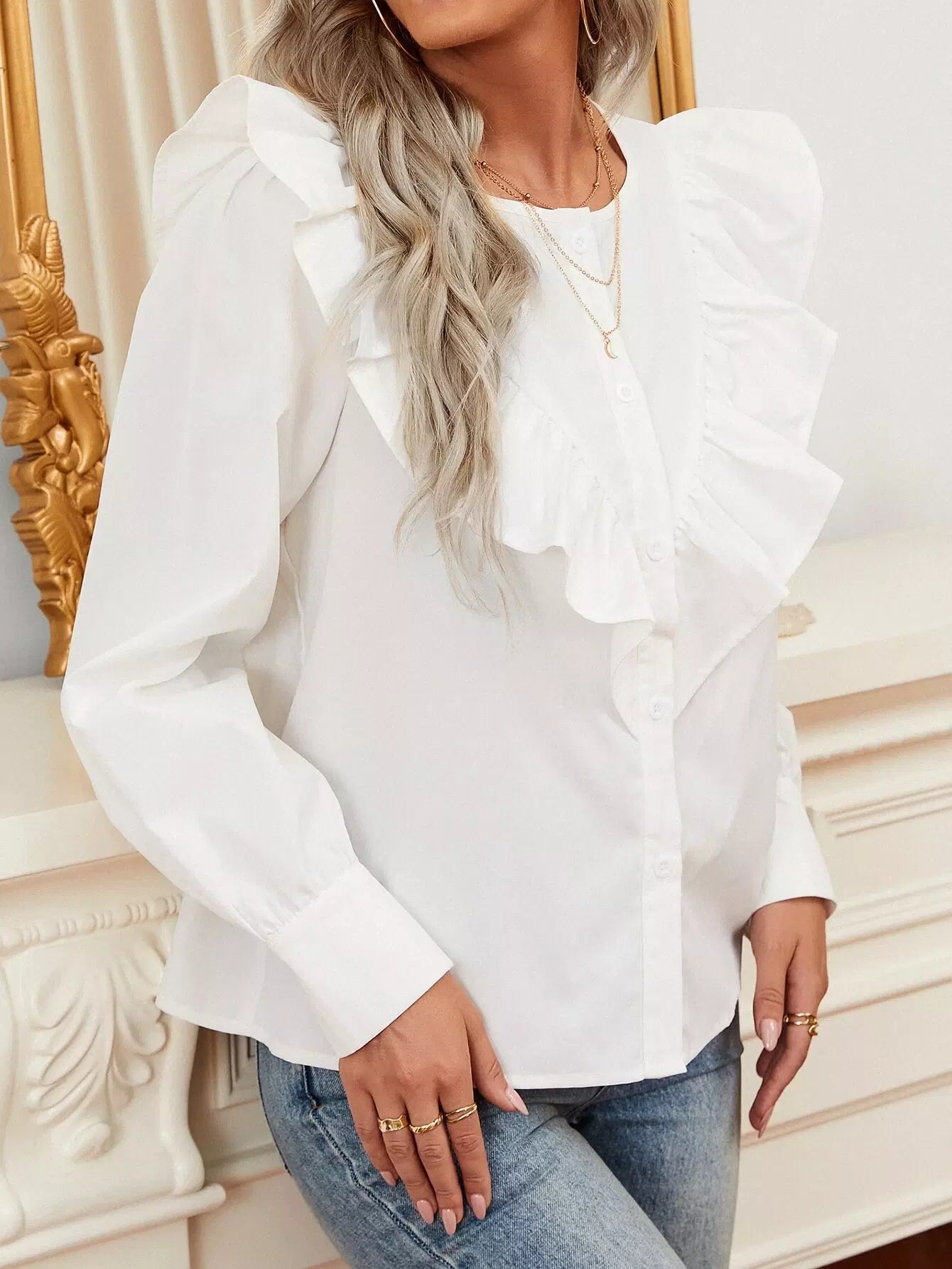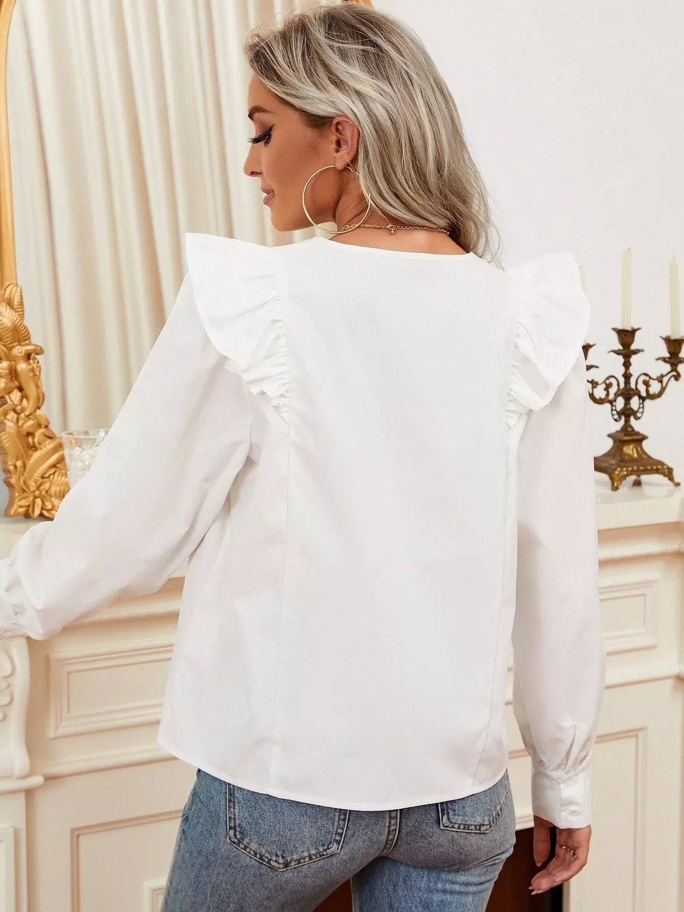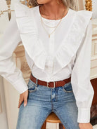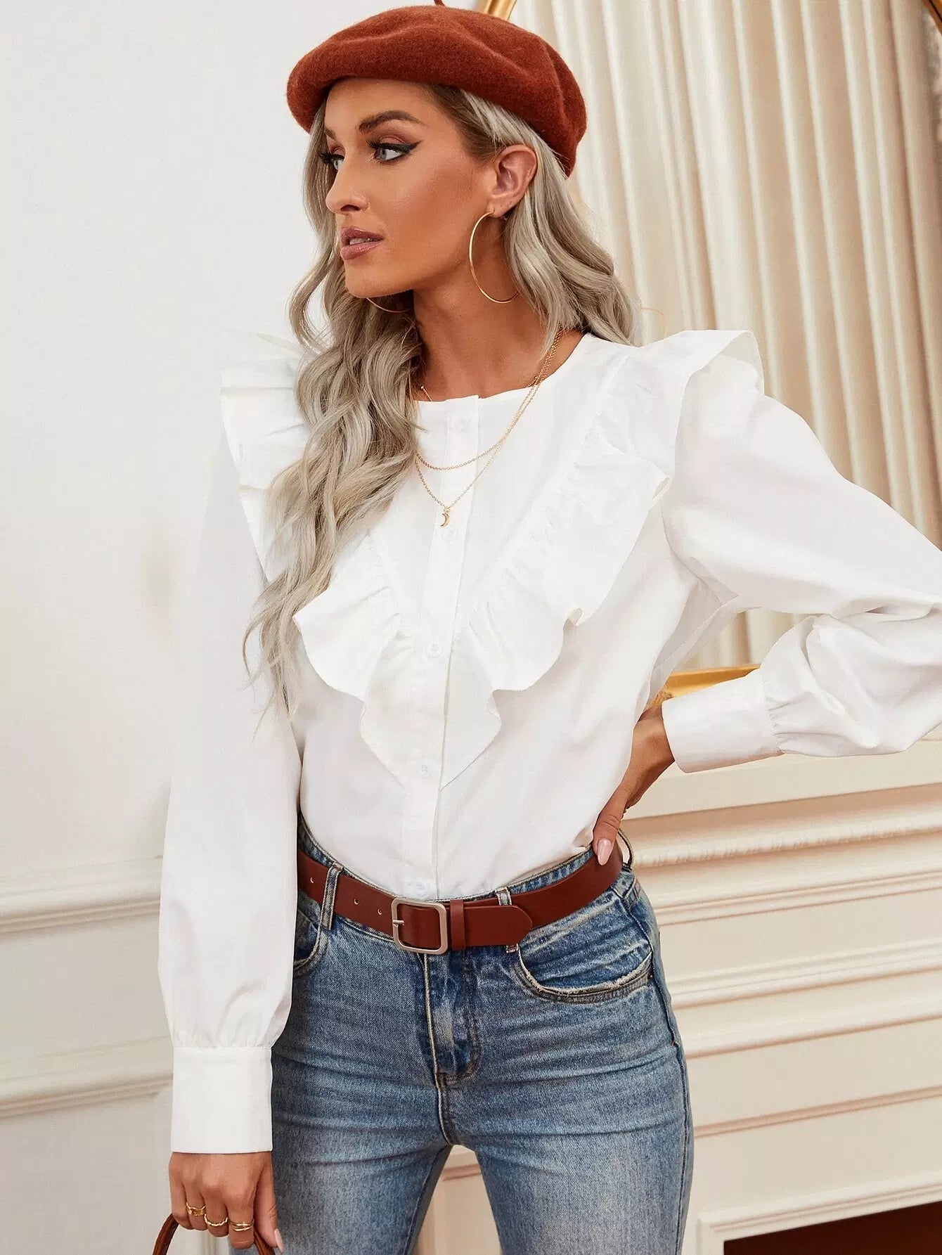 بلوزة بحواف مكشكشة بأزرار أمامية مكشكشة