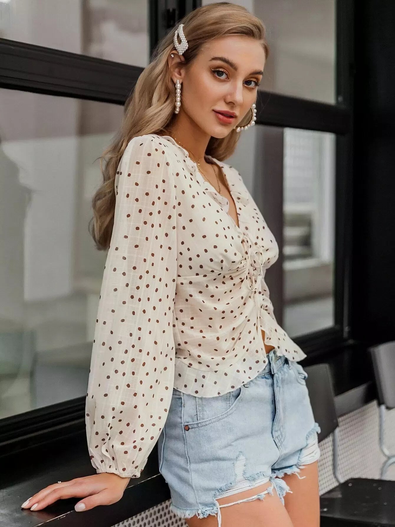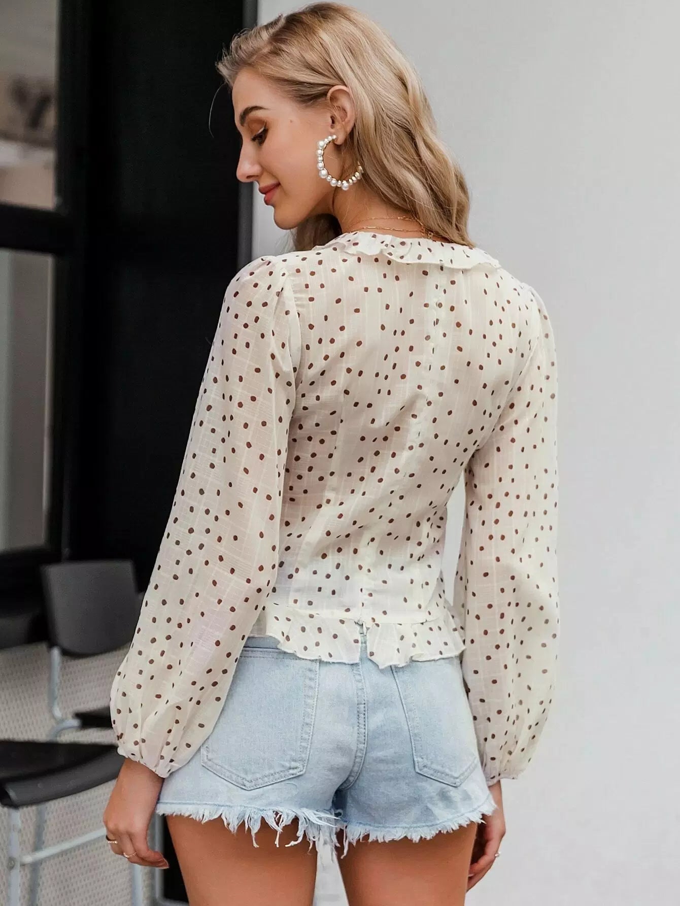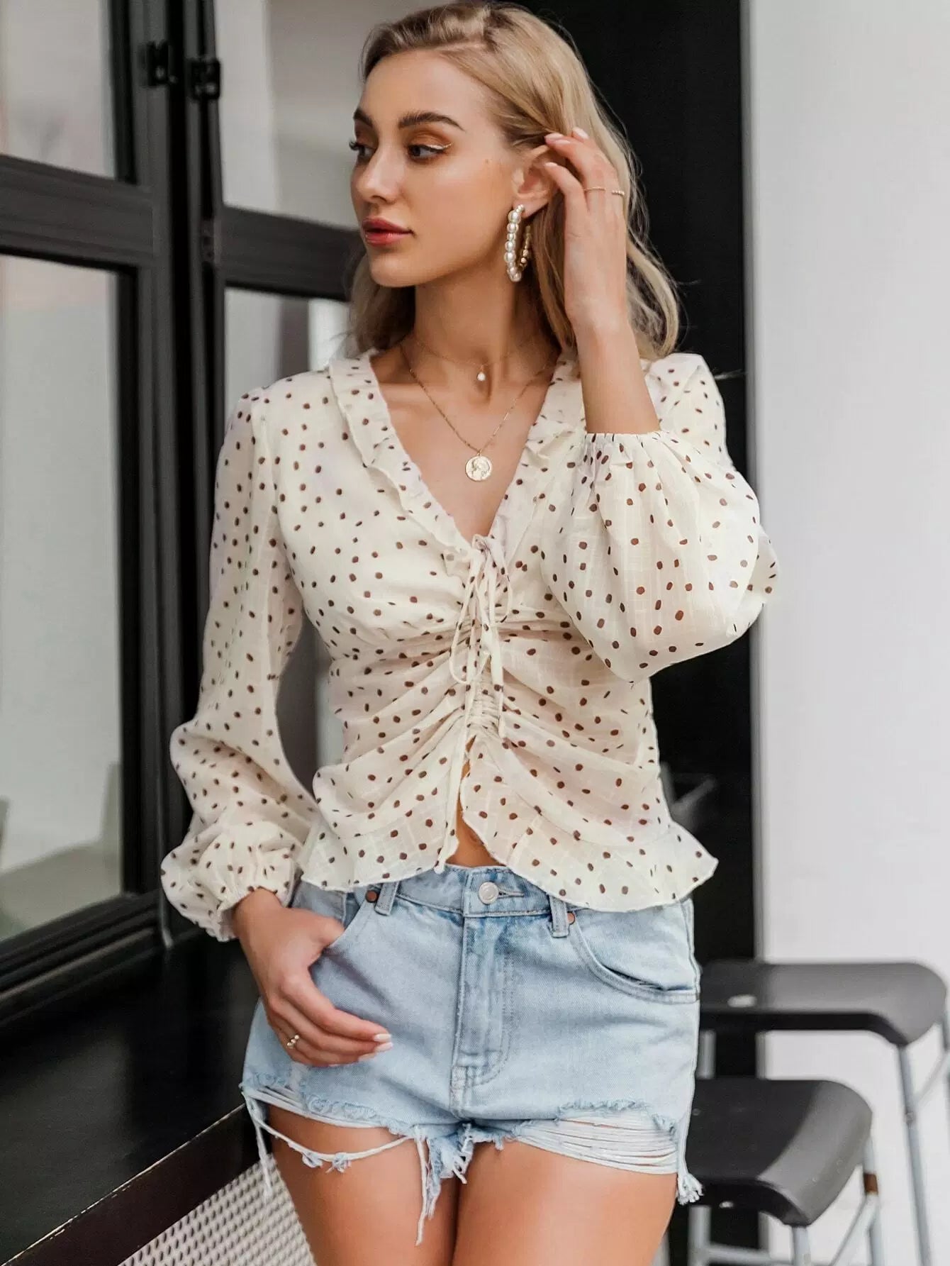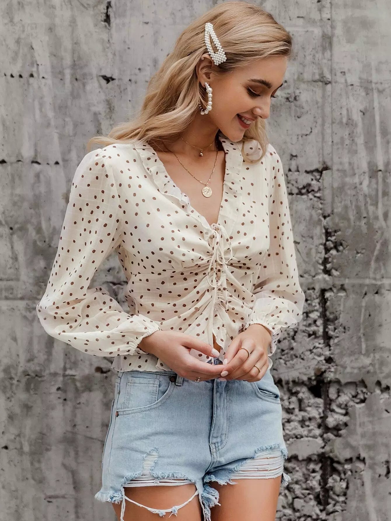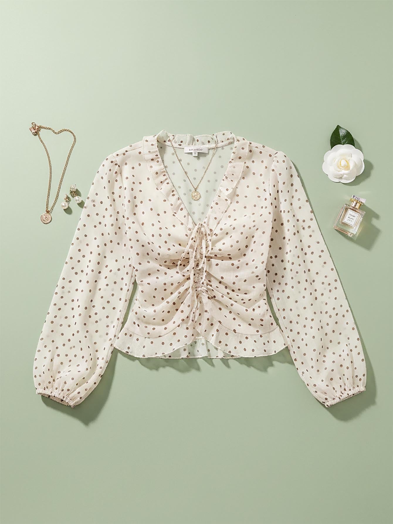 بلوزة منقّطة مكشكشة بأربطة مكشكشة ذات حواف كشكش